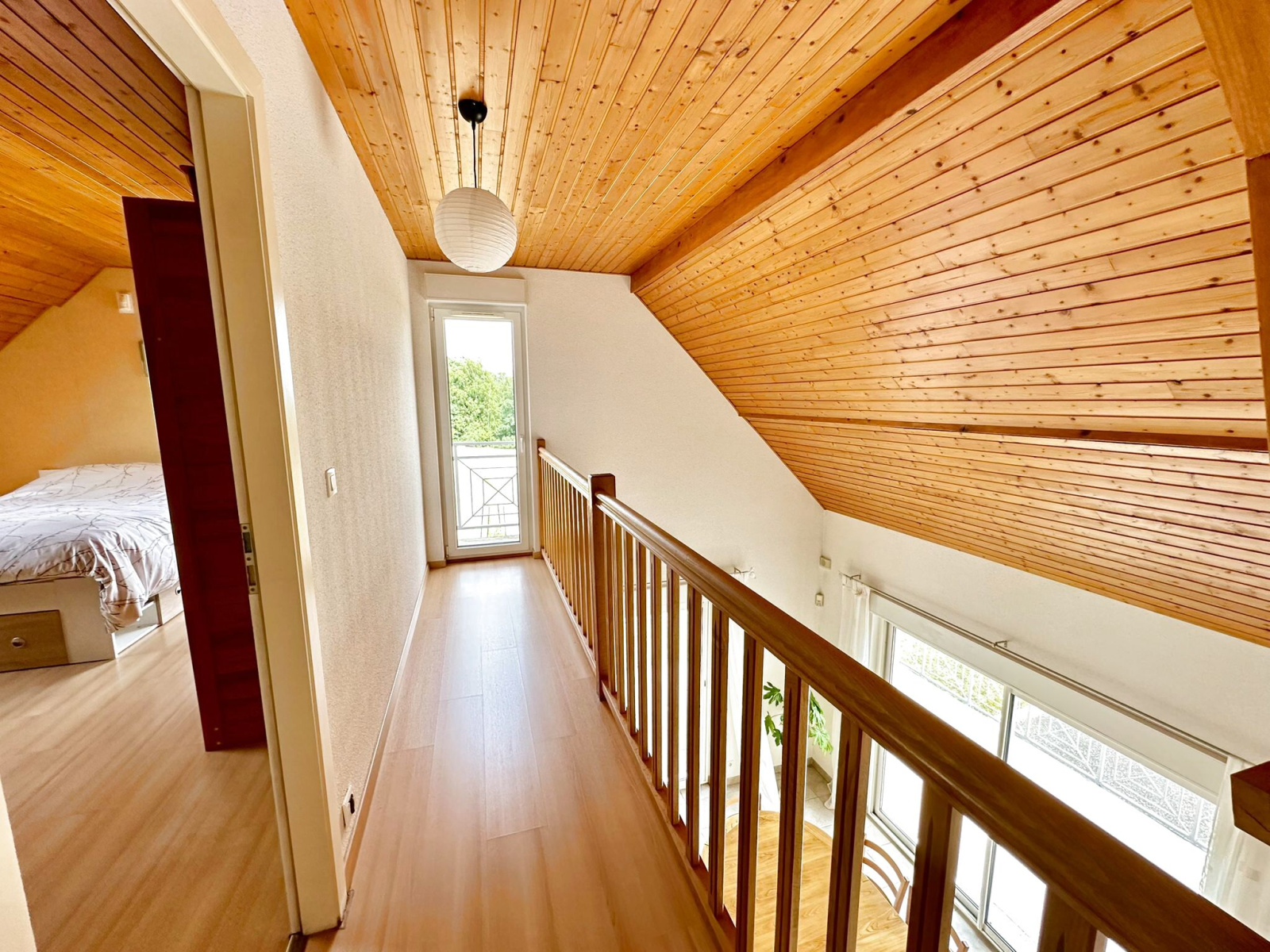A l'étage : mezzanine avec accès balcon, 2 chambres mansardées (13 et 20 m2 env) avec placard, salle de bains, dresssing, w.c.