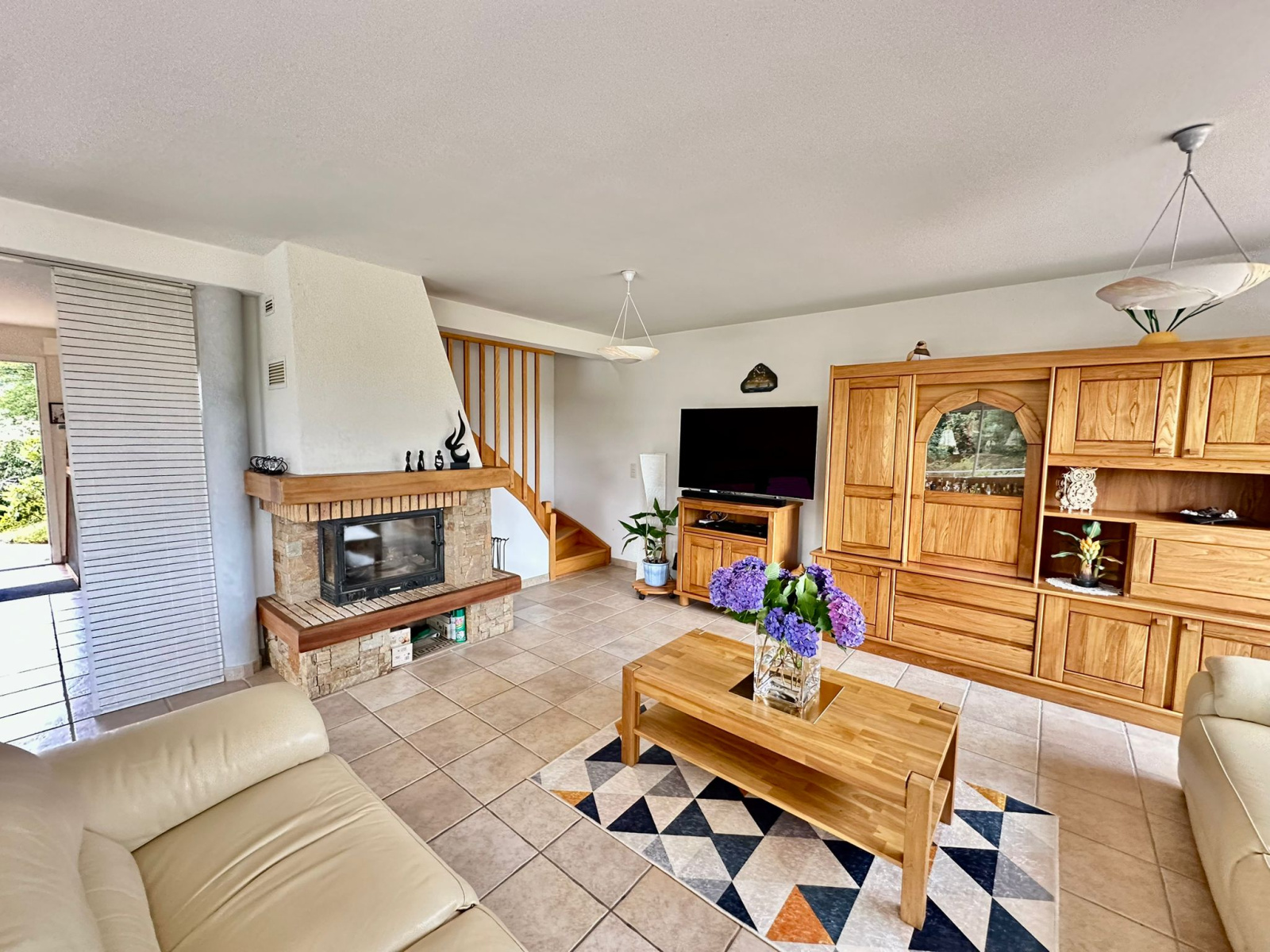 Au rez-de-chaussée : hall avec placard, salon/séjour (41 m1 env) avec cheminée insert et accès sur une grande terrasse, cuisine équipée avec coin repas(20 m2 env), une chambre avec placard (arrivée d'eau pour installer douche ou lavabo), w.c.