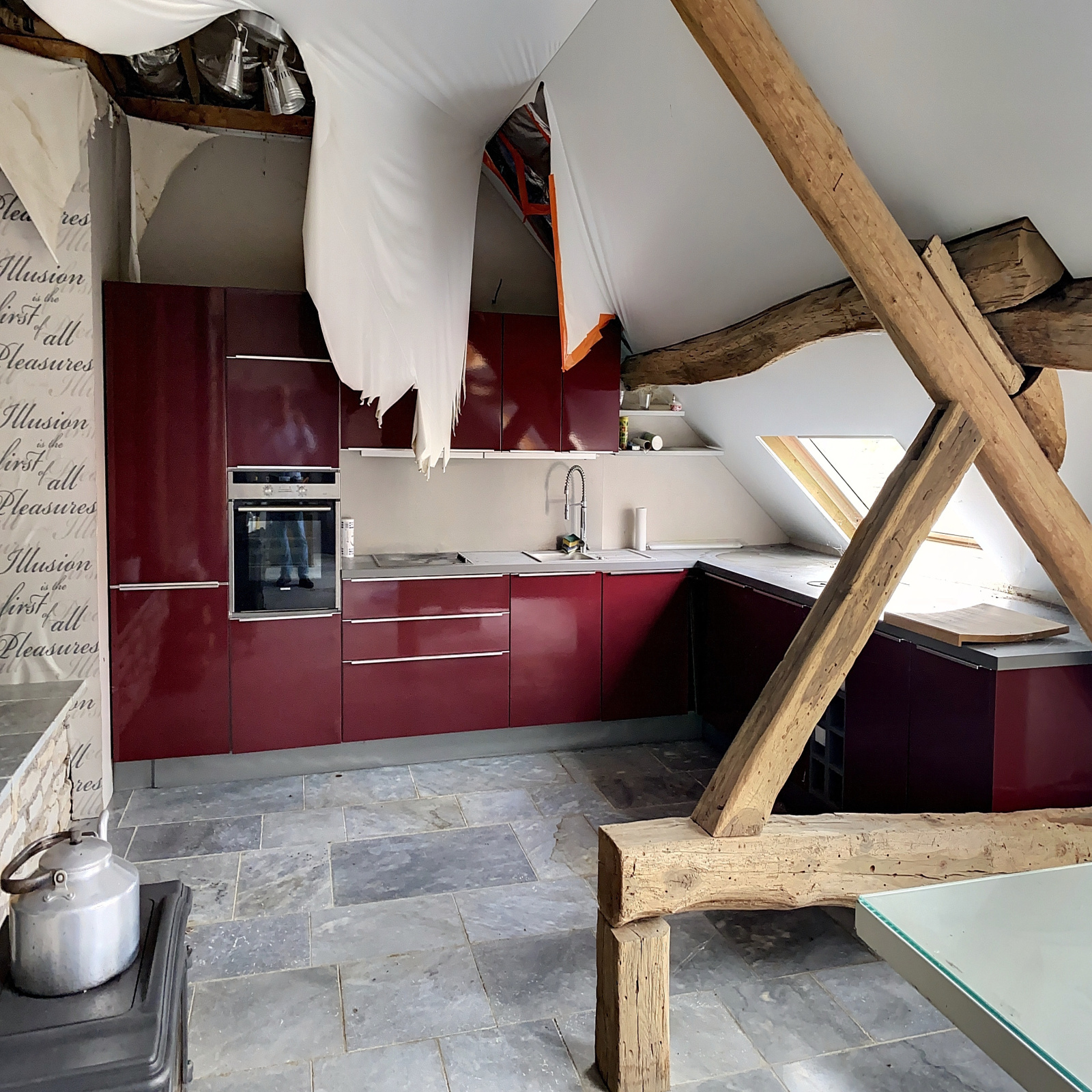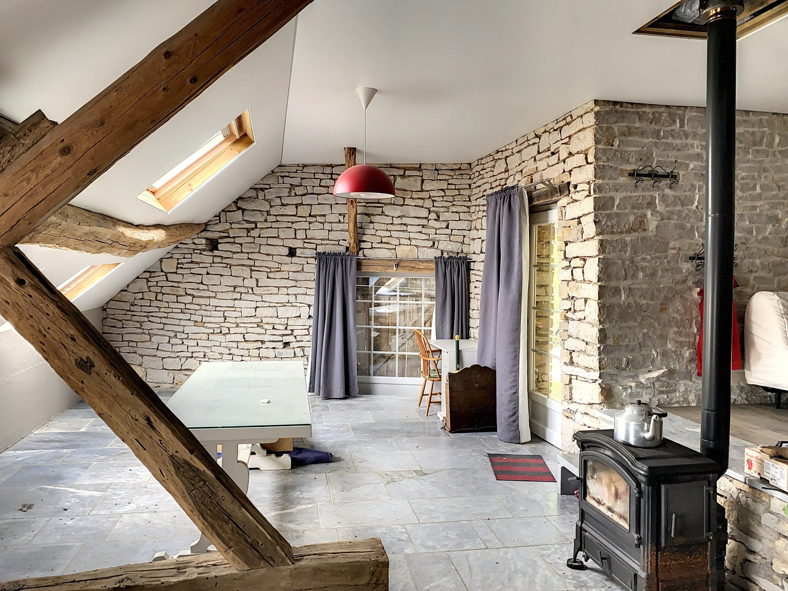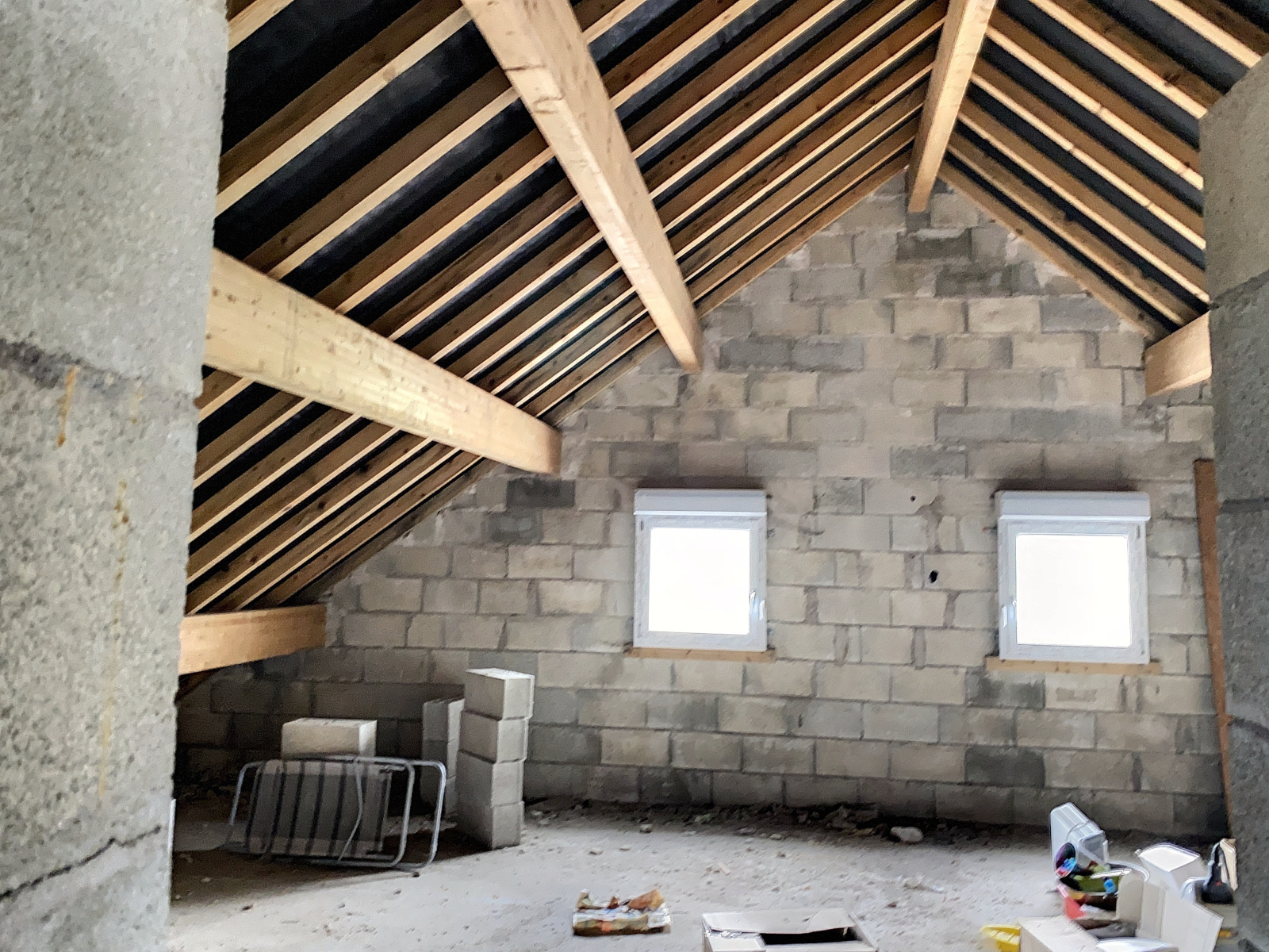 Au rez-de-chaussée : cuisine équipée ouverte sur salle à manger / salon (grande pièce ouverte), une pièce à finir, accès terrasse.