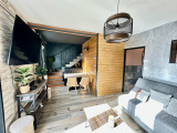 Au rez-de-chaussée : cuisine équipée (9 m2 env), dégagement (4 m2 env), séjour (19 m2 env) avec poêle à pellets.