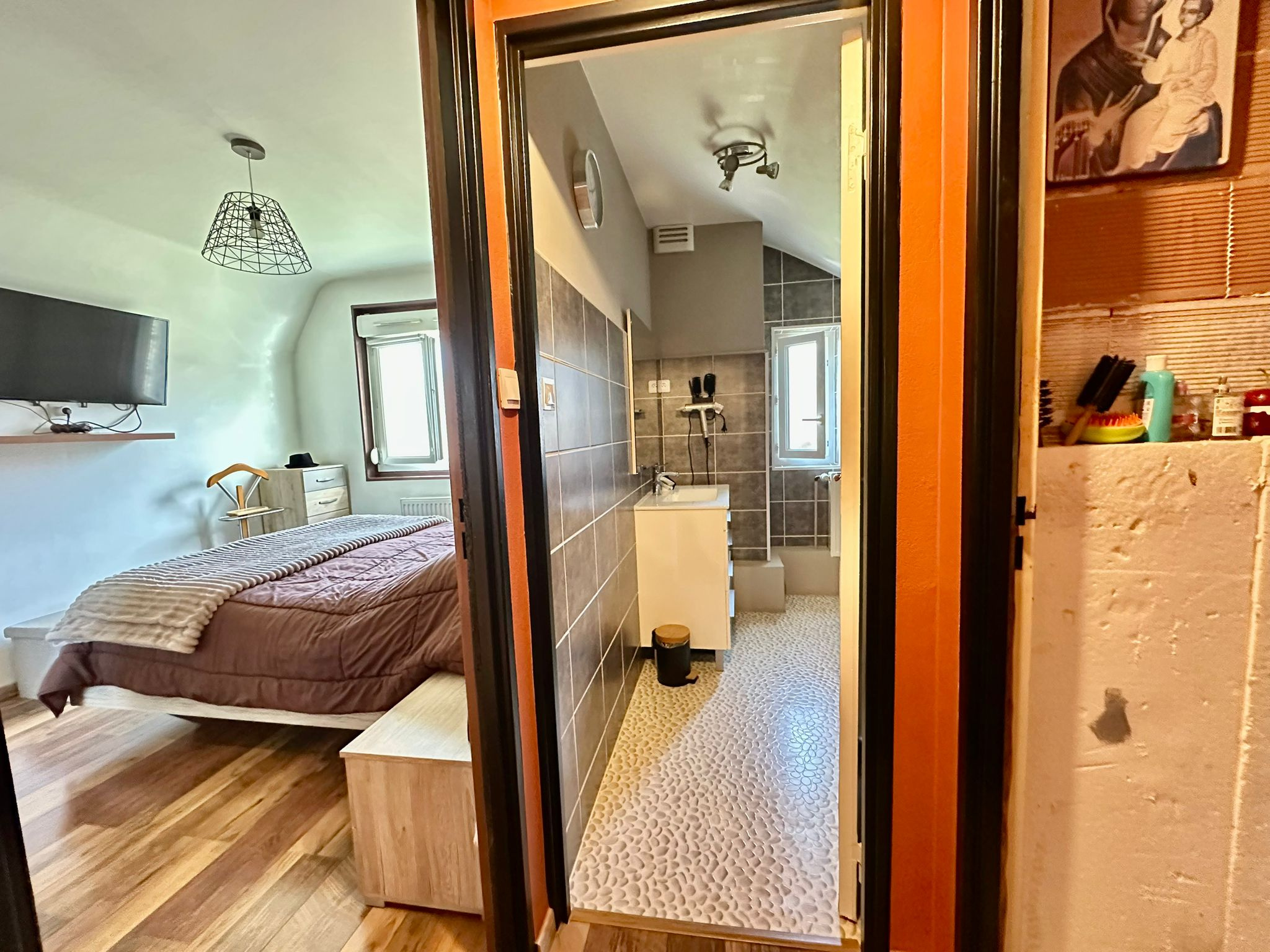 A l'étage : dégagement (5 m2 env), 3 chambres (9, 10 et 11 m2 env), salle d'eau (4 m2 env), w.c., rangement