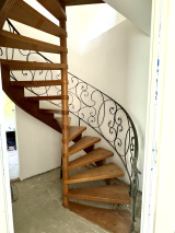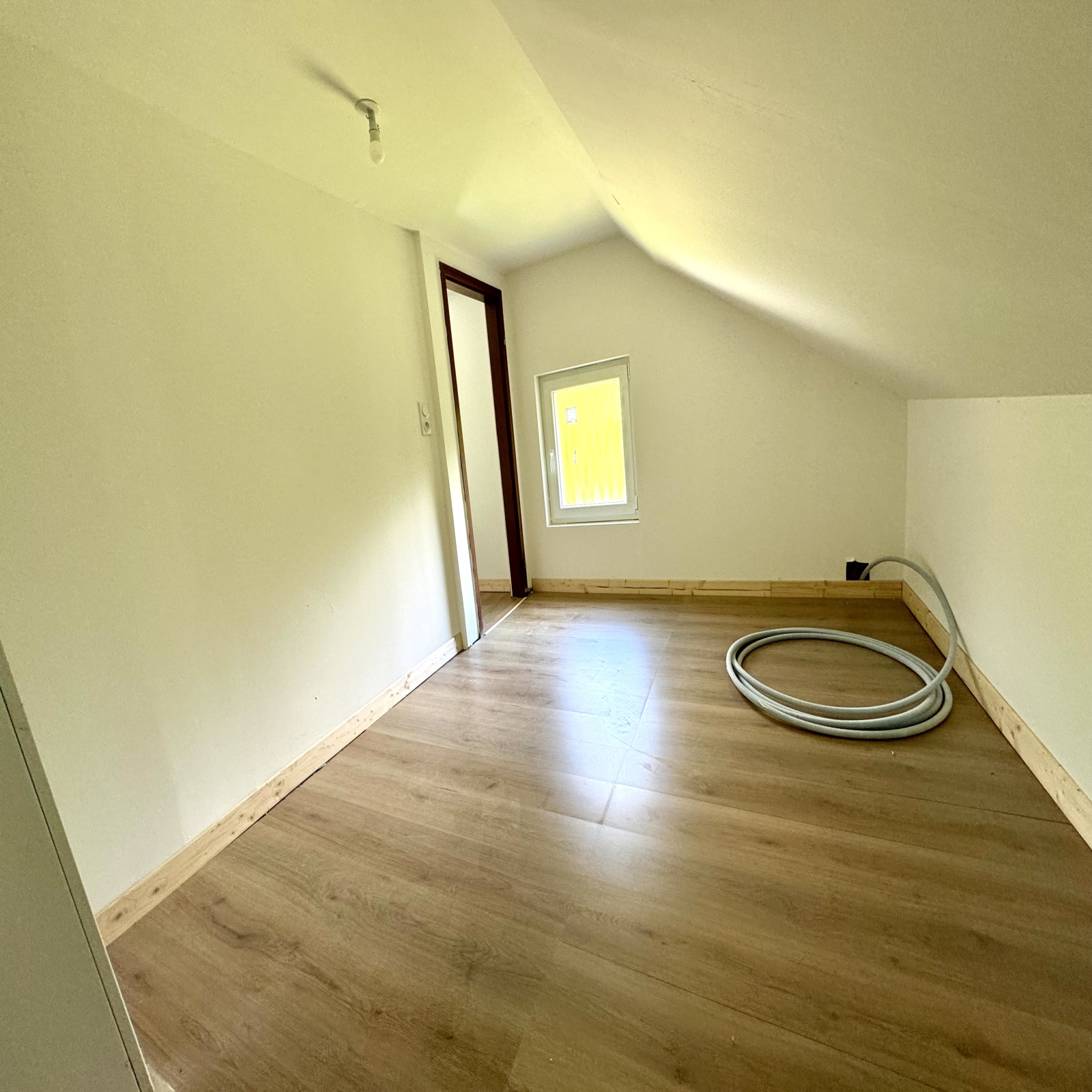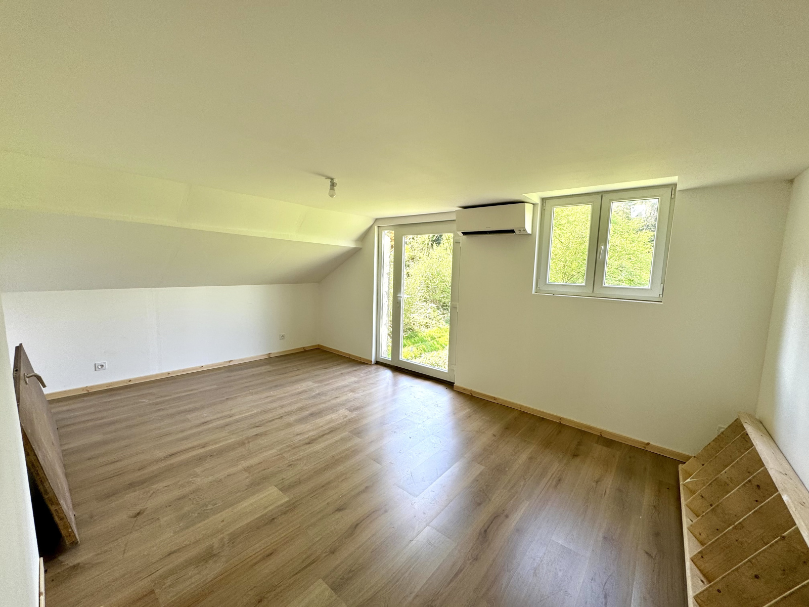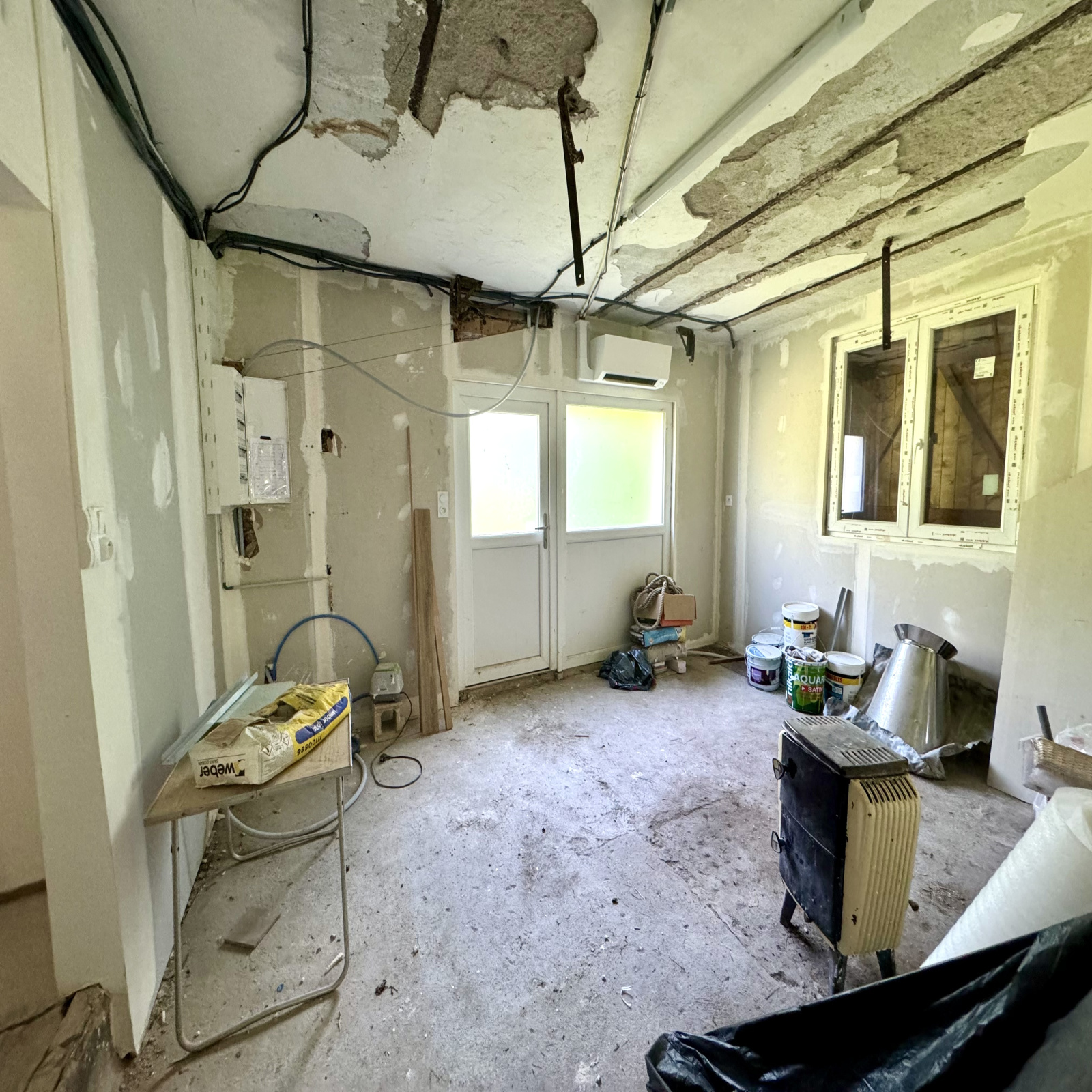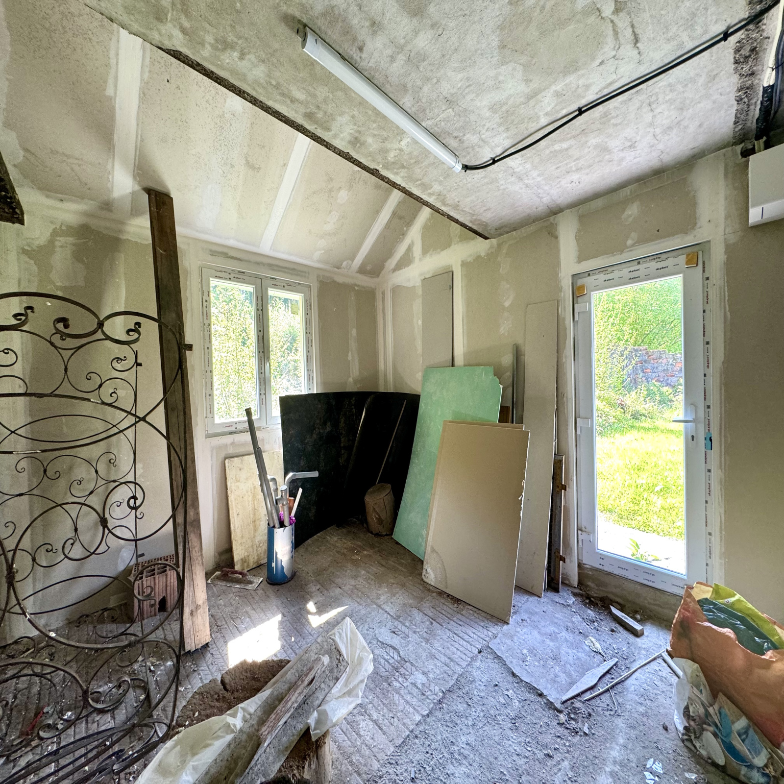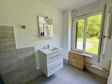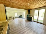 Au rez-de-chaussée : entrée (6 m2 env), w.c, cuisine équipée ouverte sur salle à manger / salon (33 m2 env) avec poêle à bois et accès extérieur, une chambre, salle d'eau avec douche à l'italienne (5 m2 env), bureau (6 m2 env), 2 pièces à terminer (17 et 18 m2 env) avec chacune un accès à l'extérieur.