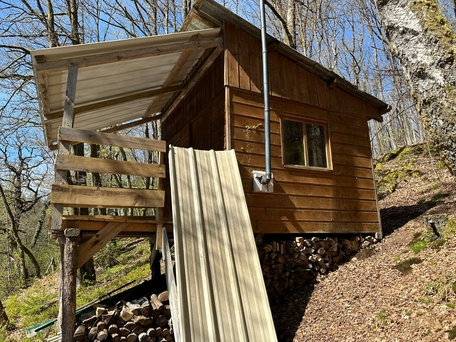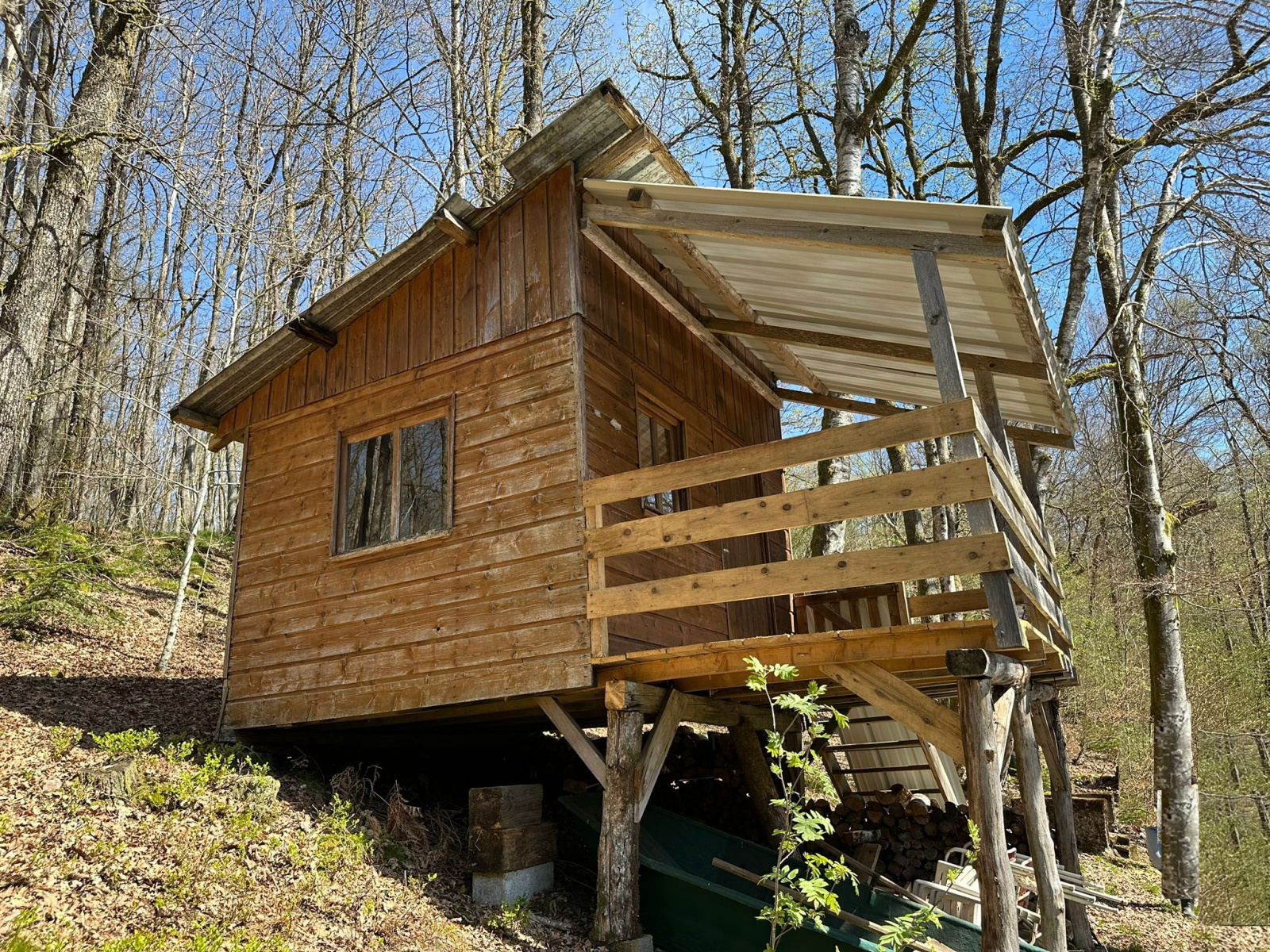 Abri de pêche en bois (pas d'eau, pas d'électricité) surplombant l'étang.