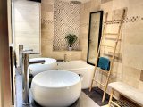 Au 1er étage : dégagement (12 m2 env), belle salle de bains avec wc (8 m2 env) salon (26 m2 env), 2 chambres (15 et 19 m2 env).