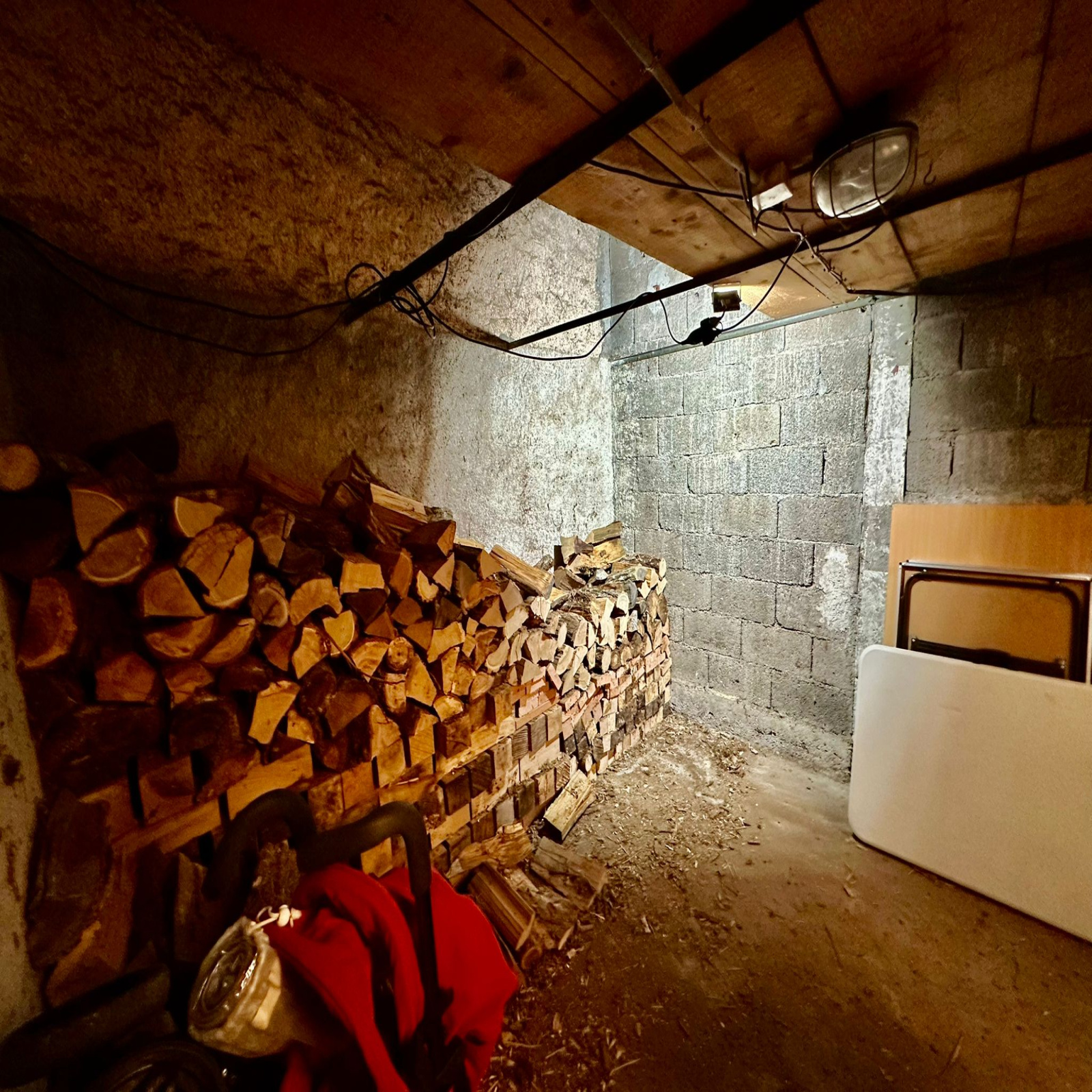 Au sous-sol : une cave (40 m2 env) avec chaudière fuel (hors service) et ballon électrique.