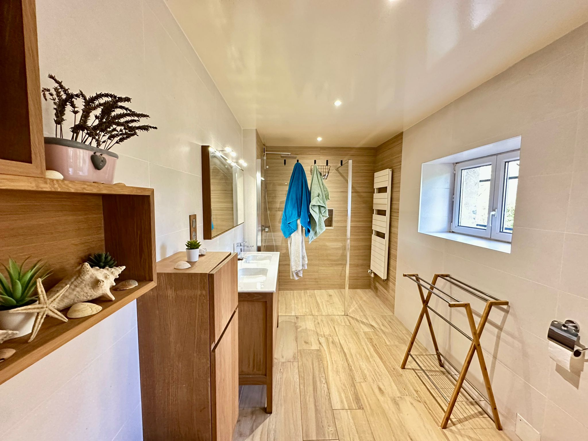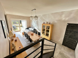 Au rez-de-chaussée : entrée (2 m2 env), cuisine équipée (16 m2 env), une chambre (18 m2 env), salle d'eau avec douche italienne (8 m2 env), espace buanderie (2 m2 env), en contrebas de 6 marches un séjour (28 m2 env).