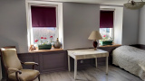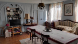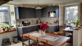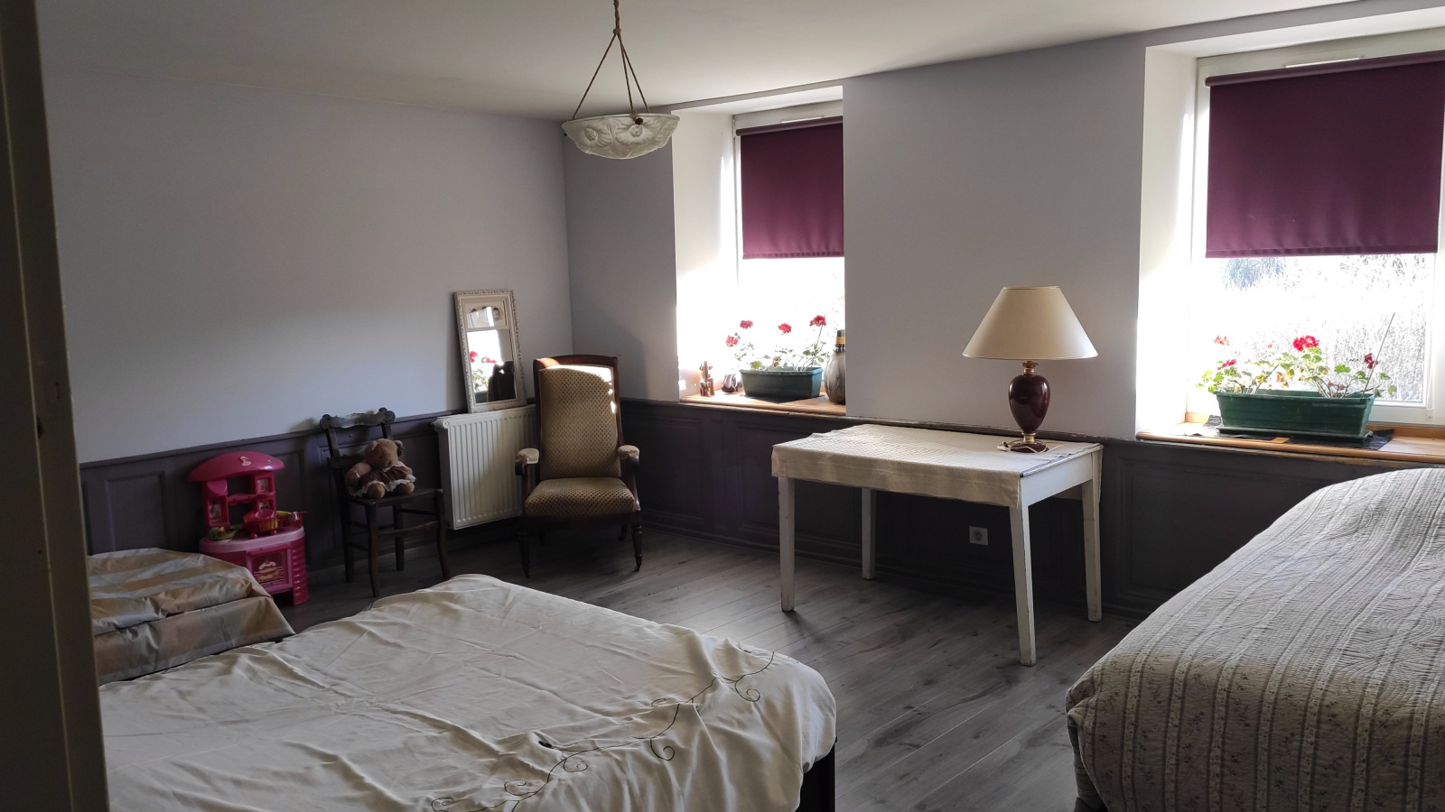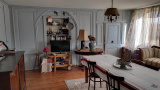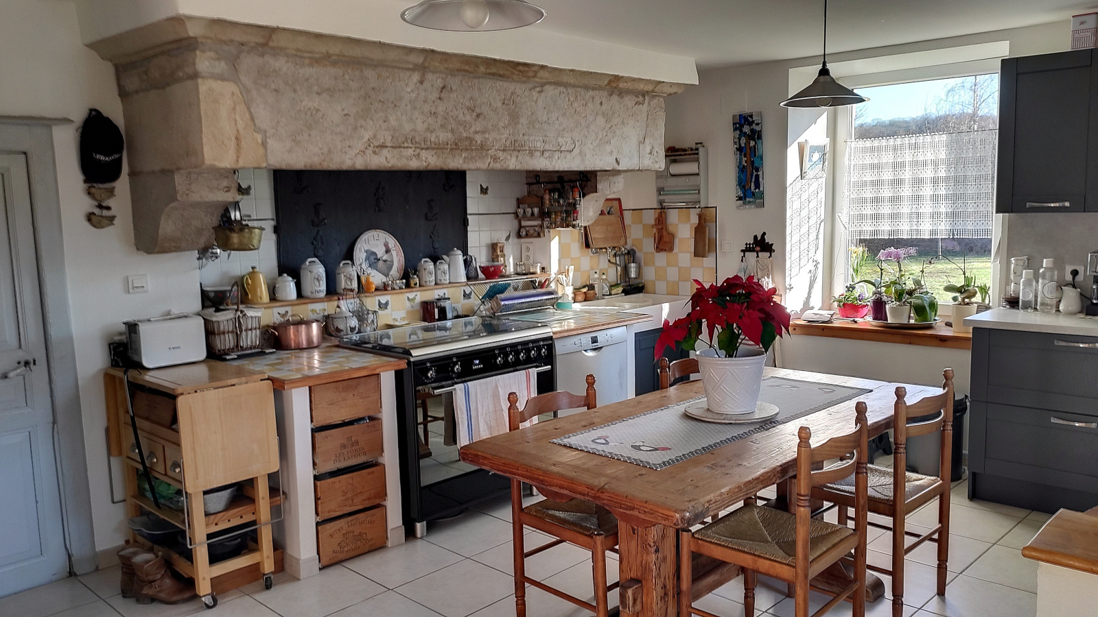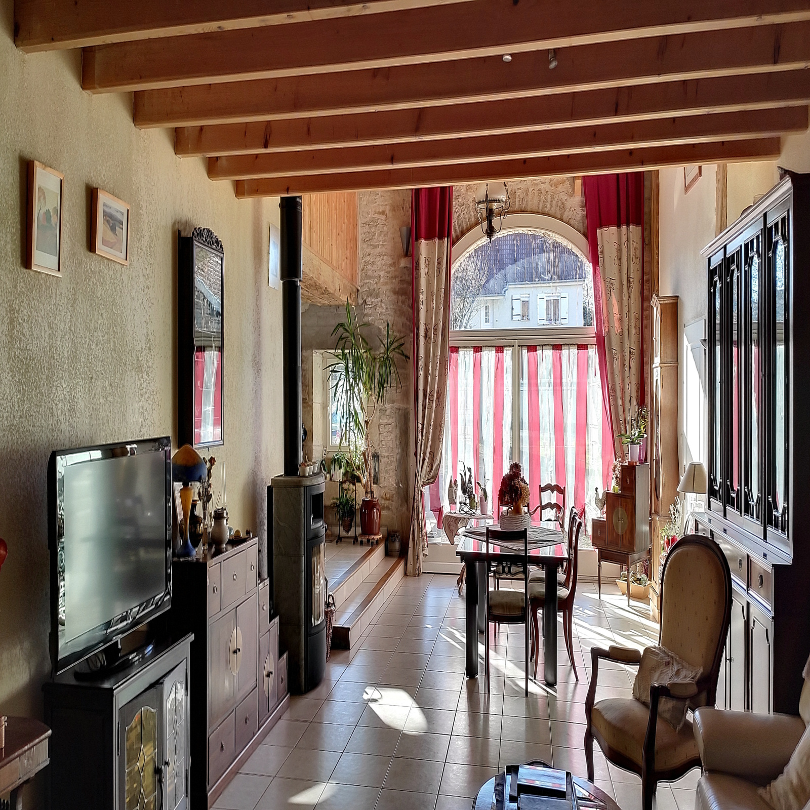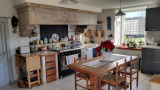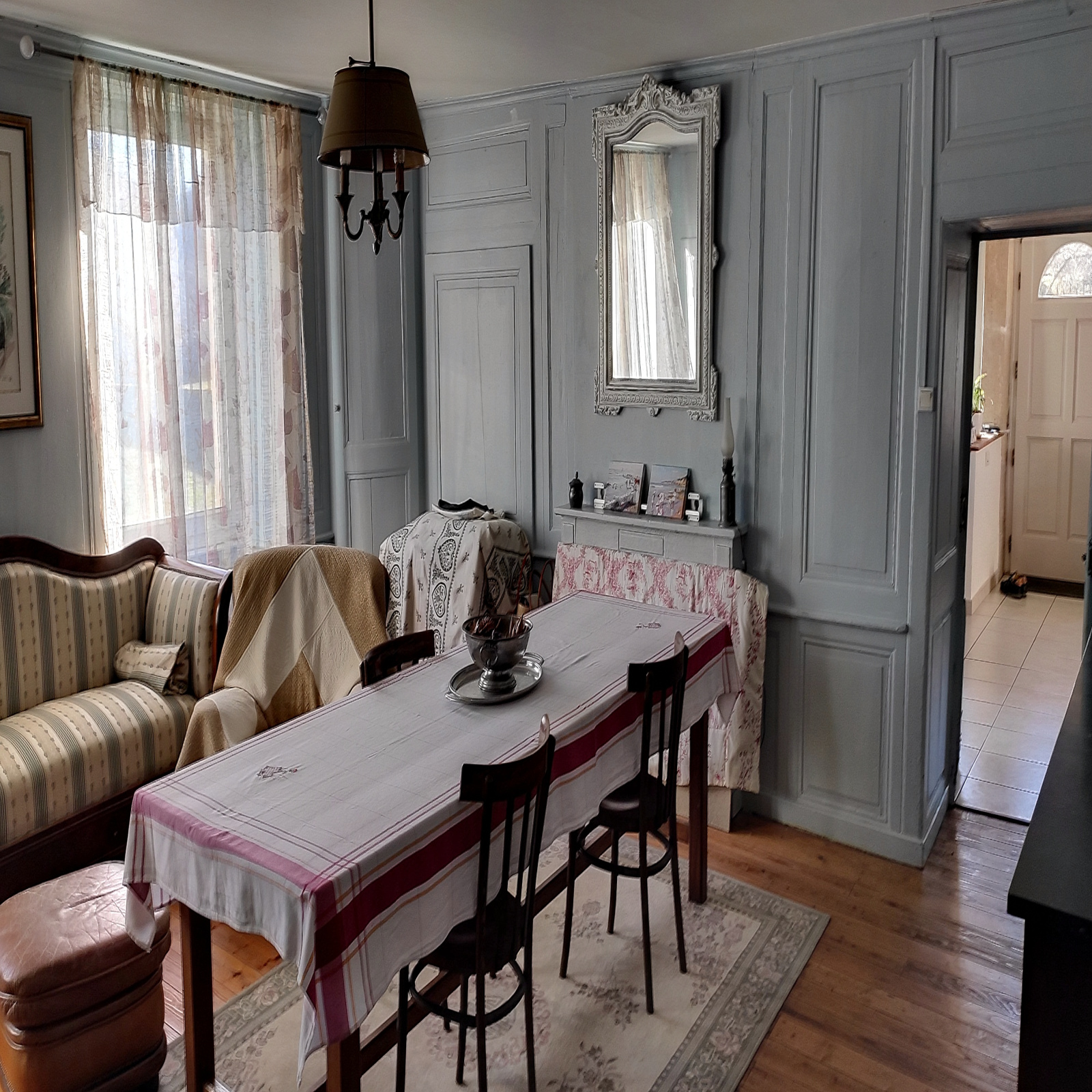 Au rez-de-chaussée : cuisine équipée (18 m² env), grande salle à manger avec poêle ( env 50 m²), salon avec boiseries (26 m² env), une chambre (19 m² env), grande salle de bains (10 m² env), wc.