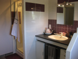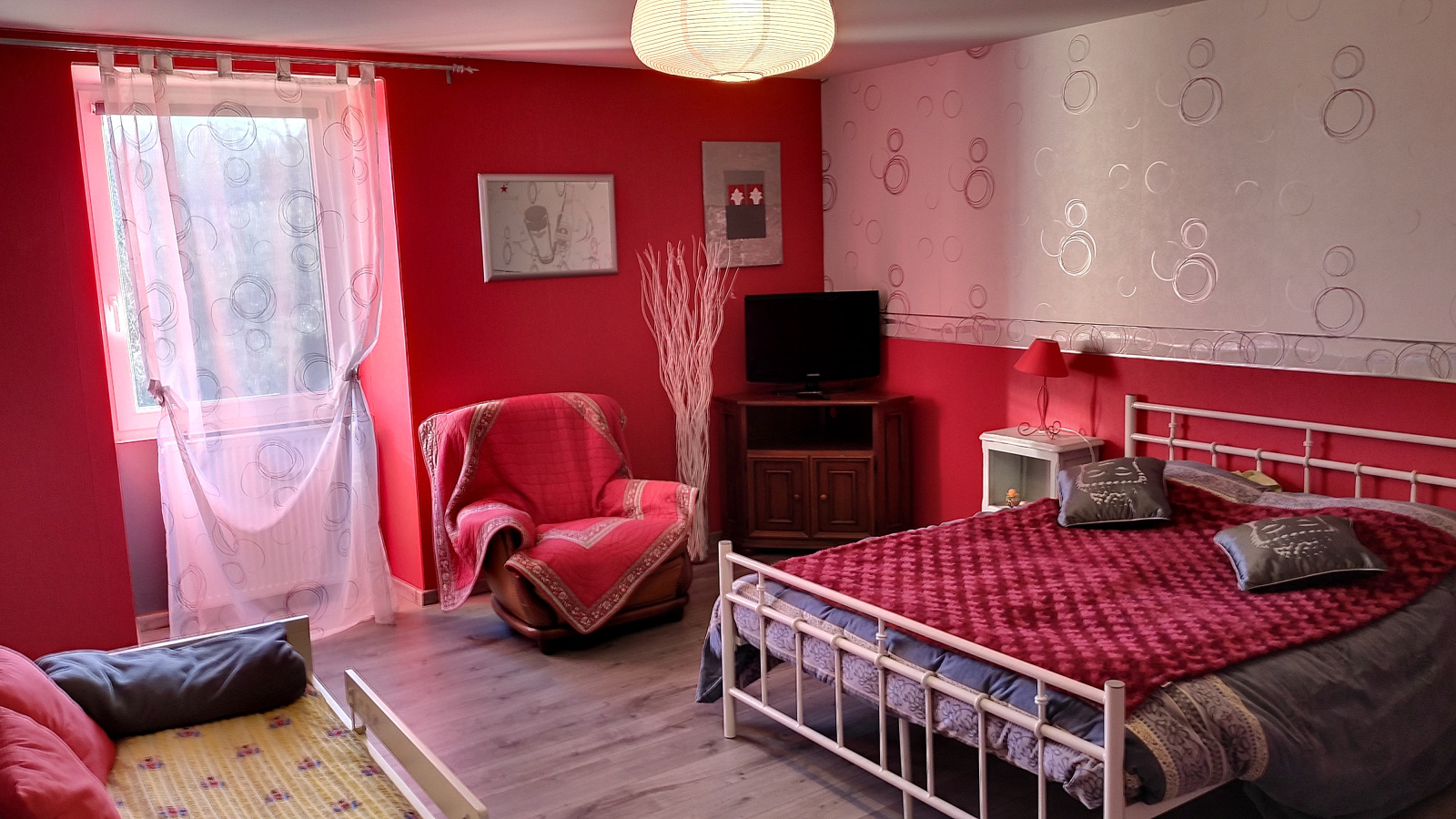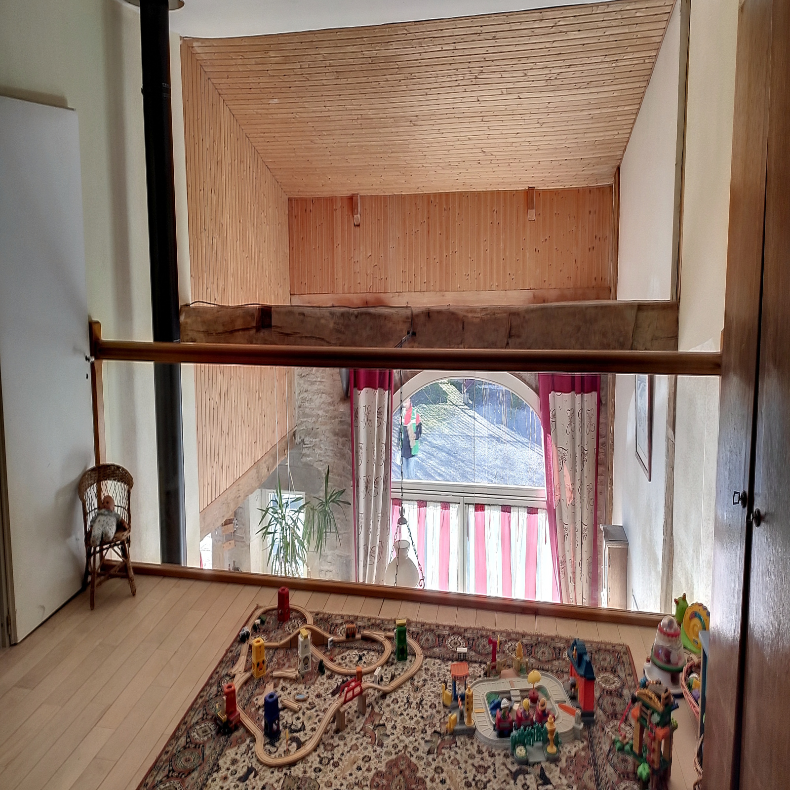 A l'étage : mezzanine (30 m² env), 2 grandes chambres (21 et 23 m² env), petit dressing (env 4.5 m²), salle d'eau avec wc (9 m² env).