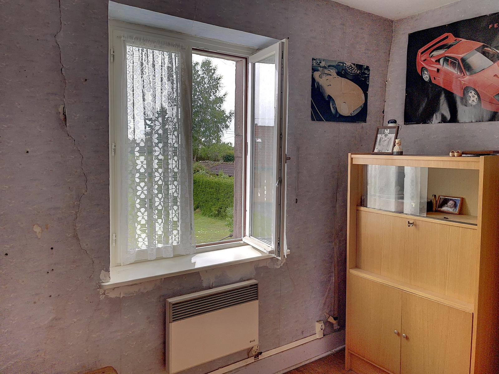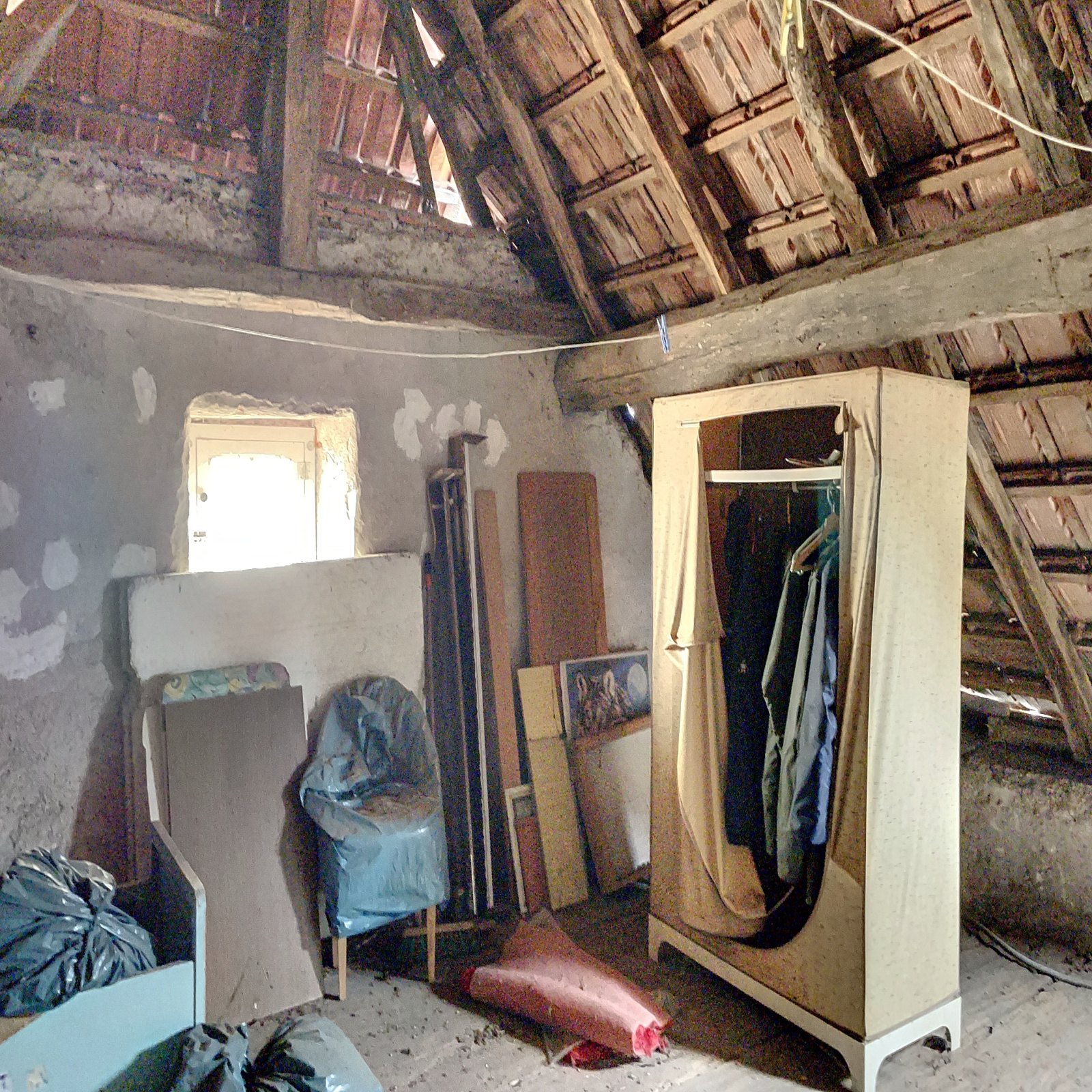 Au rez-de-chaussée : entrée, cuisine, séjour, salle de bains avec wc, chambre, une pièce avec grenier.