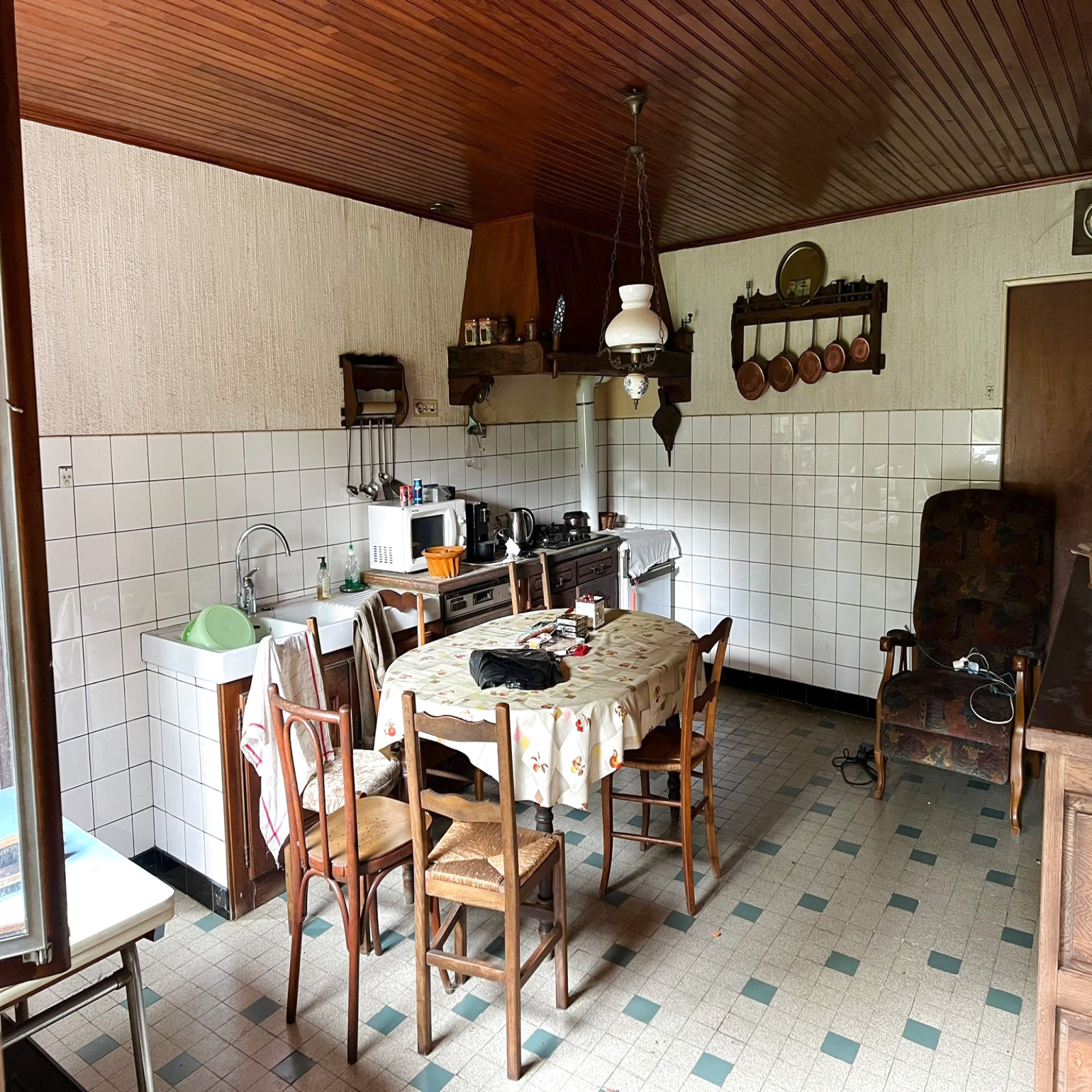 Au rez- de-chaussée : entrée, cuisine (19 m2 env), salon (25 m2 env), cellier (10 m2 env), salle de bains (6 m2 env), wc.
