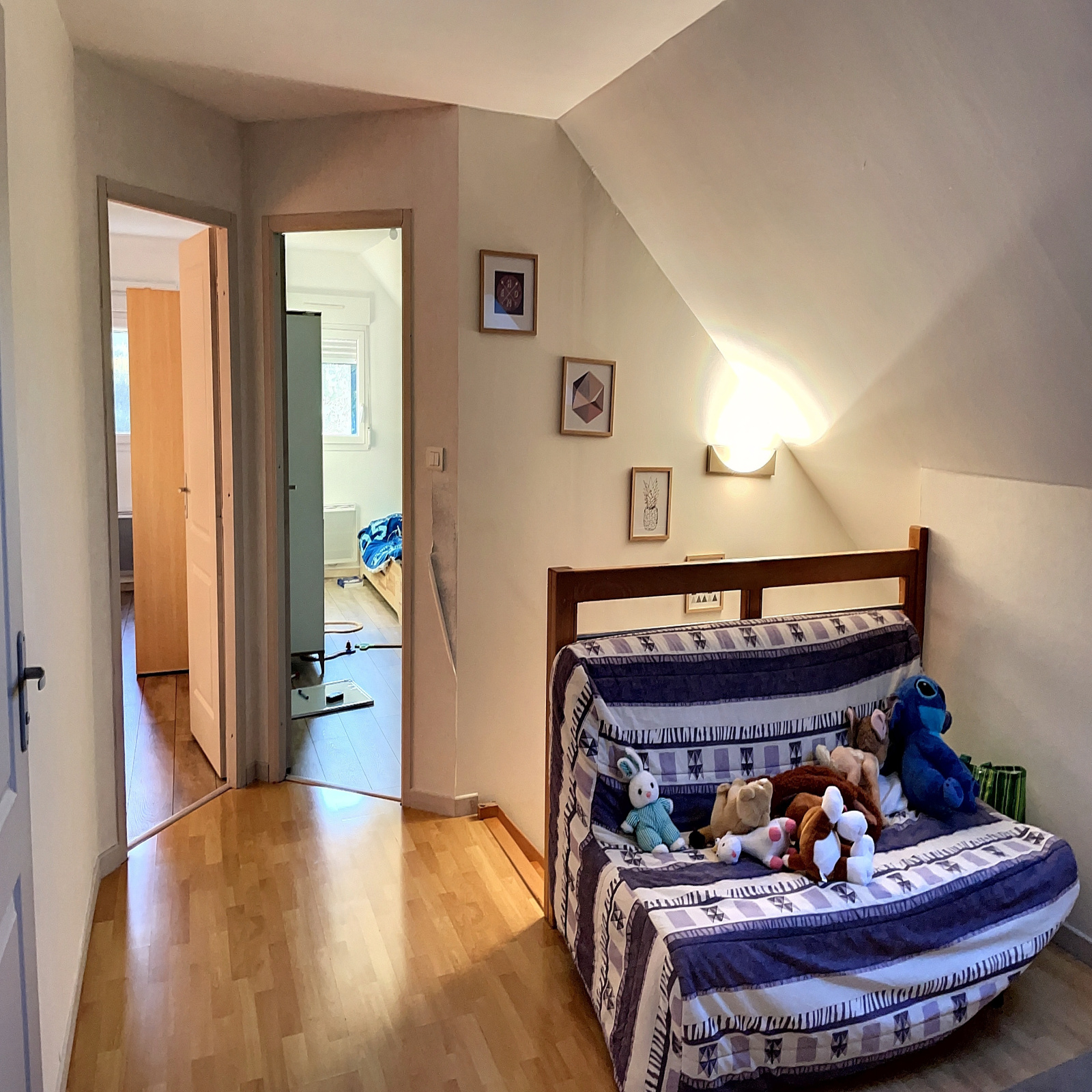 A l'étage : mezzanine (8 m2 env), 3 chambres dont une avec dressing (9, 9 et 17 m2 env), salle de bains avec wc (3 m2 env).