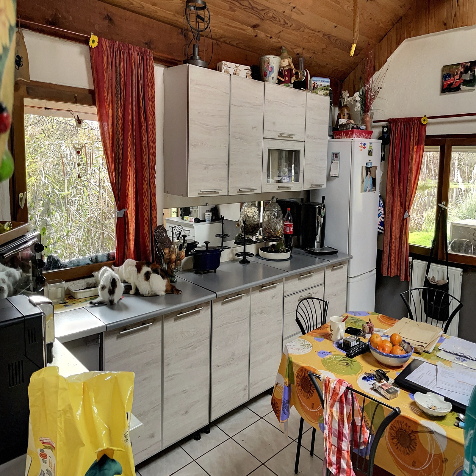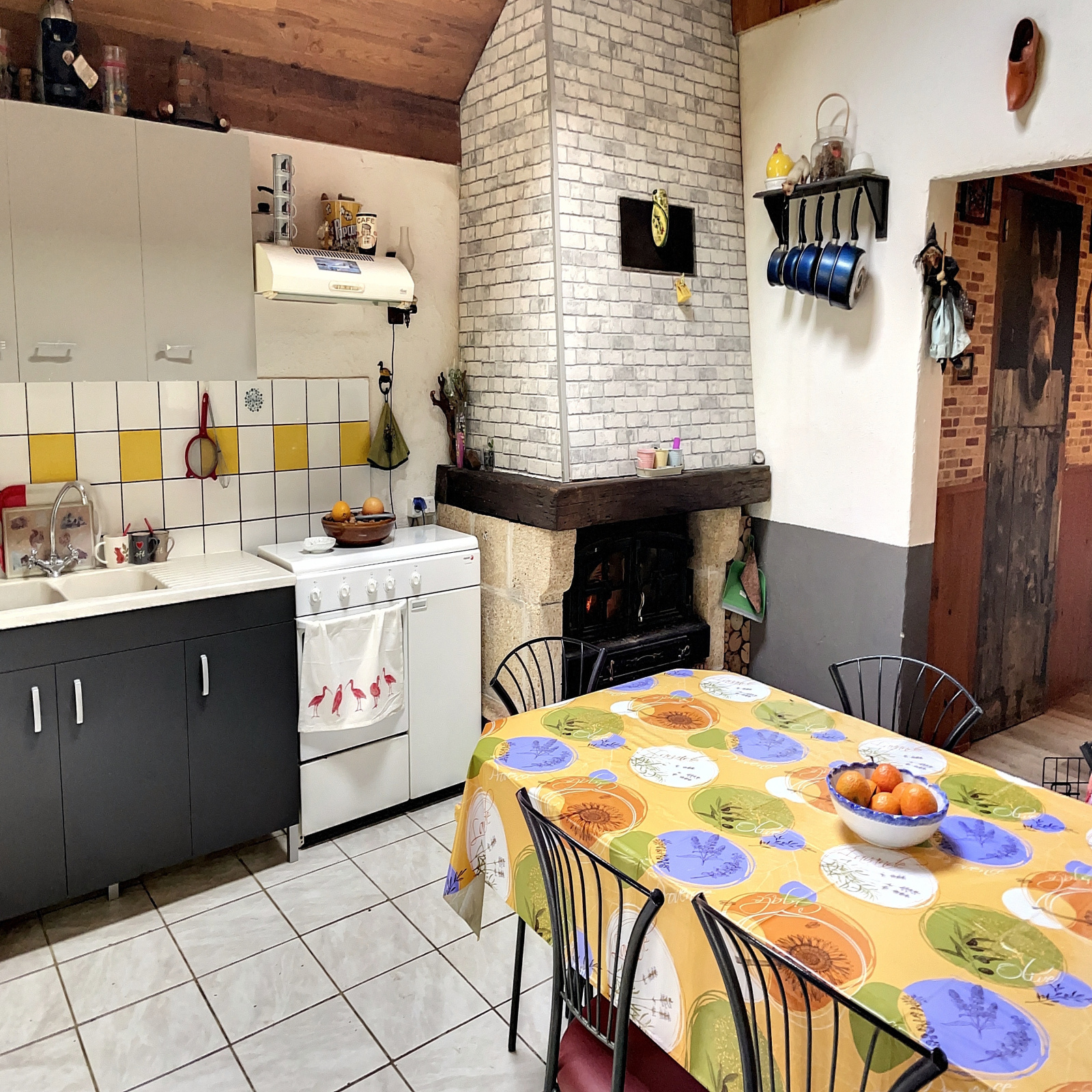 Au rez-de-chaussée : cuisine de 21 m2 env. avec cheminée insert, salon de 16 m2 env, une chambre de 13 m2 env, douche, wc.