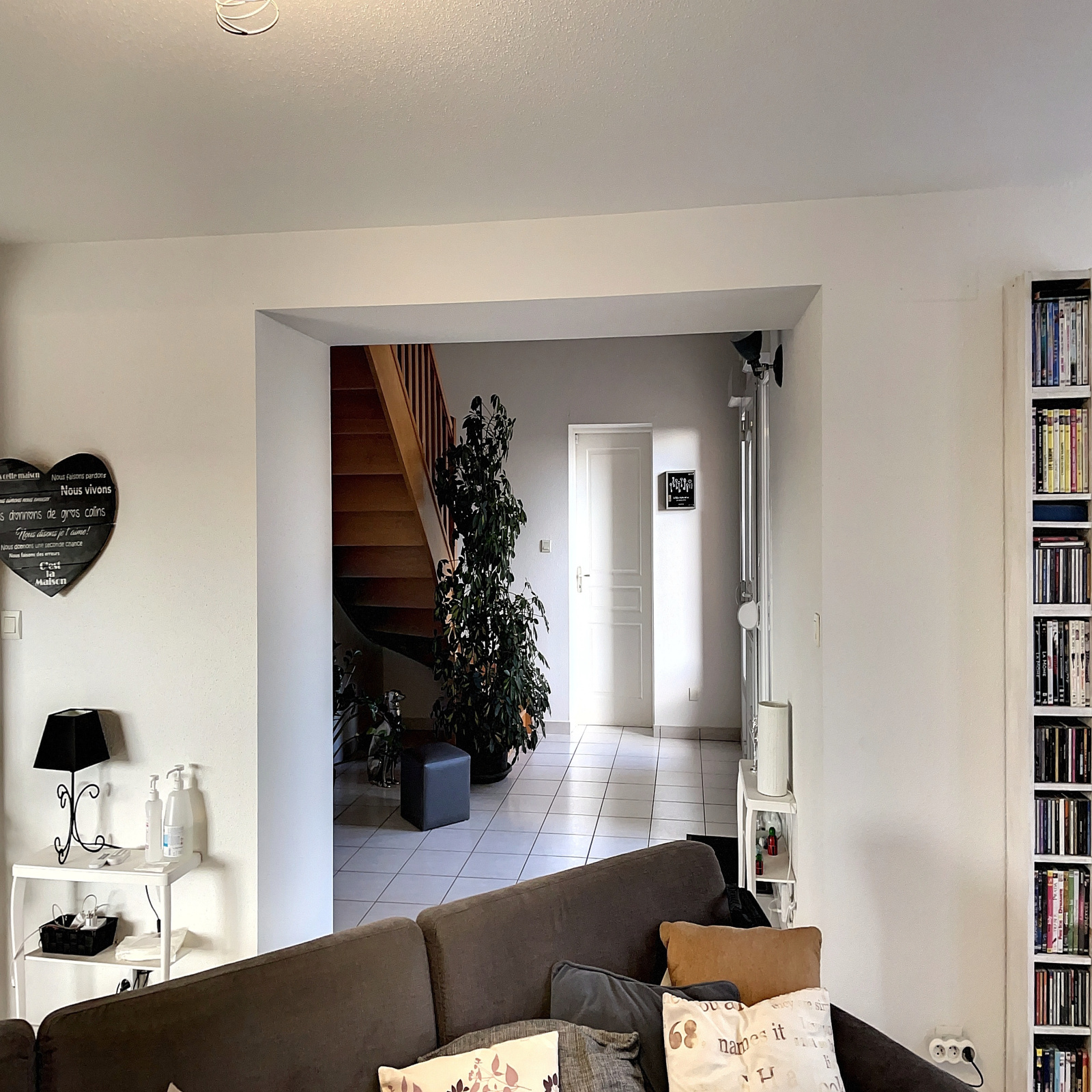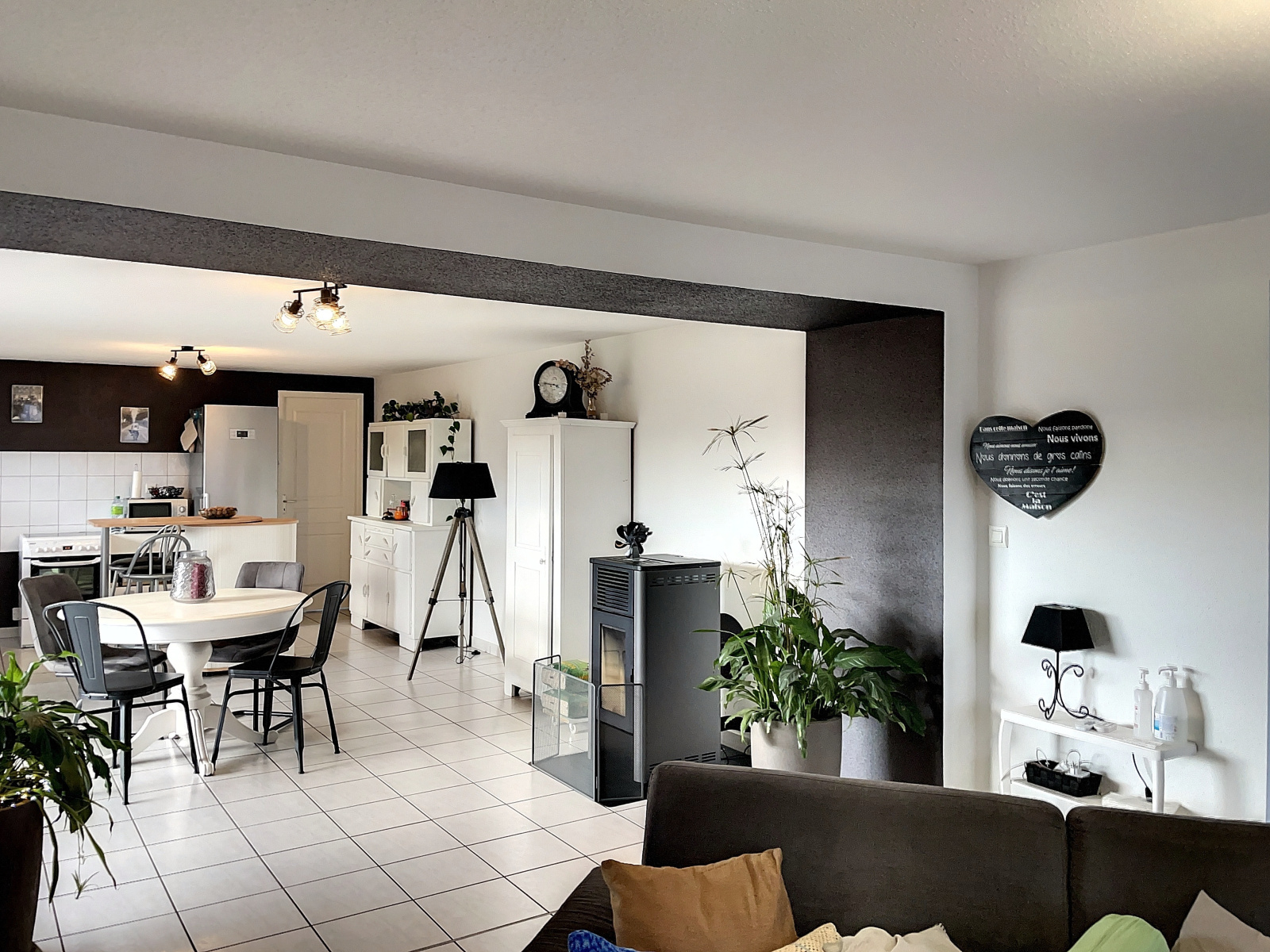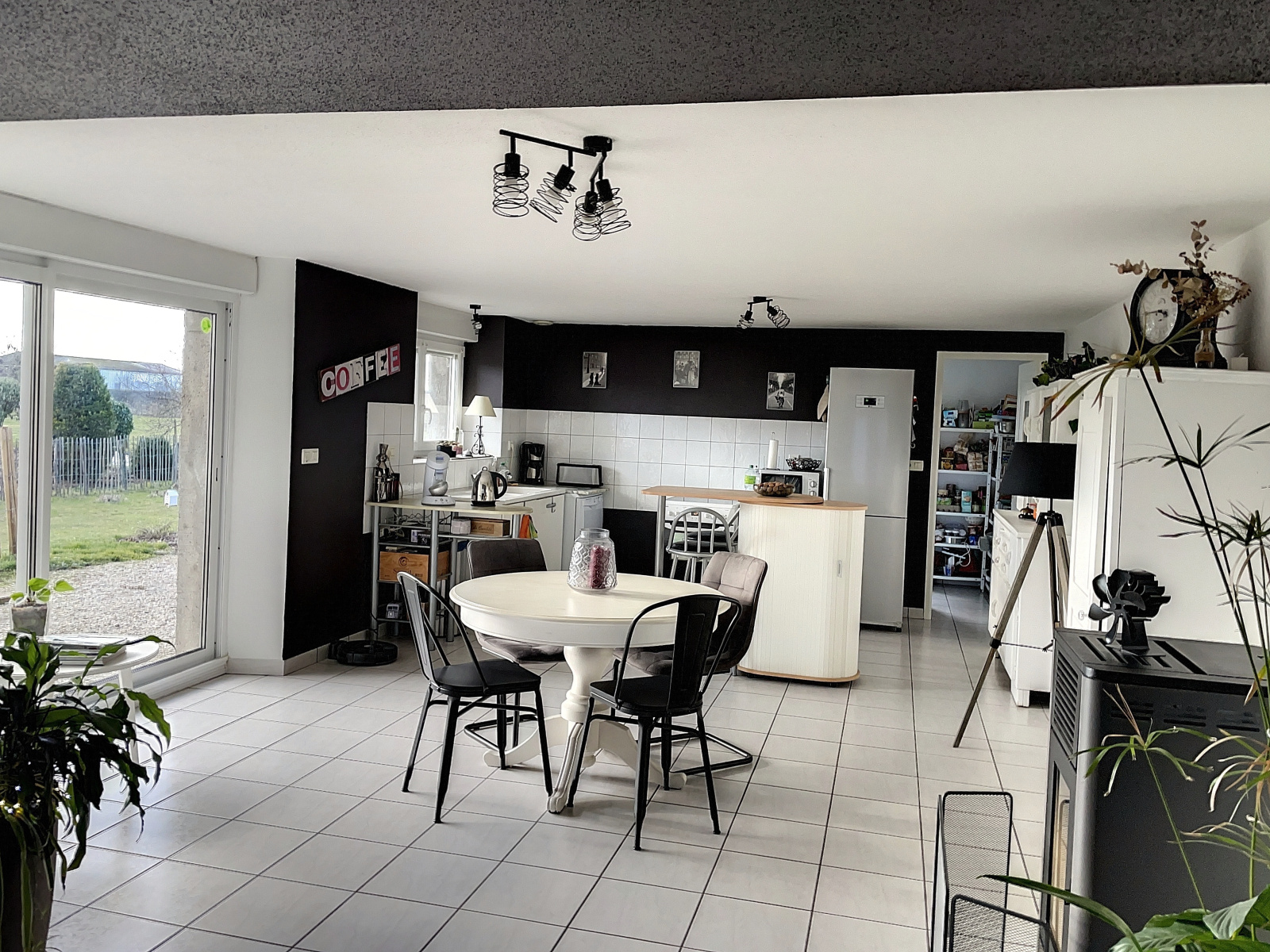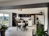 Au rez-de-chaussée : entrée (13 env), cuisine ouverte sur salle à manger / salon (51 m2 env) avec poêle à pellets, cellier avec buanderie et accès extérieur sur l'arrière, dégagement avec placard intégré (4 m2 env), une chambre (13 m2 env), salle d'eau avec wc (4,8 m2 env).