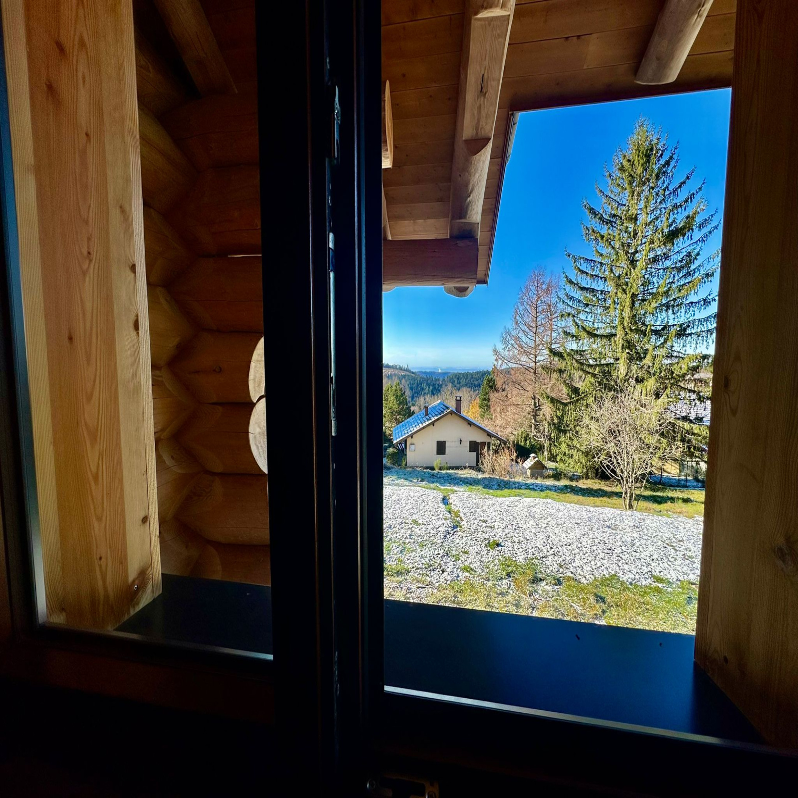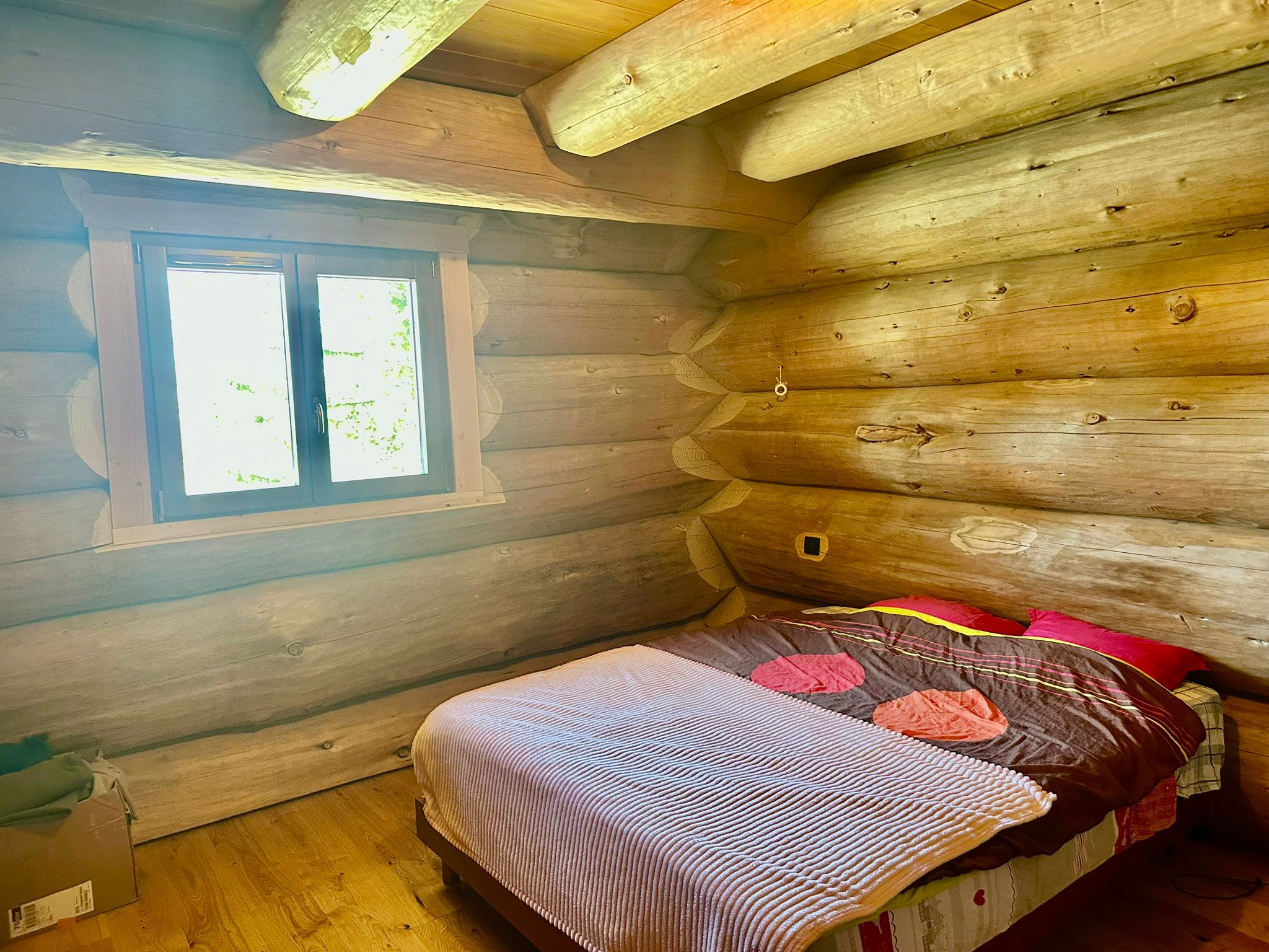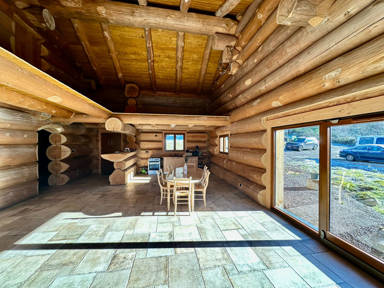 Solène vous présente en exclusivité ce superbe chalet en fuste Douglas (très gros rondins 50/60 cm) de 2023, 116 m2, sur terrain de 4640 m2 comprenant :