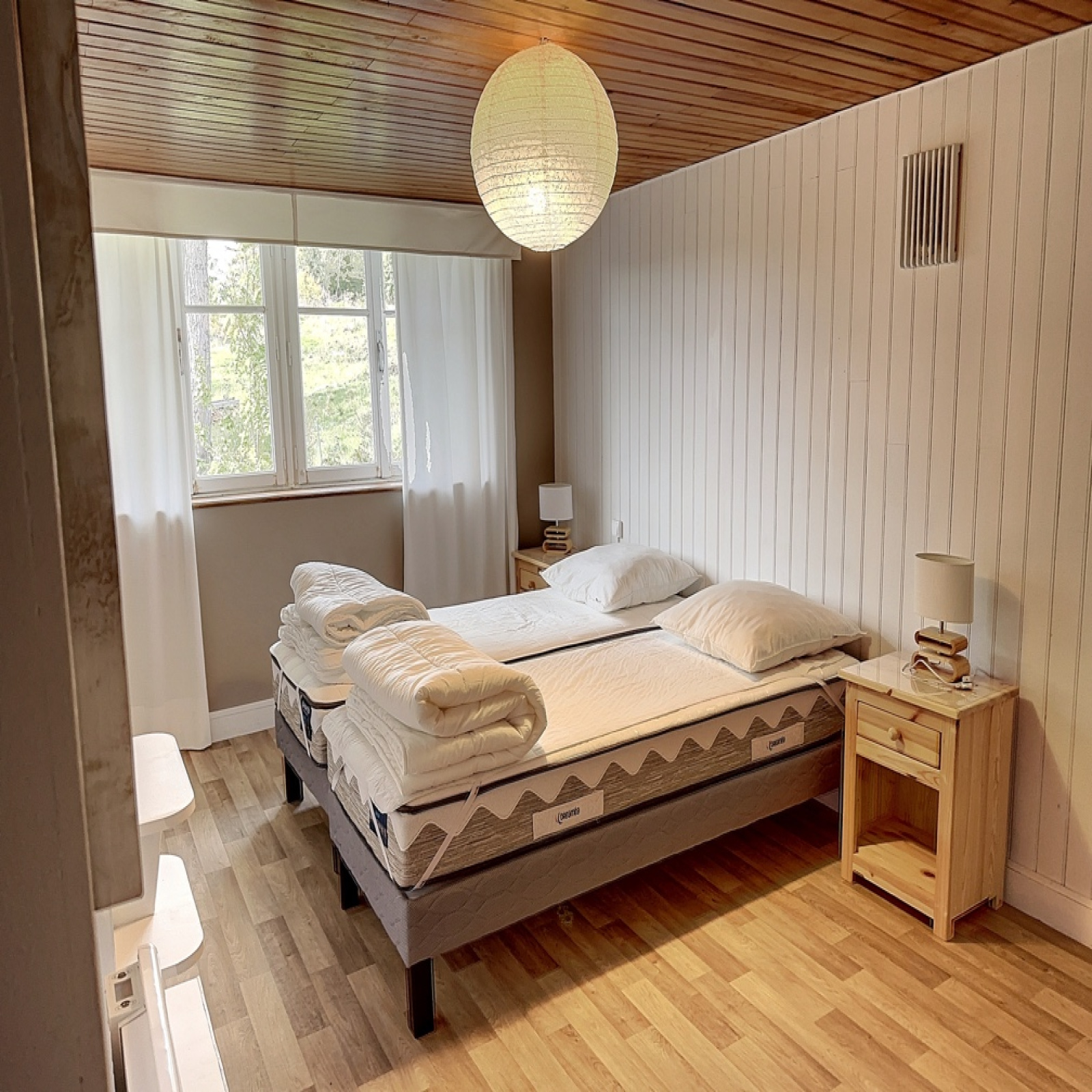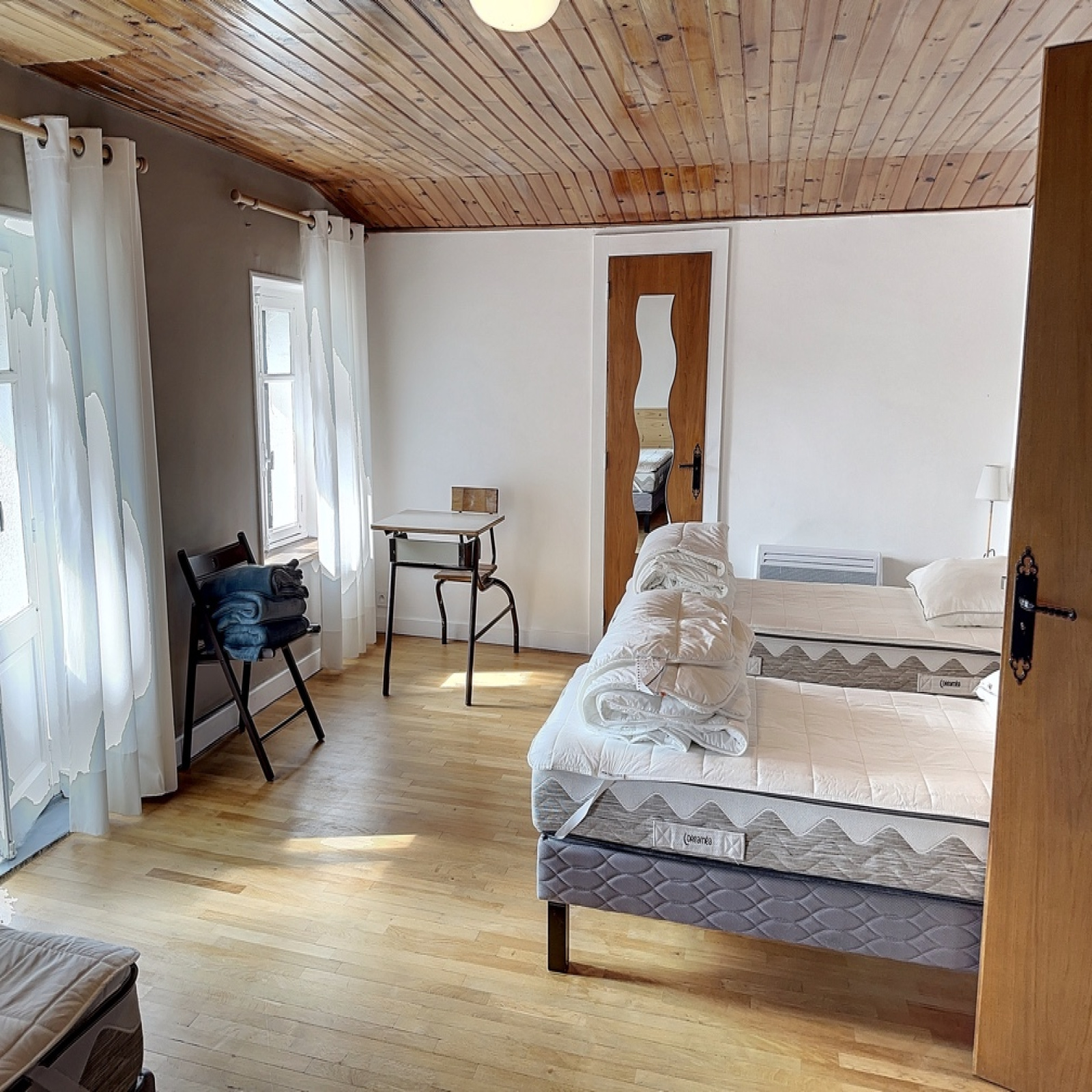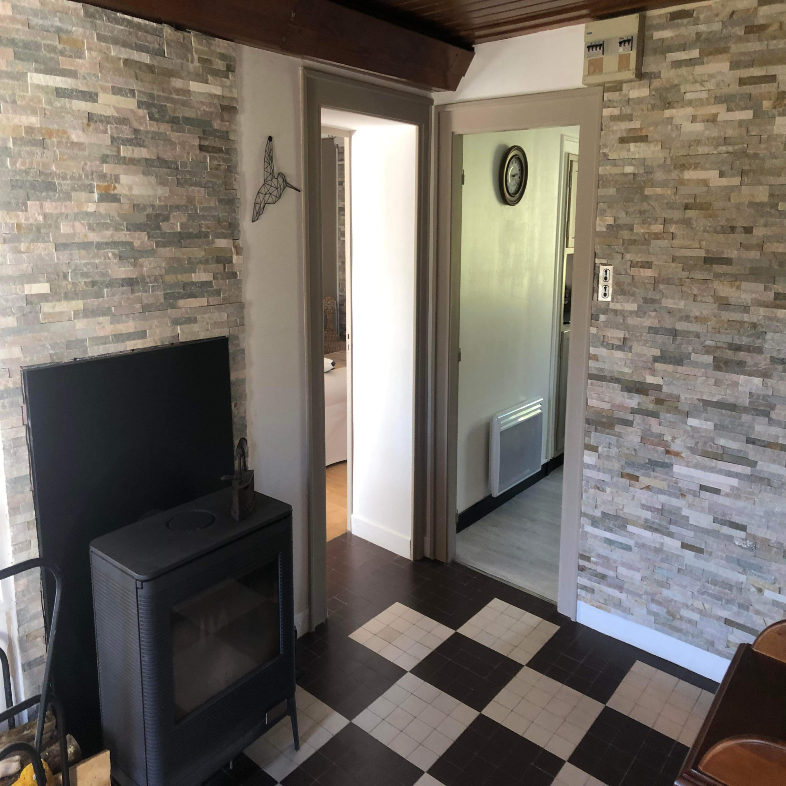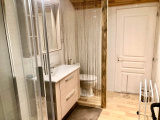 Chauffage : poêle bois + convecteurs électriques. (25 stères de bois suffisent à chauffer à 24 degres en bas et 27 au-dessus)