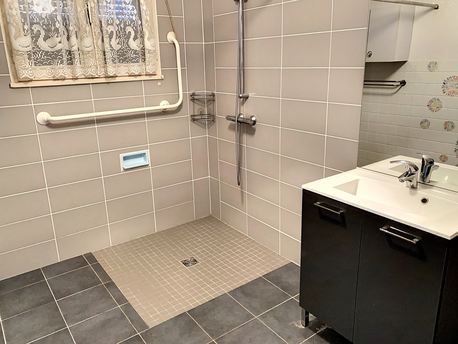 Au niveau de vie, entrée ouverte sur une grande pièce à vivre en L de 57 m² environ composée de cuisine aménagée, salon, salle à manger avec conduit de cheminée, WC, salle d'eau avec douche italienne et une pièce de 13 m² environ avec ascenseur. Belle vue depuis la terrasse sur le village et les monts.