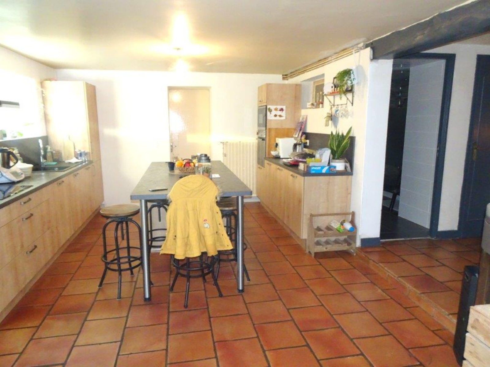 Au rez-de-chaussée : grande entrée, grande cuisine équipée ouverte sur salle à manger avec poêle à bois et accès terrasse, salon avec ancienne cheminée, salle d'eau, wc.