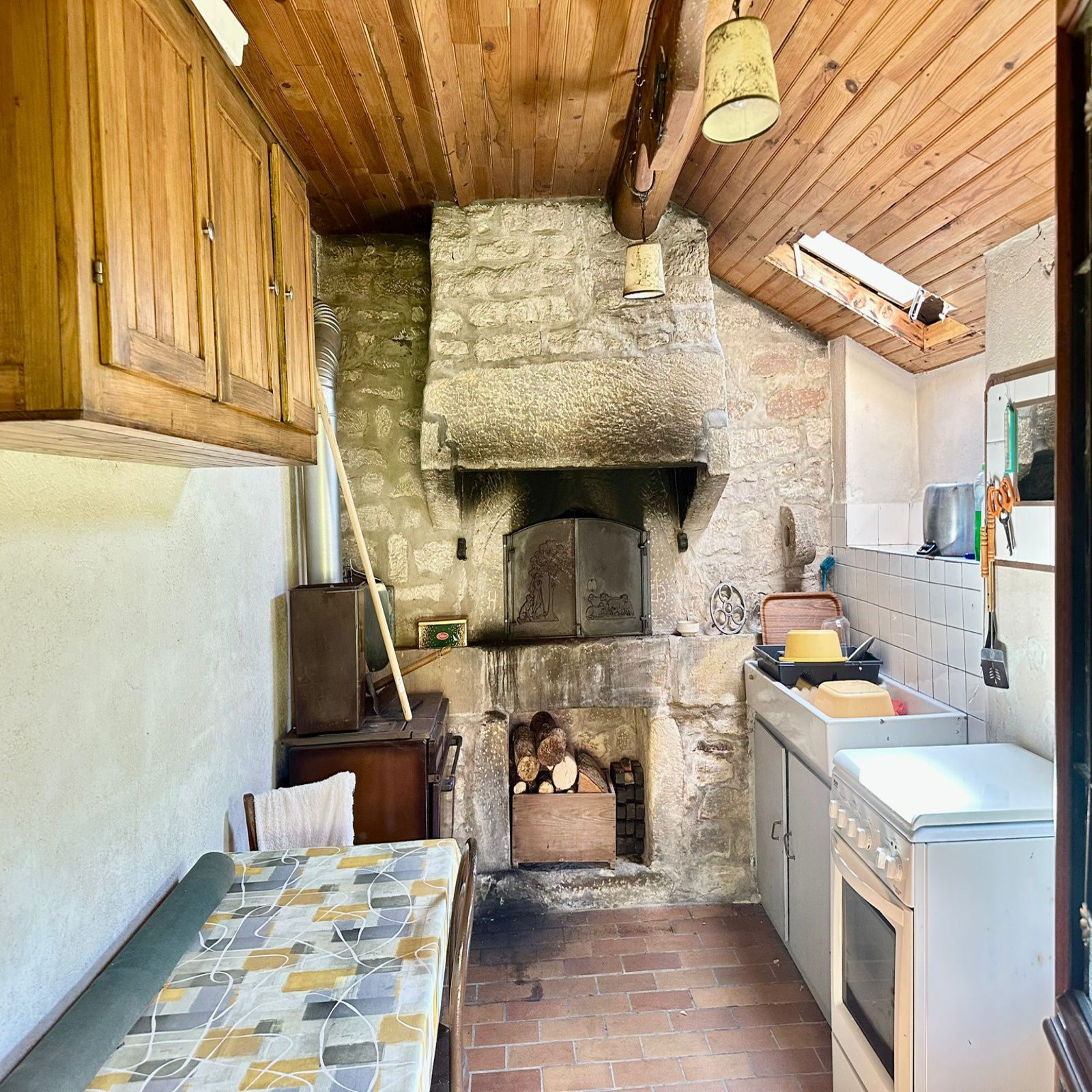 Au rez-de-chaussée : entrée, cuisine (8 m2 env) avec four à pain et cuisinière, séjour (18 m2 env) avec poêle à bois et accès terrasse, une pièce (8 m2 env).