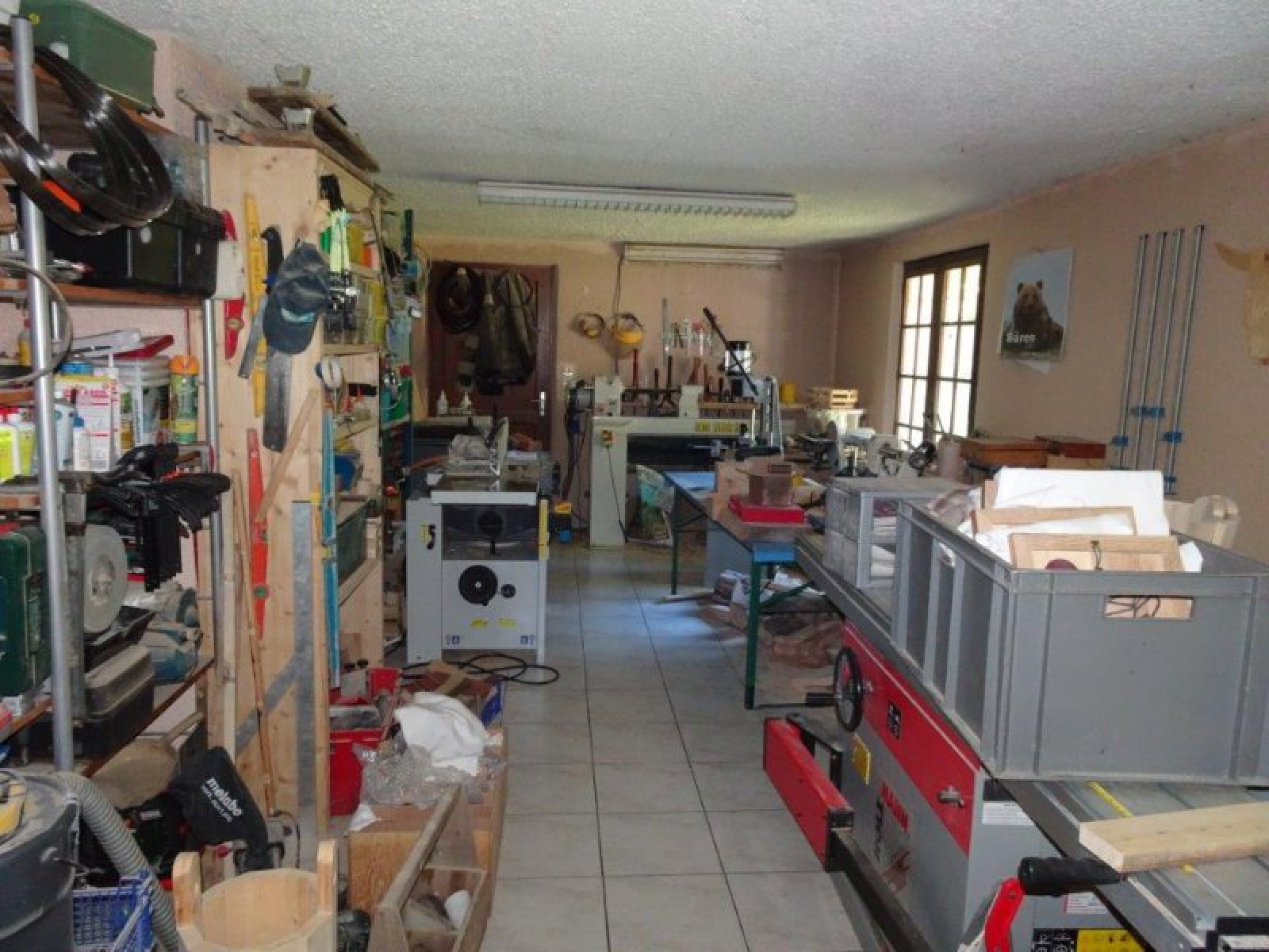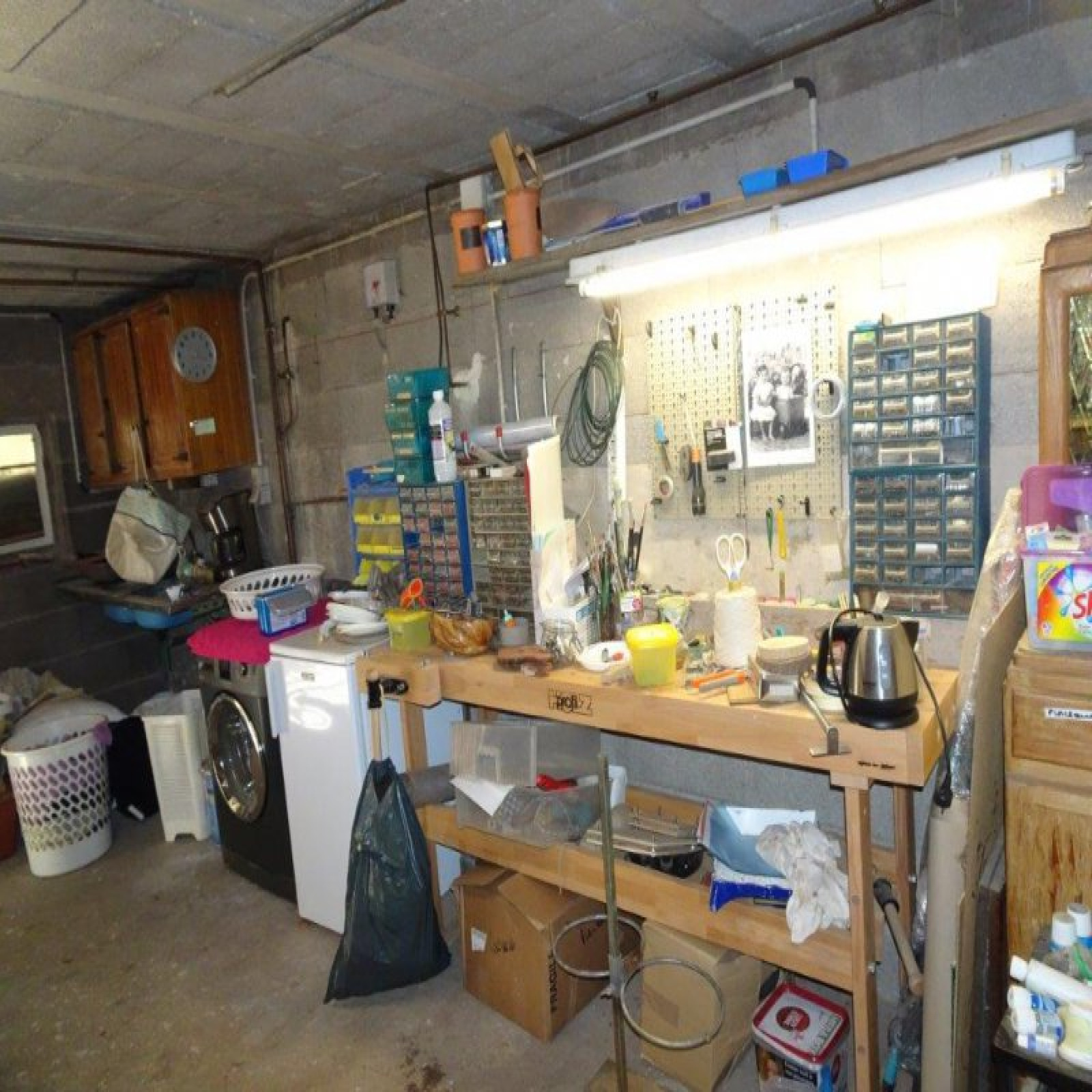 Garage avec porte motorisée (30 m² environ), chaufferie, atelier (31 m² environ).