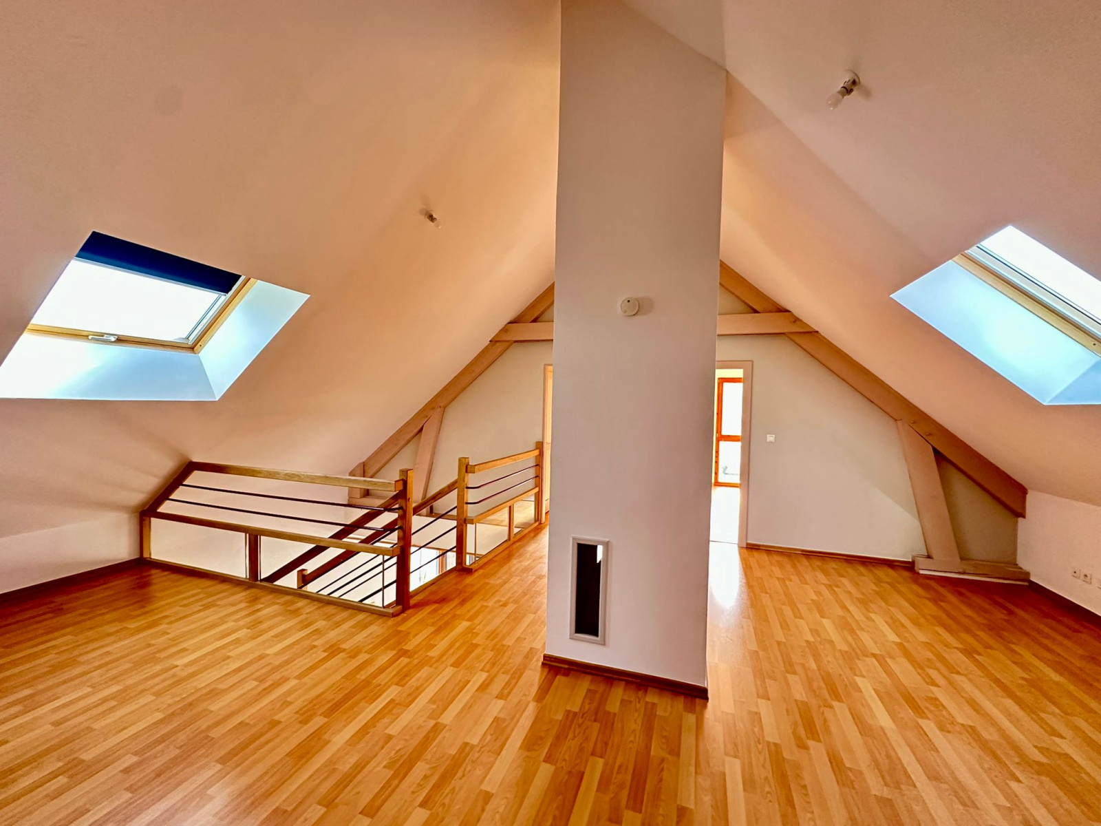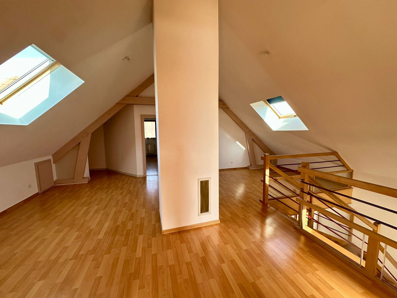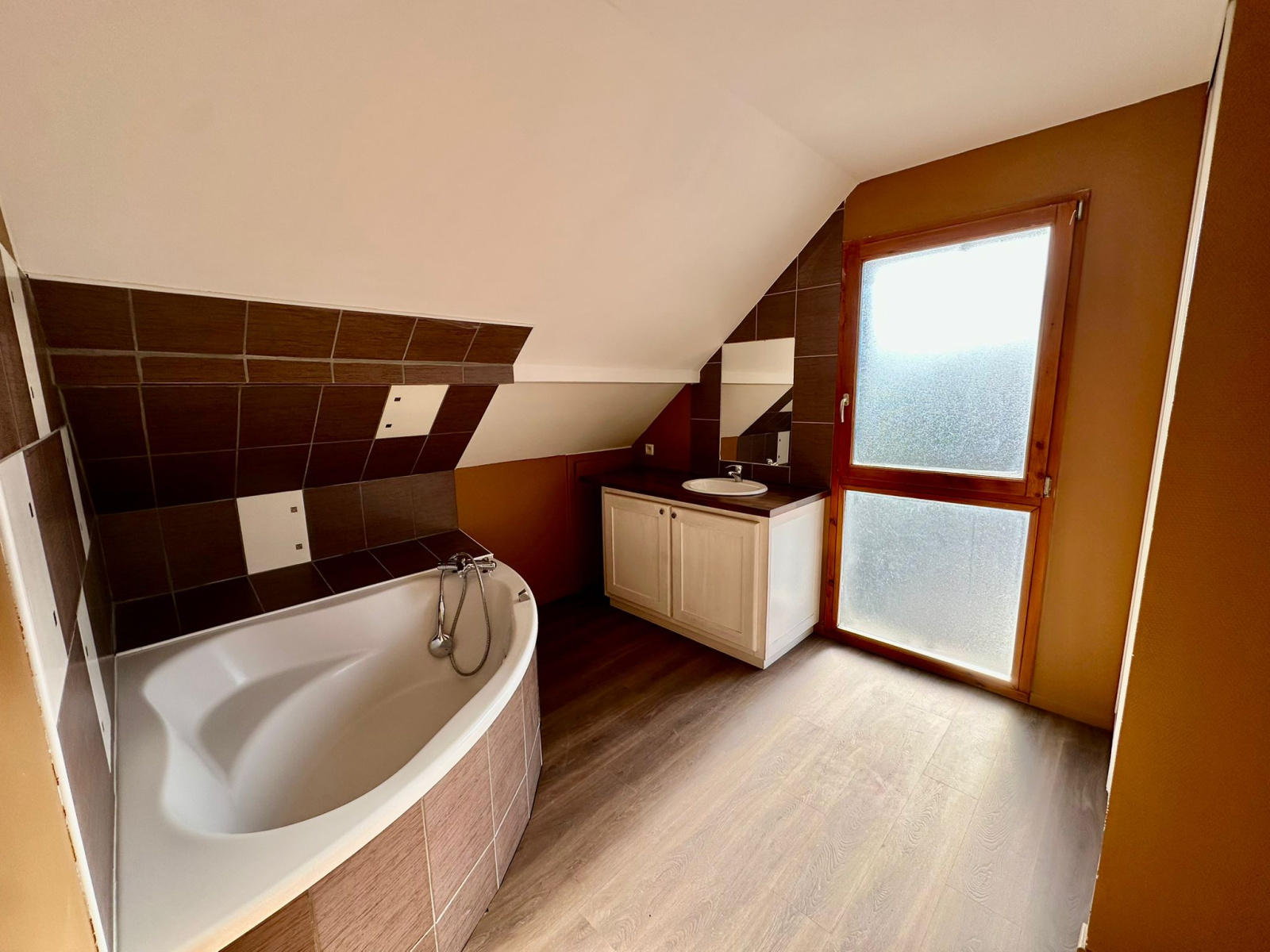 A l'étage : mezzanine mansardée (25 m2 env), 3 chambres mansardées (11, 11, 12 m2 env), bureau (7,5 m2 env), salle de bains (7,5 m2 env), wc.