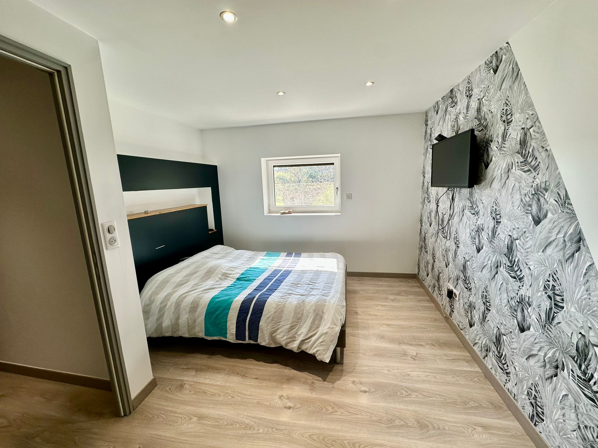 Au rez-de-chaussée : entrée dans cuisine équipée ouverte sur séjour (60 m2 env) avec poêle à pellets et accès terrasse, dégagement, wc, buanderie (7 m2 env).