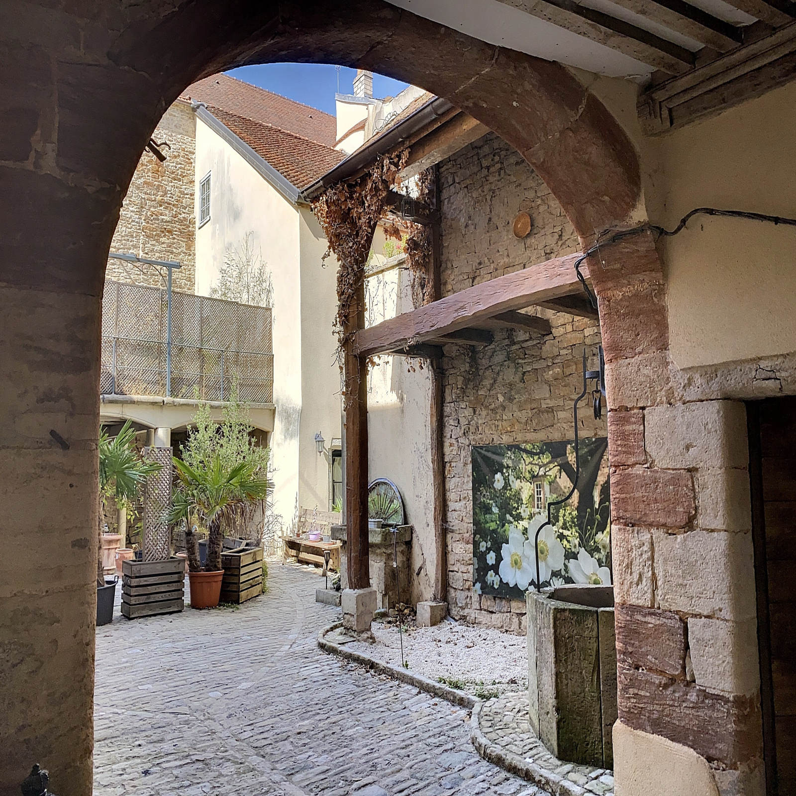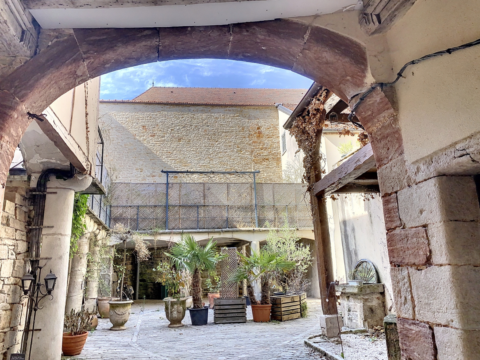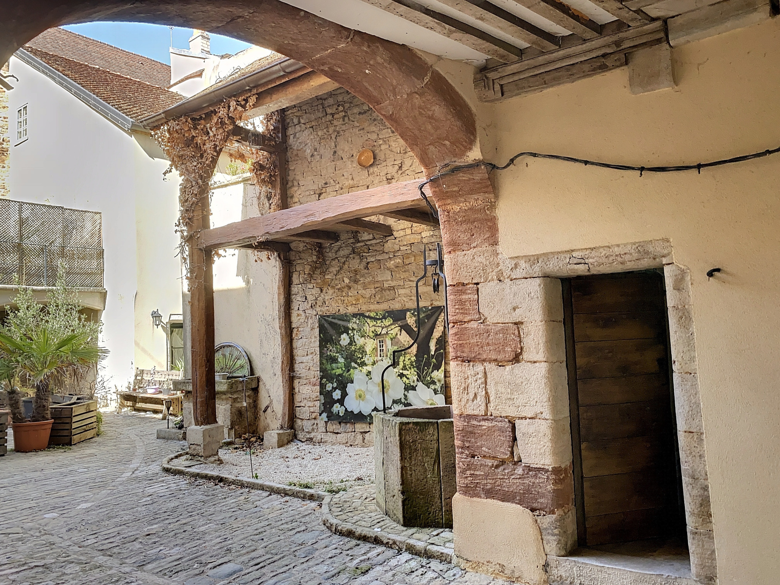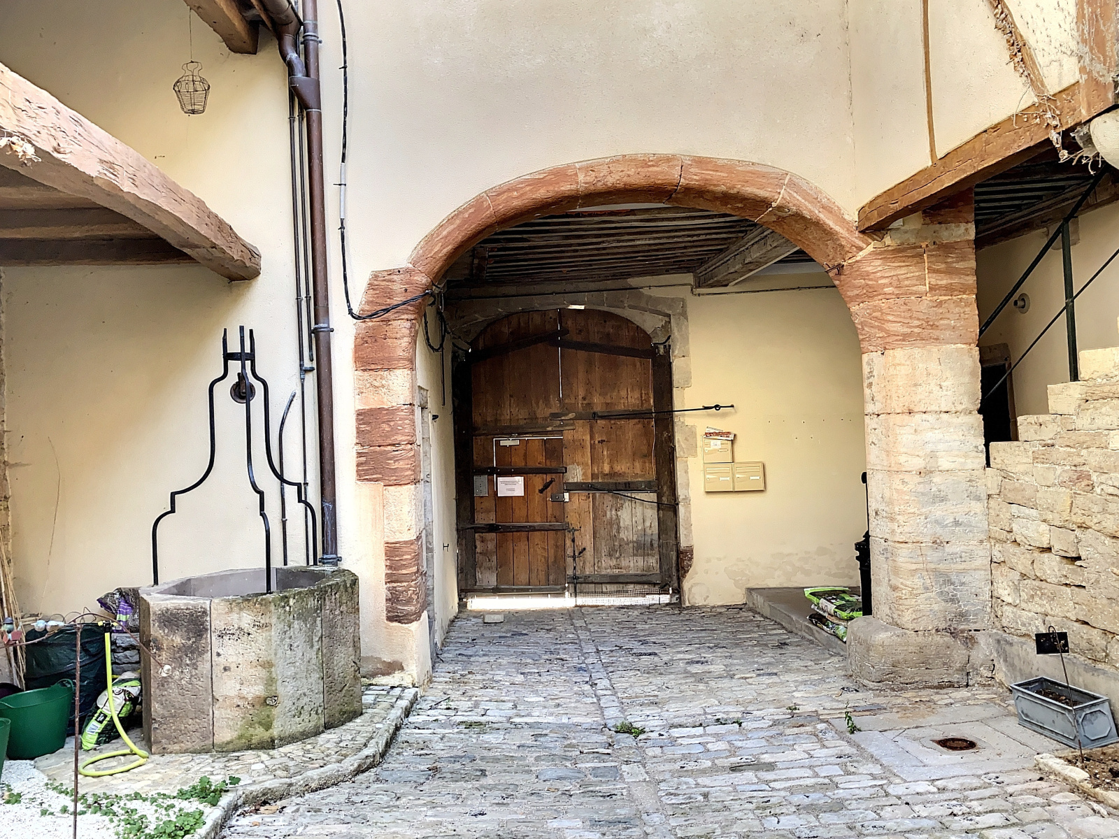 L'entrée se fait par un portail en bois datant du Moyen-âge couvrant l'intégralité du porche. Elle donne sur une superbe cour intérieure pavée avec puits.