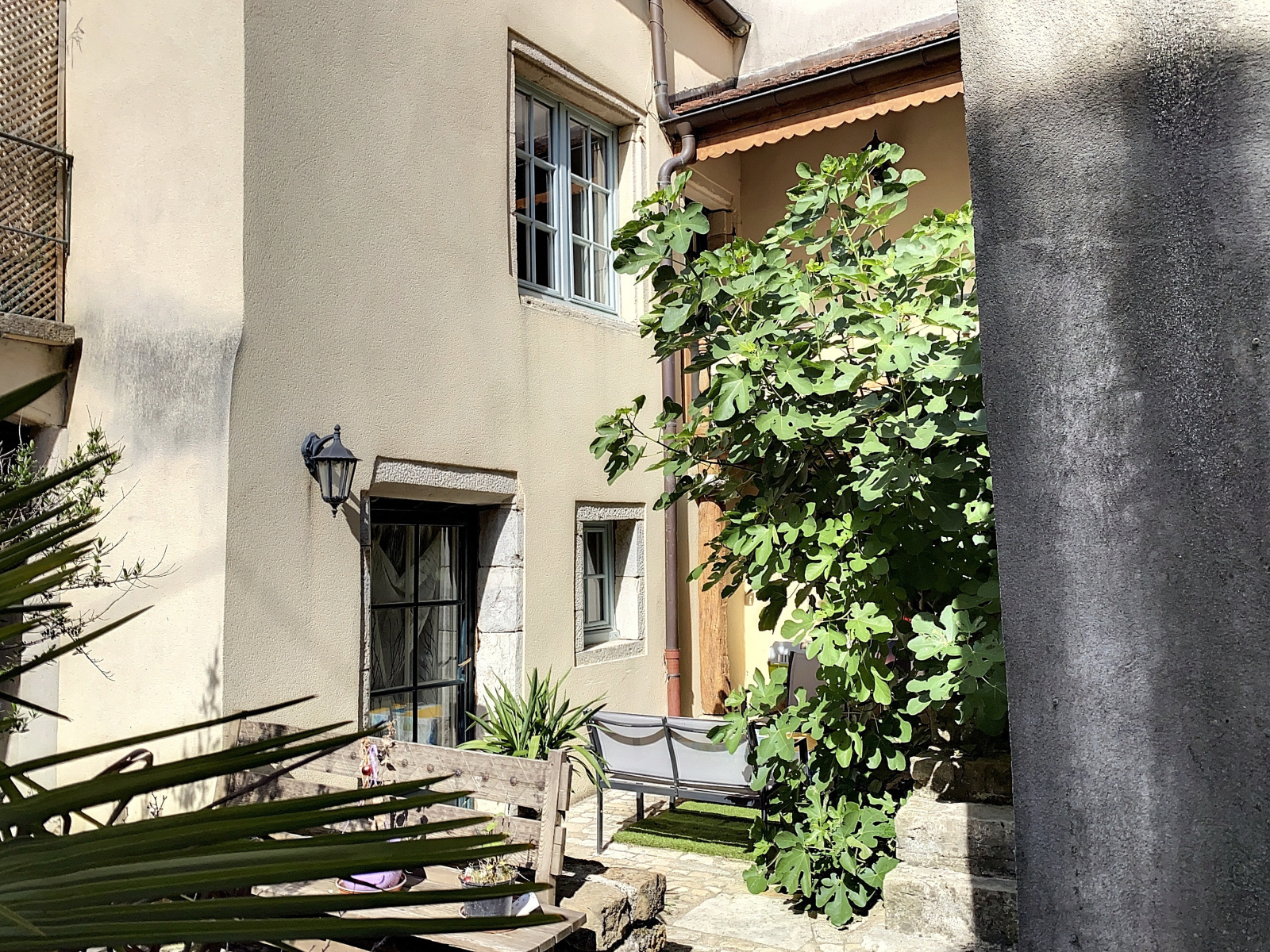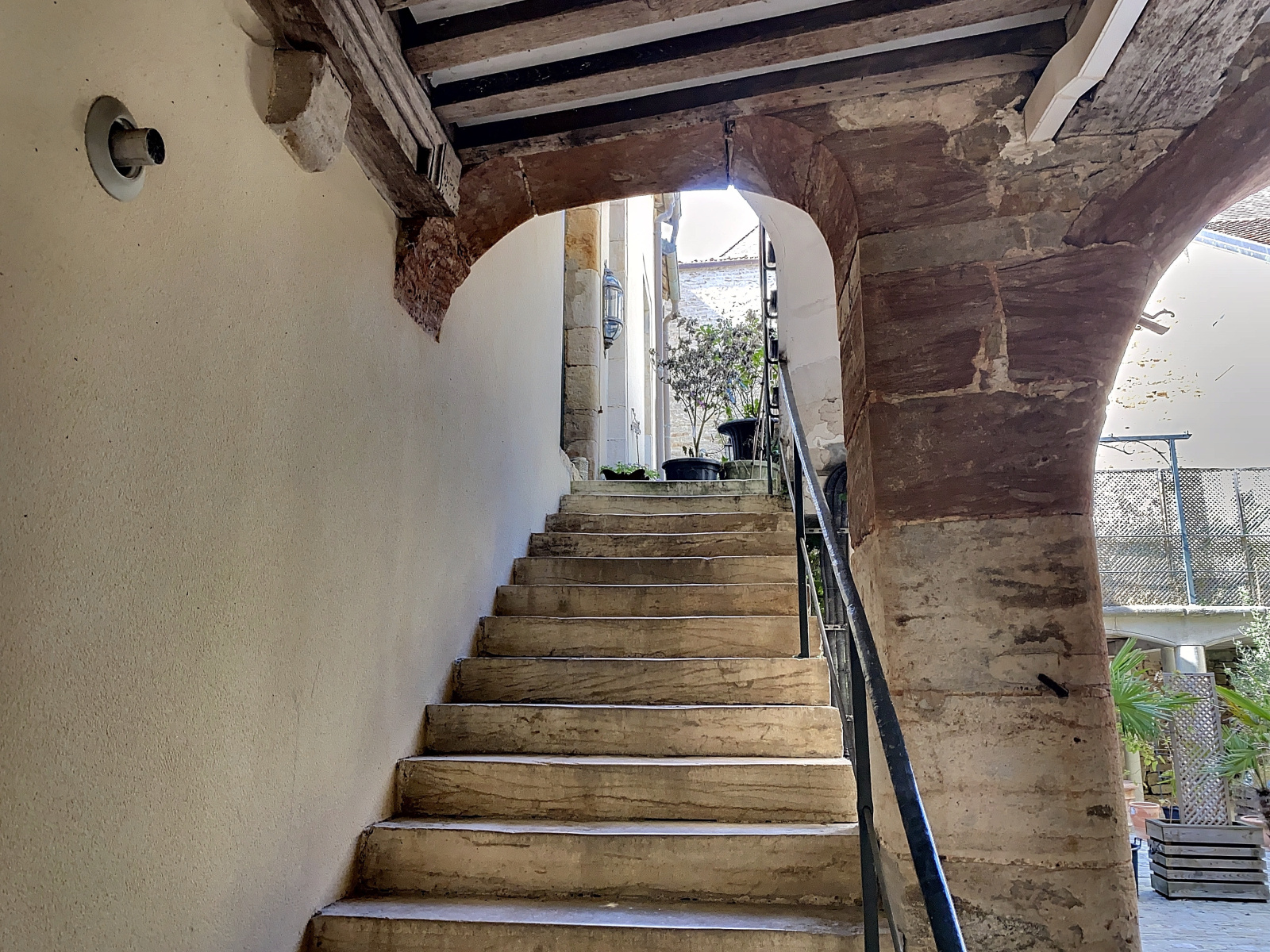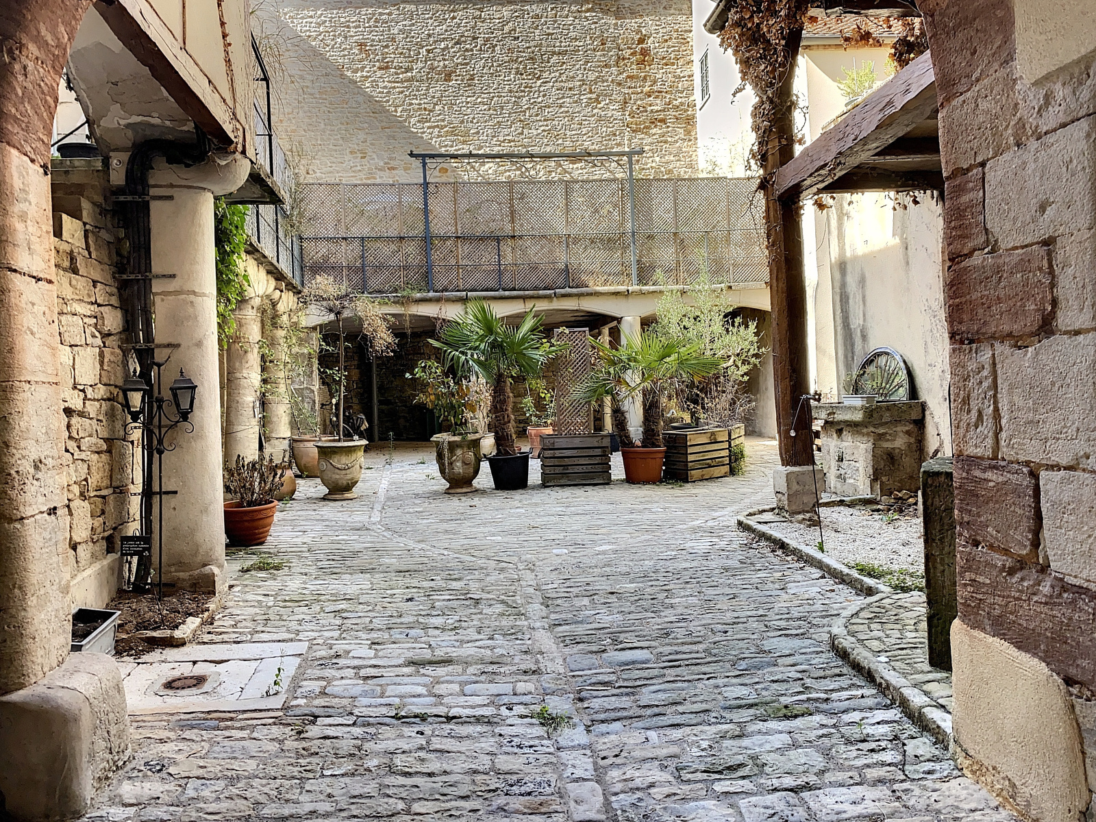 L'entrée se fait par un portail en bois datant du Moyen-âge couvrant l'intégralité du porche. Elle donne sur une superbe cour intérieure pavée avec puits.