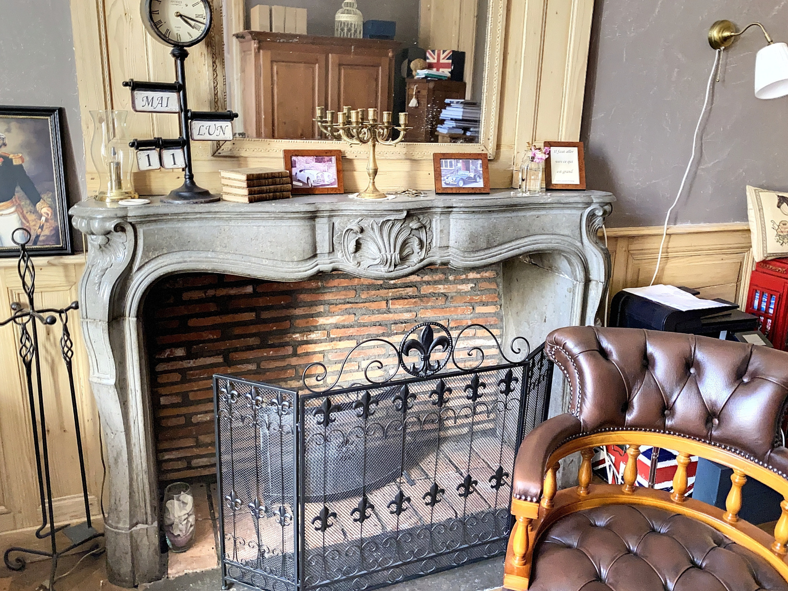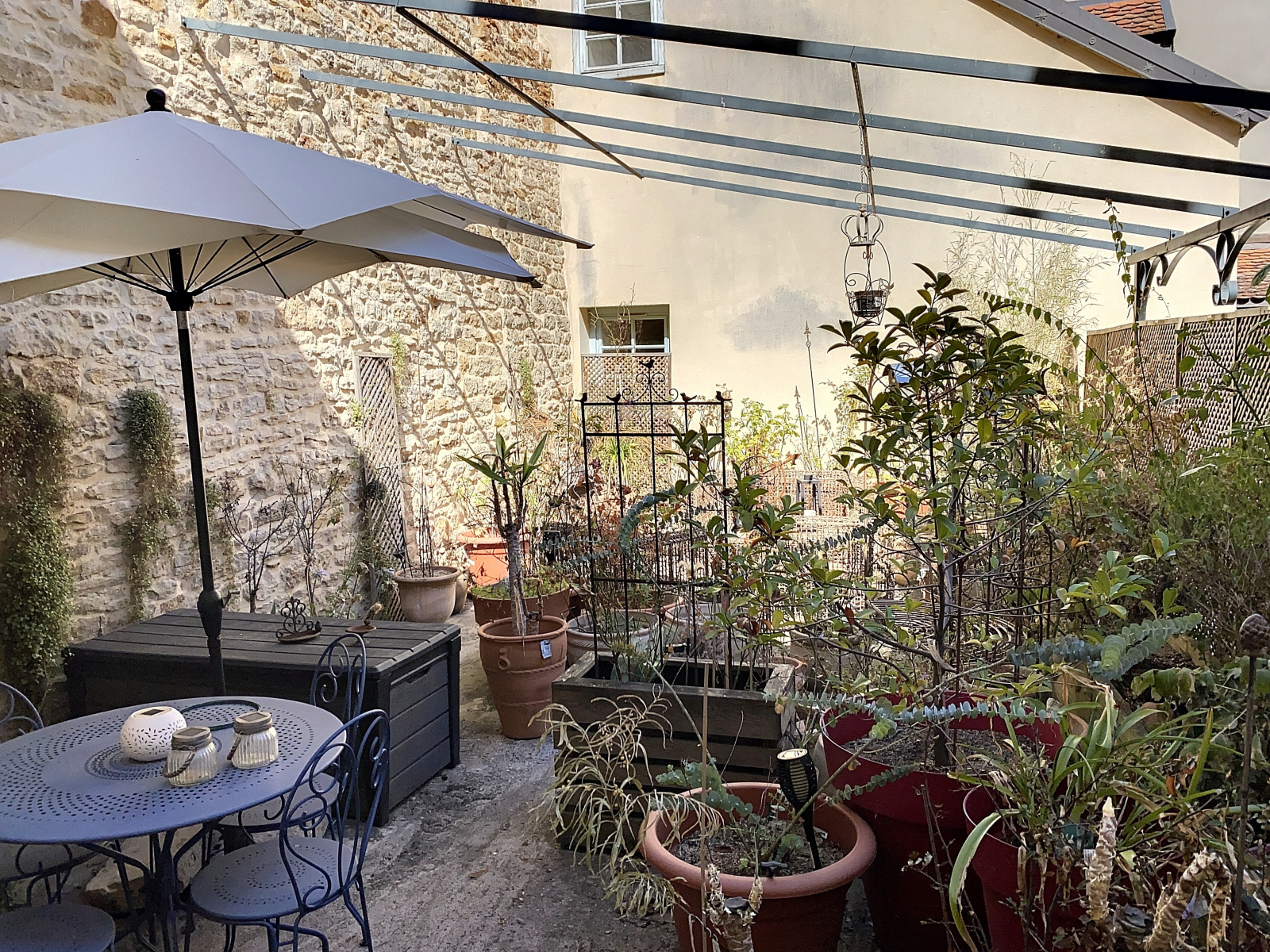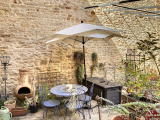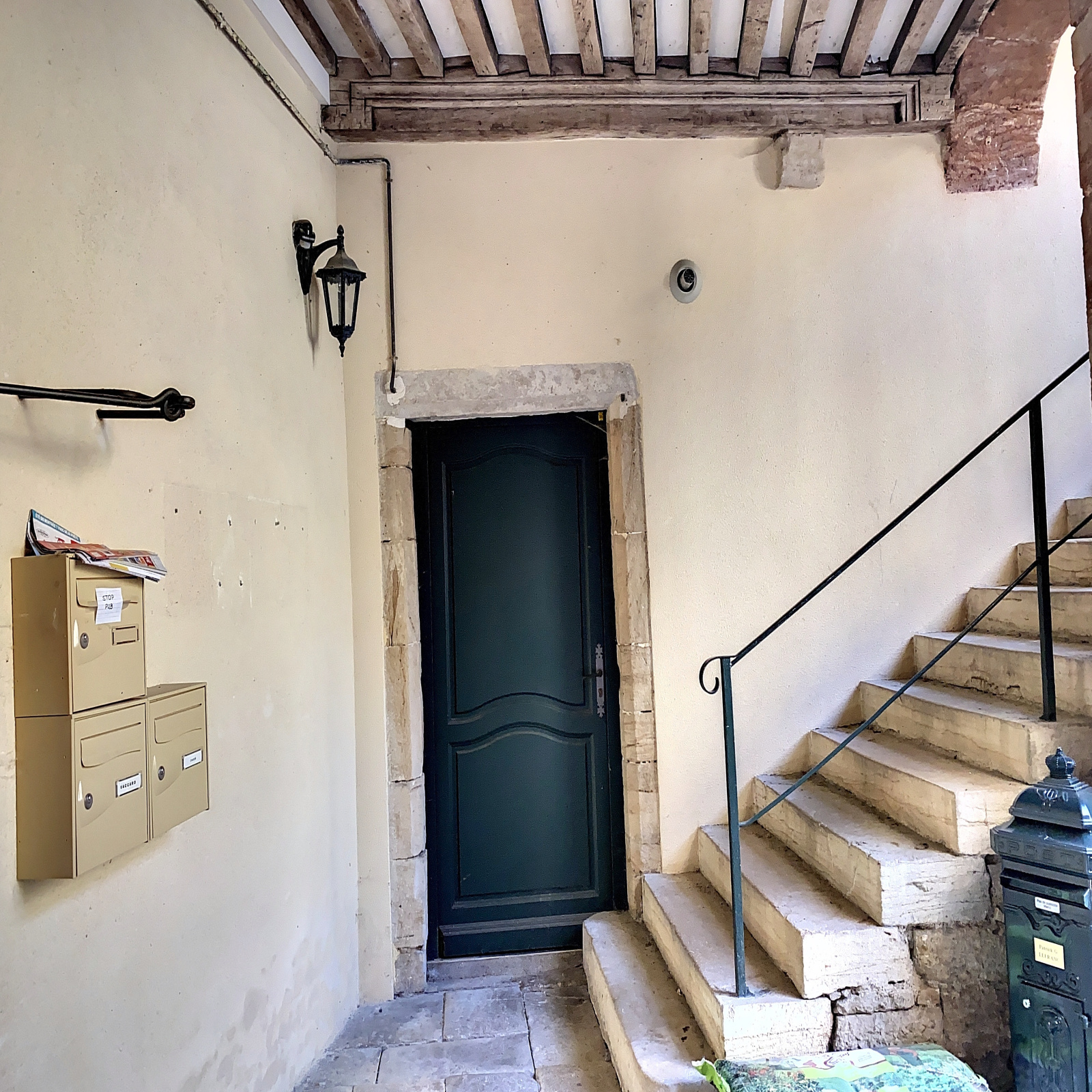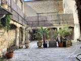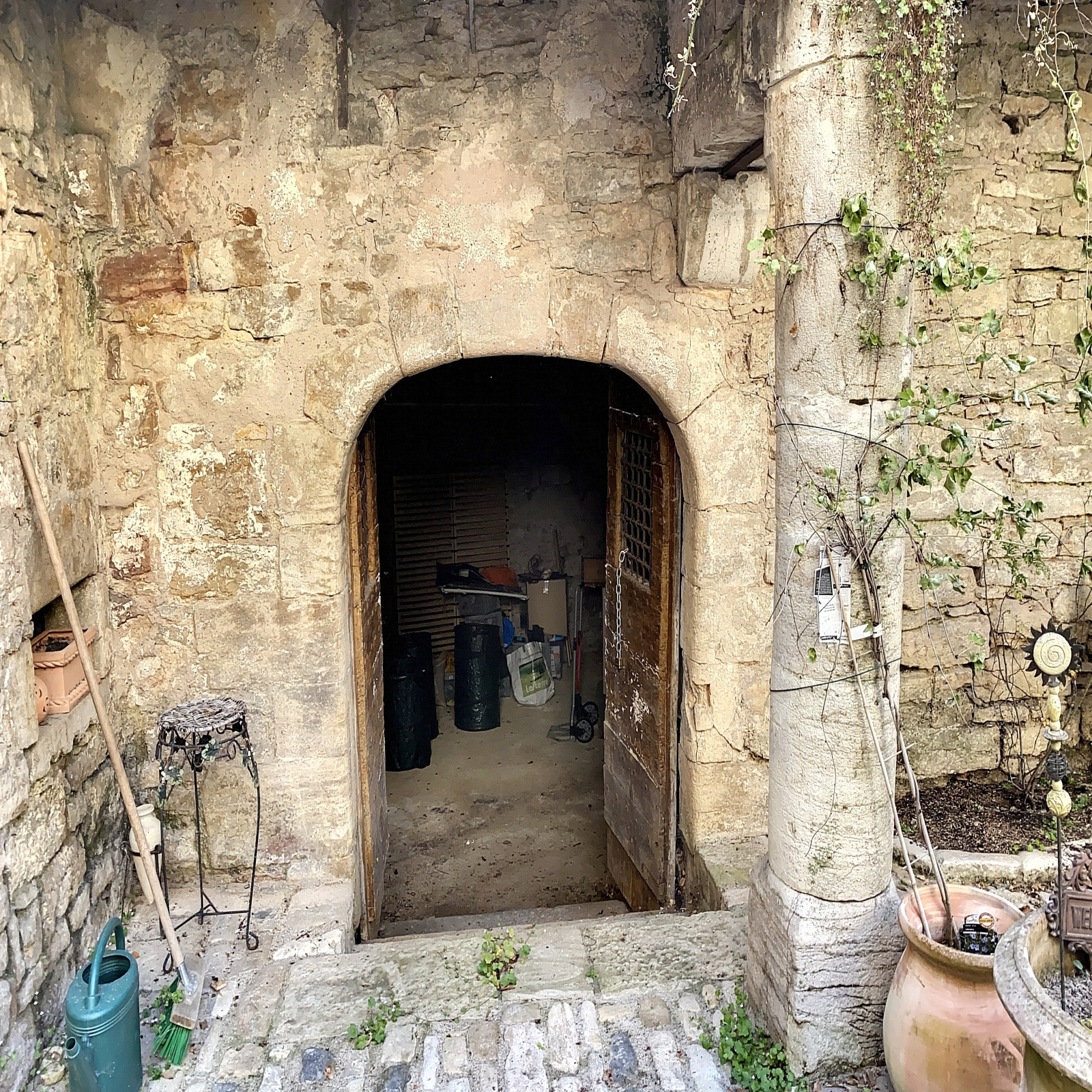 L'entrée se fait par un portail en bois datant du Moyen-âge couvrant l'intégralité du porche. Elle donne sur une superbe cour intérieure pavée avec puits.