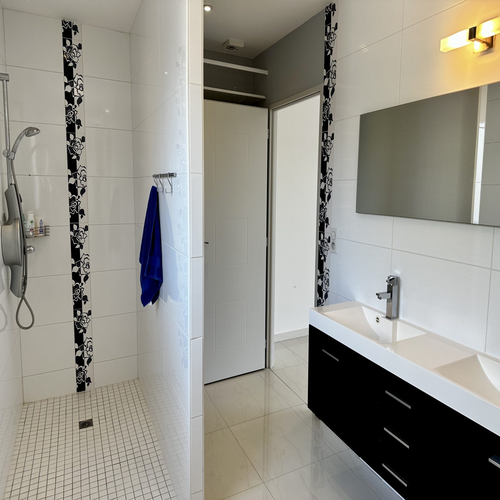 A l’étage : une seconde suite parentale de 20 m2 env. et son grand placard coulissant avec salle d’eau et WC, donnant sur une terrasse privée, un 3èmechambre, une mezzanine pouvant servir d’espace bureau avec rangements