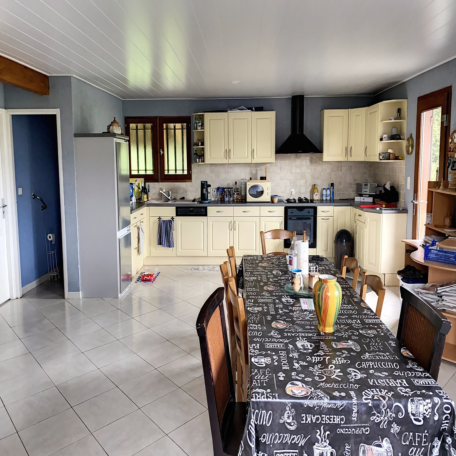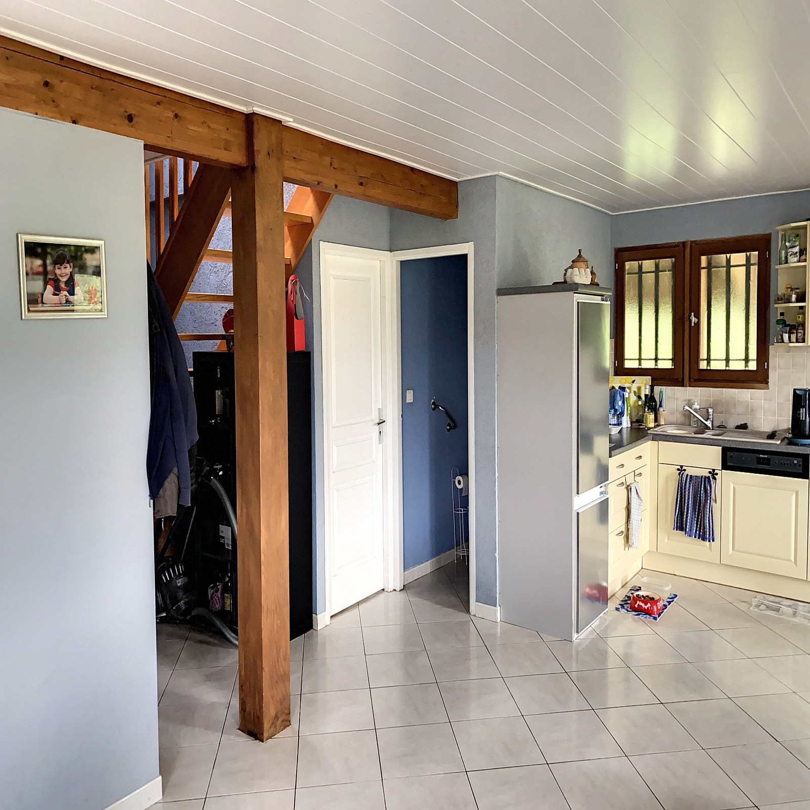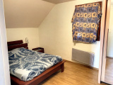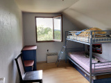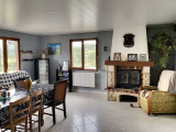 La maison ossature bois (90 m² env) comprend une entrée sur salle à manger / salon ouvert sur cuisine équipée avec cheminée, une chambre, salle d'eau, wc au rez-de-chaussée ; 3 belles chambres à l'étage.