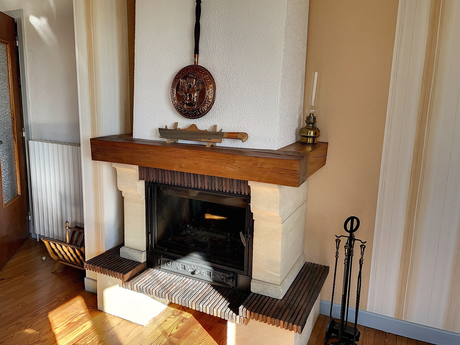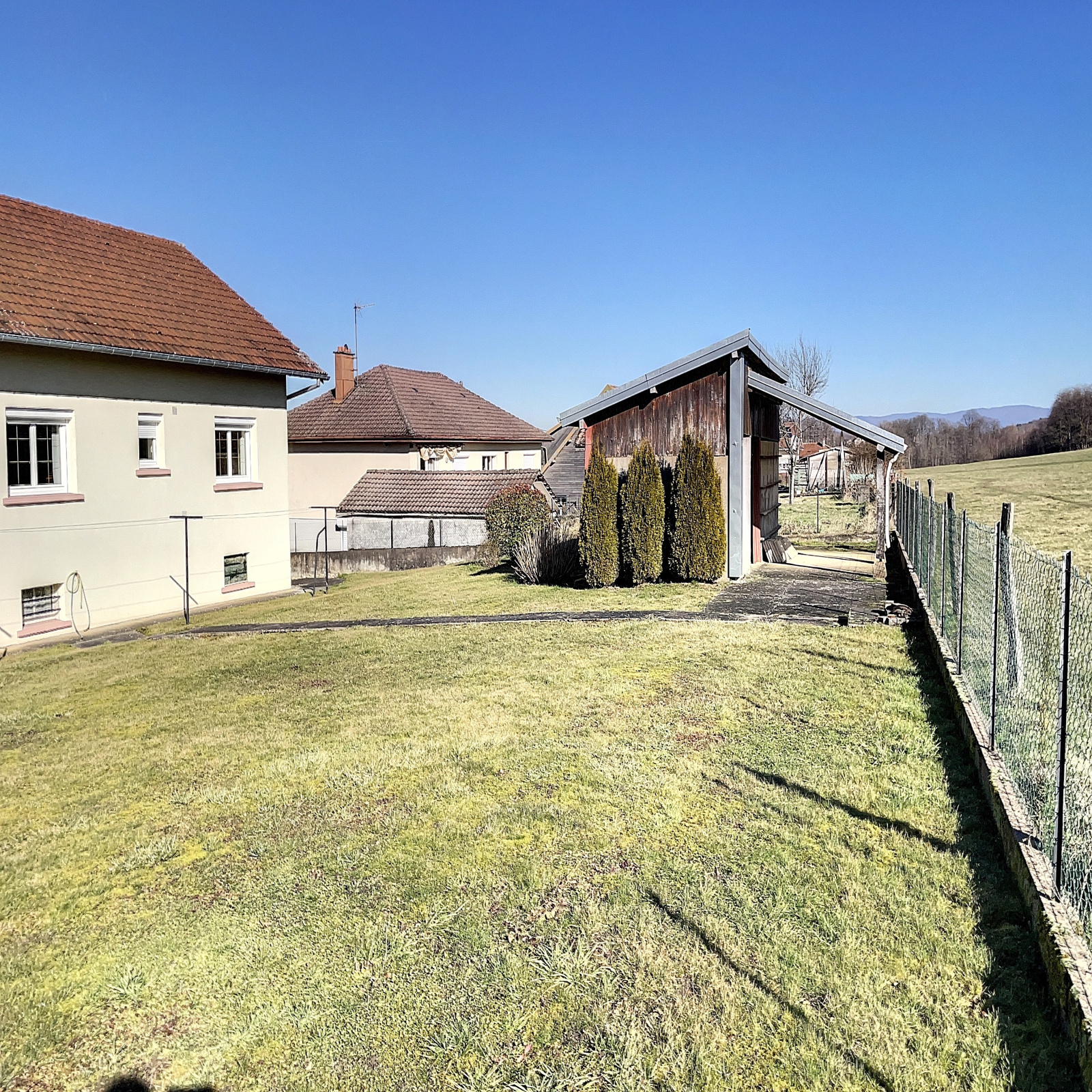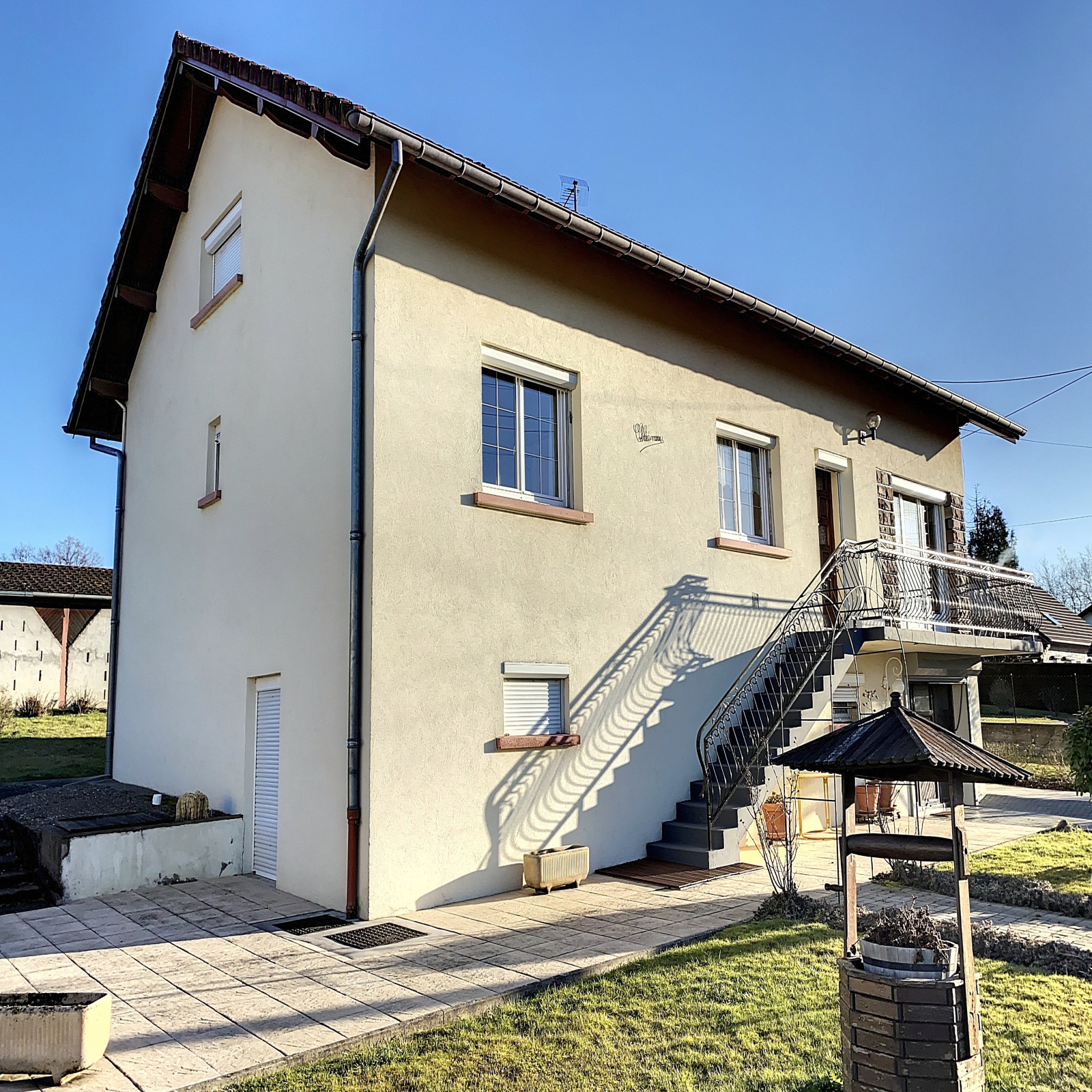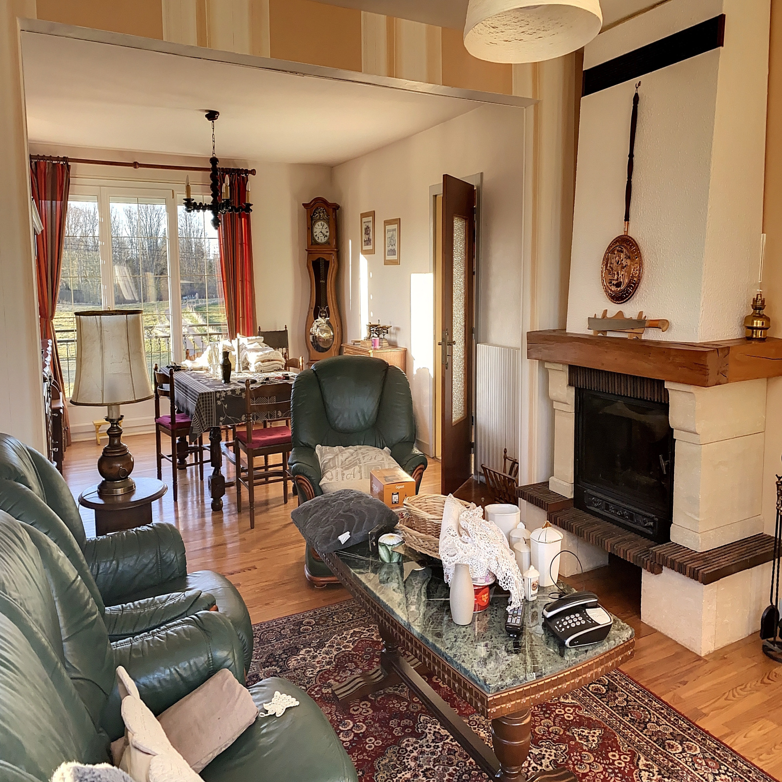 Au niveau de vie : entrée sur dégagement (11 m2 env), cuisine équipée (12 m2 env), salle à manger / salon avec cheminée insert et balcon (33 m2 env), 3 chambres (13, 13 et 13 m2 env), salle de bains (8 m2 env), wc.