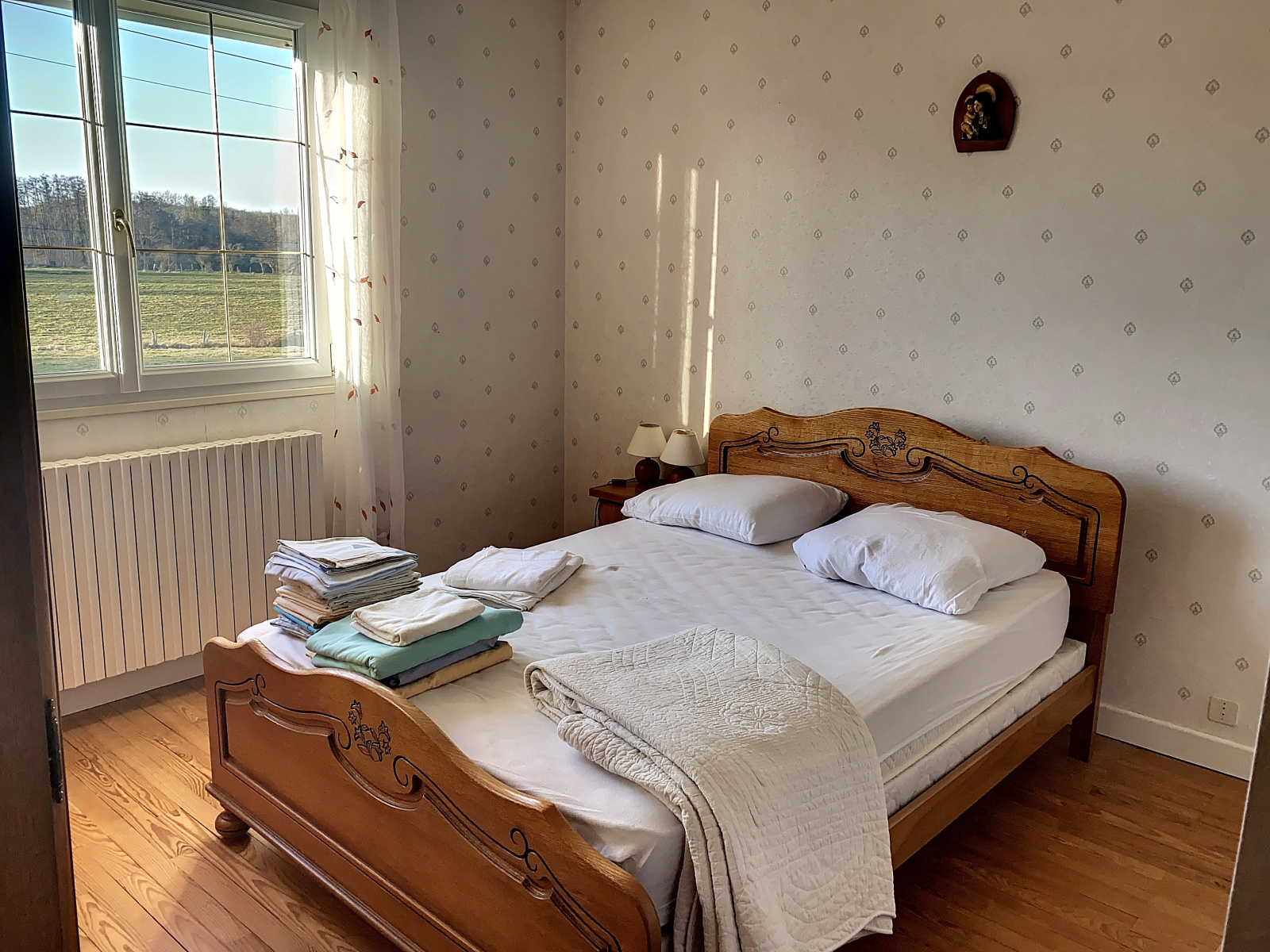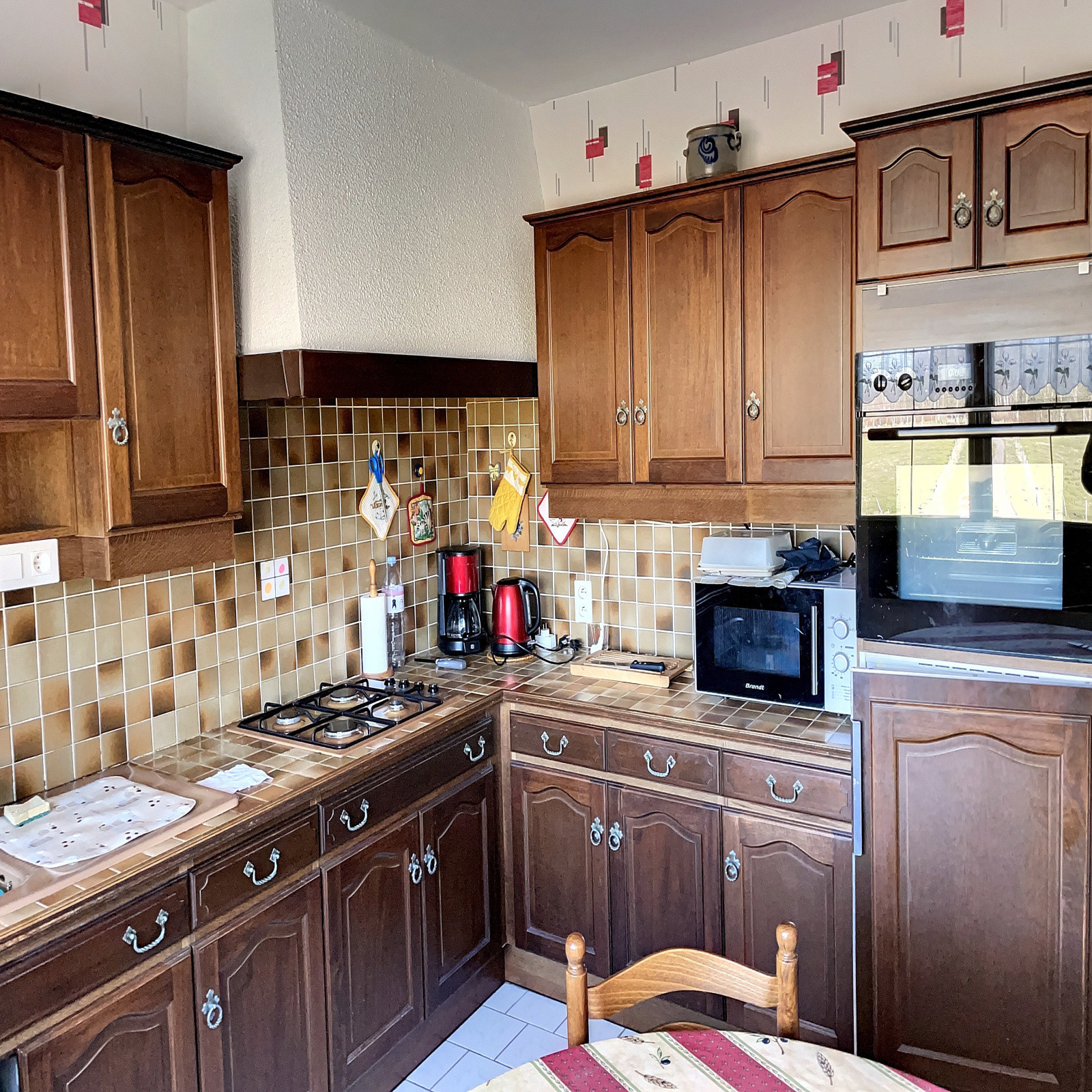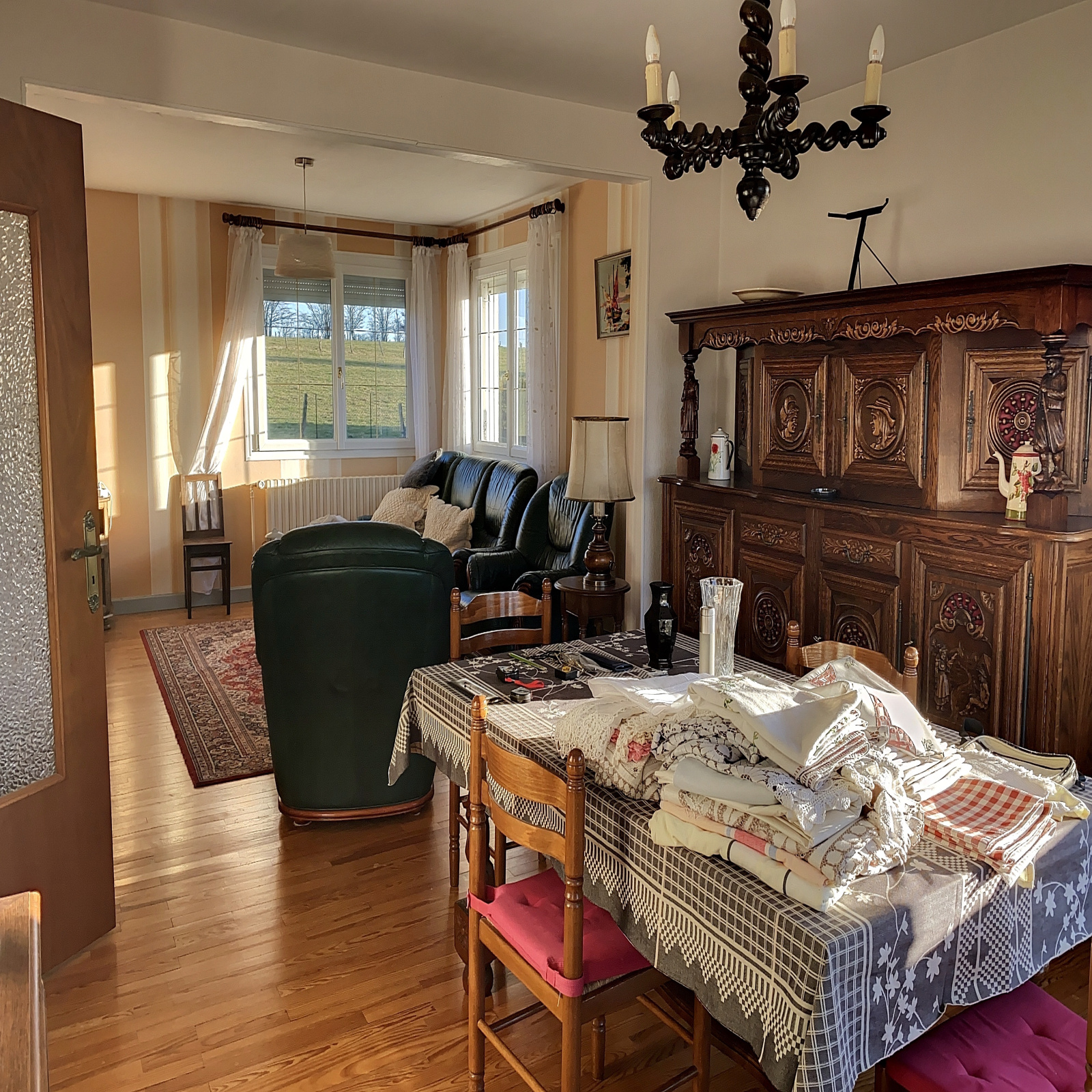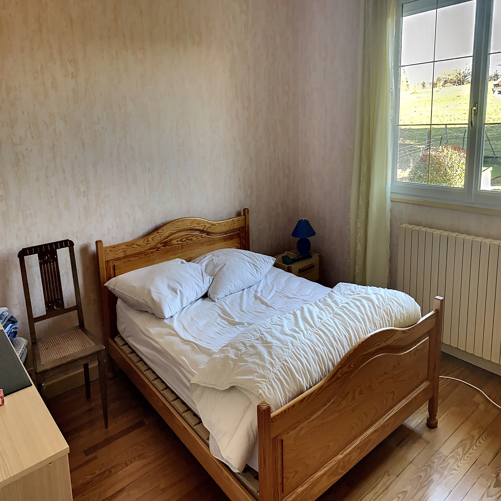 Au niveau de vie : entrée sur dégagement (11 m2 env), cuisine équipée (12 m2 env), salle à manger / salon avec cheminée insert et balcon (33 m2 env), 3 chambres (13, 13 et 13 m2 env), salle de bains (8 m2 env), wc.