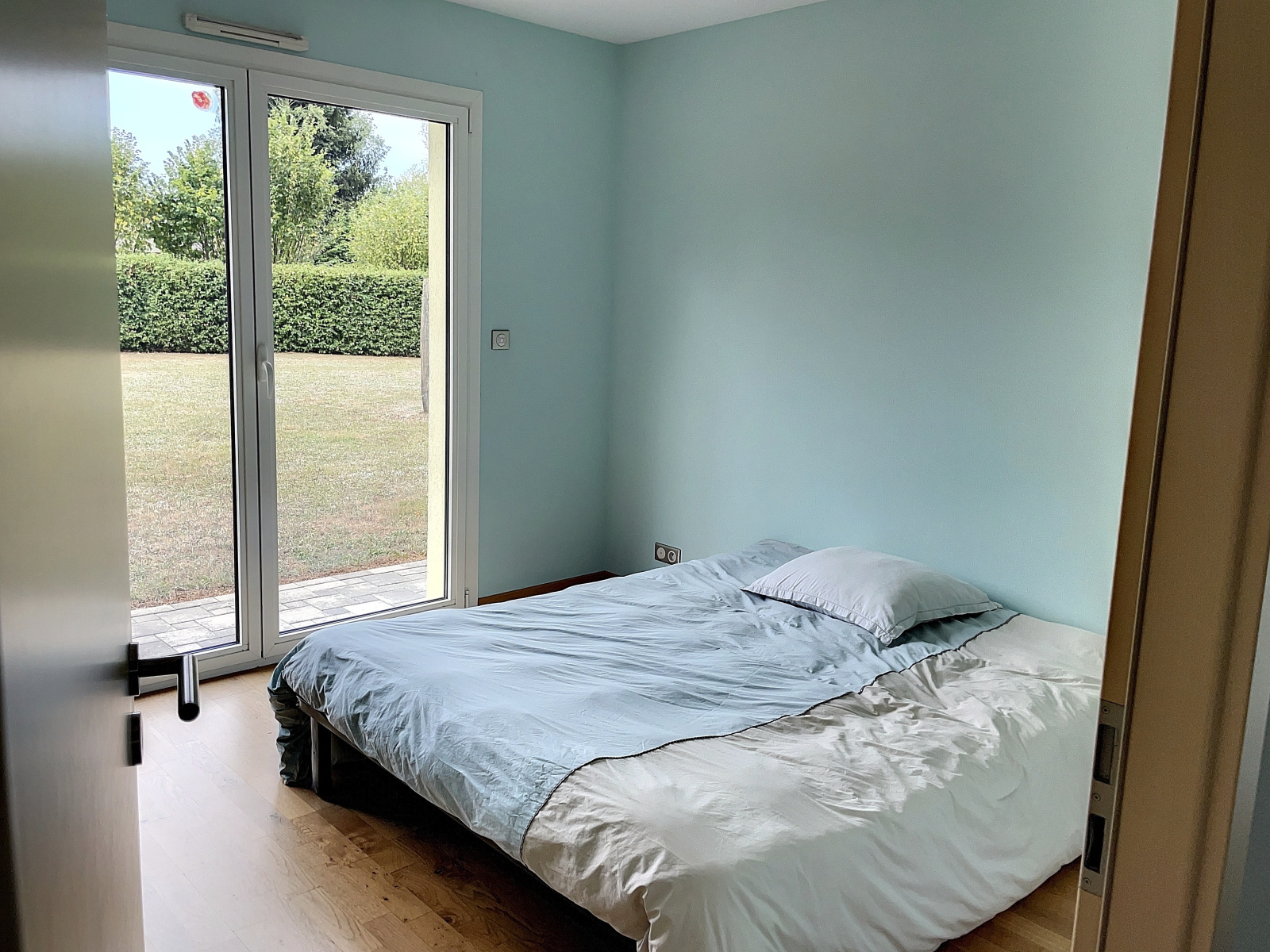 Au rez-de-chaussée : une entrée, une cuisine équipée ouverte sur grand salon / séjour lumineux avec accès terrasse, une chambre parentale (chambre avec dressing, accès extérieur, accès direct salle de bains), une 2ème chambre avec accès extériieur, salle de bains, wc, buanderie.