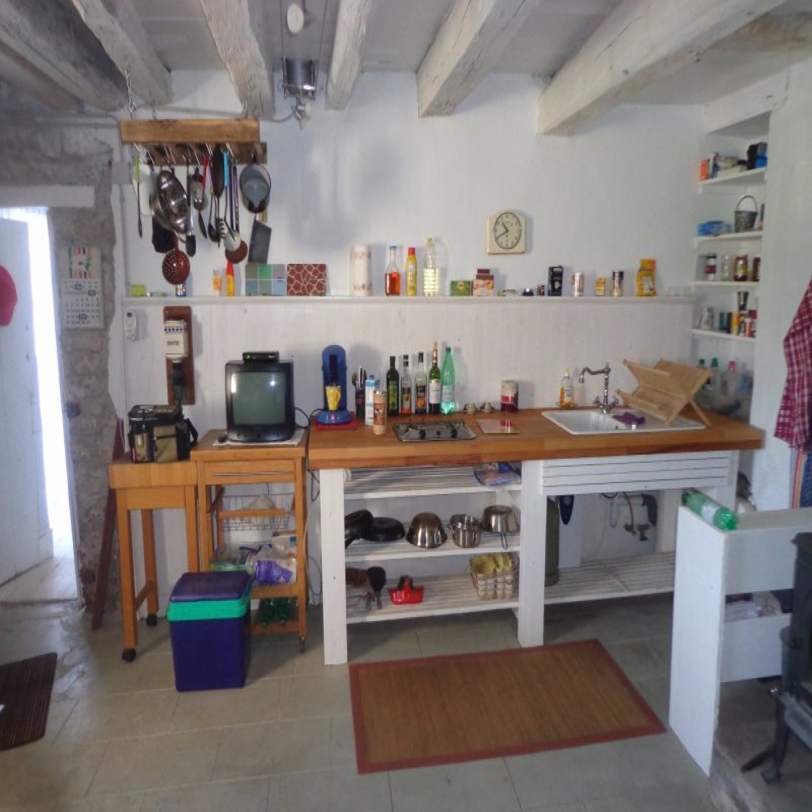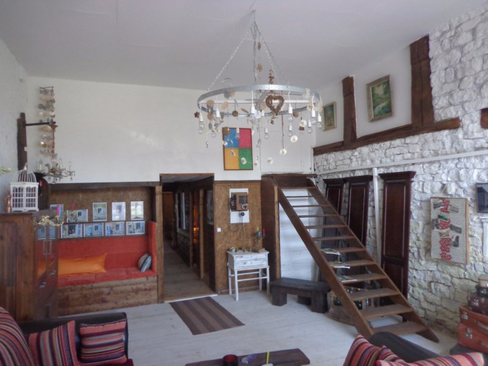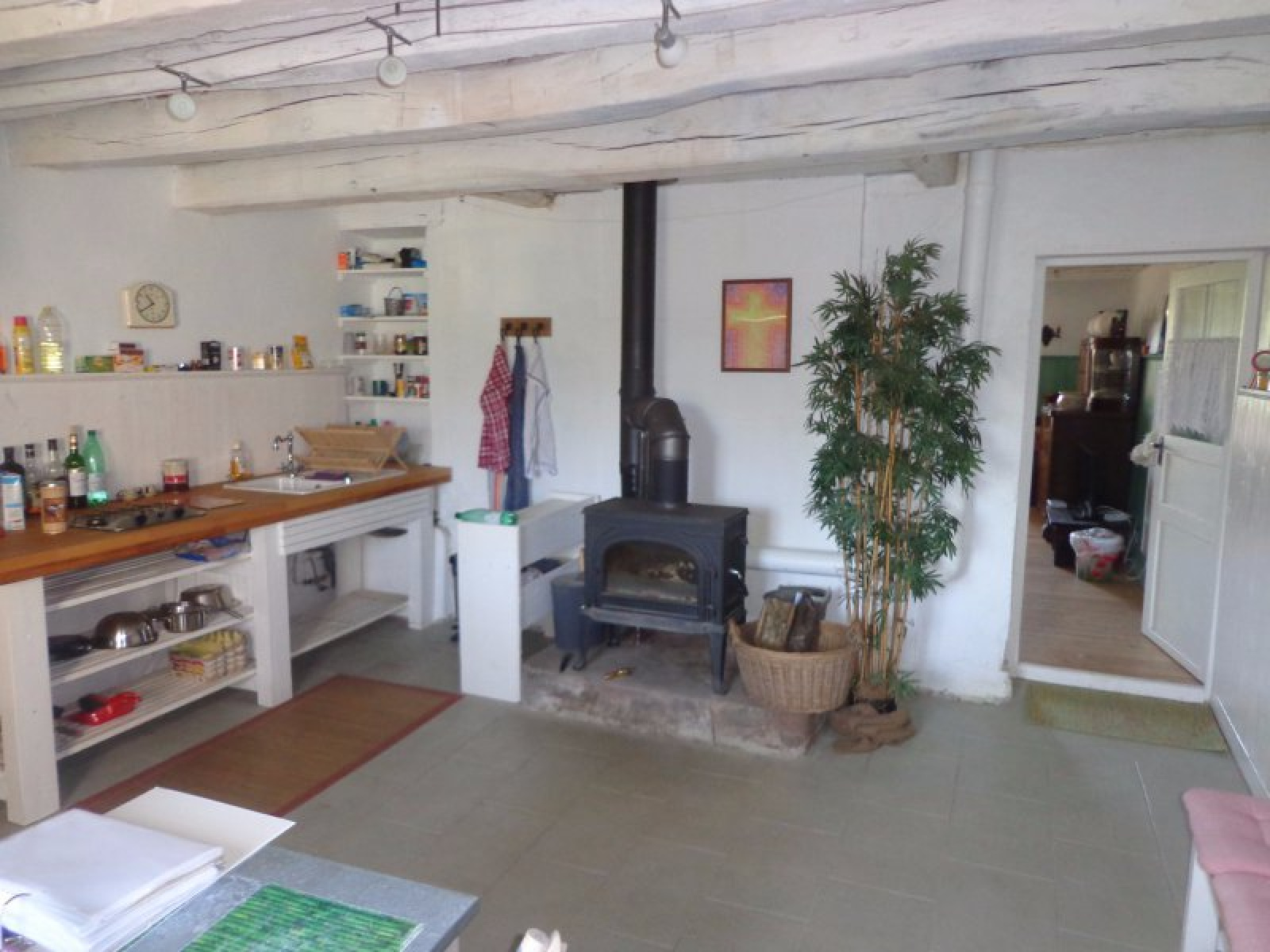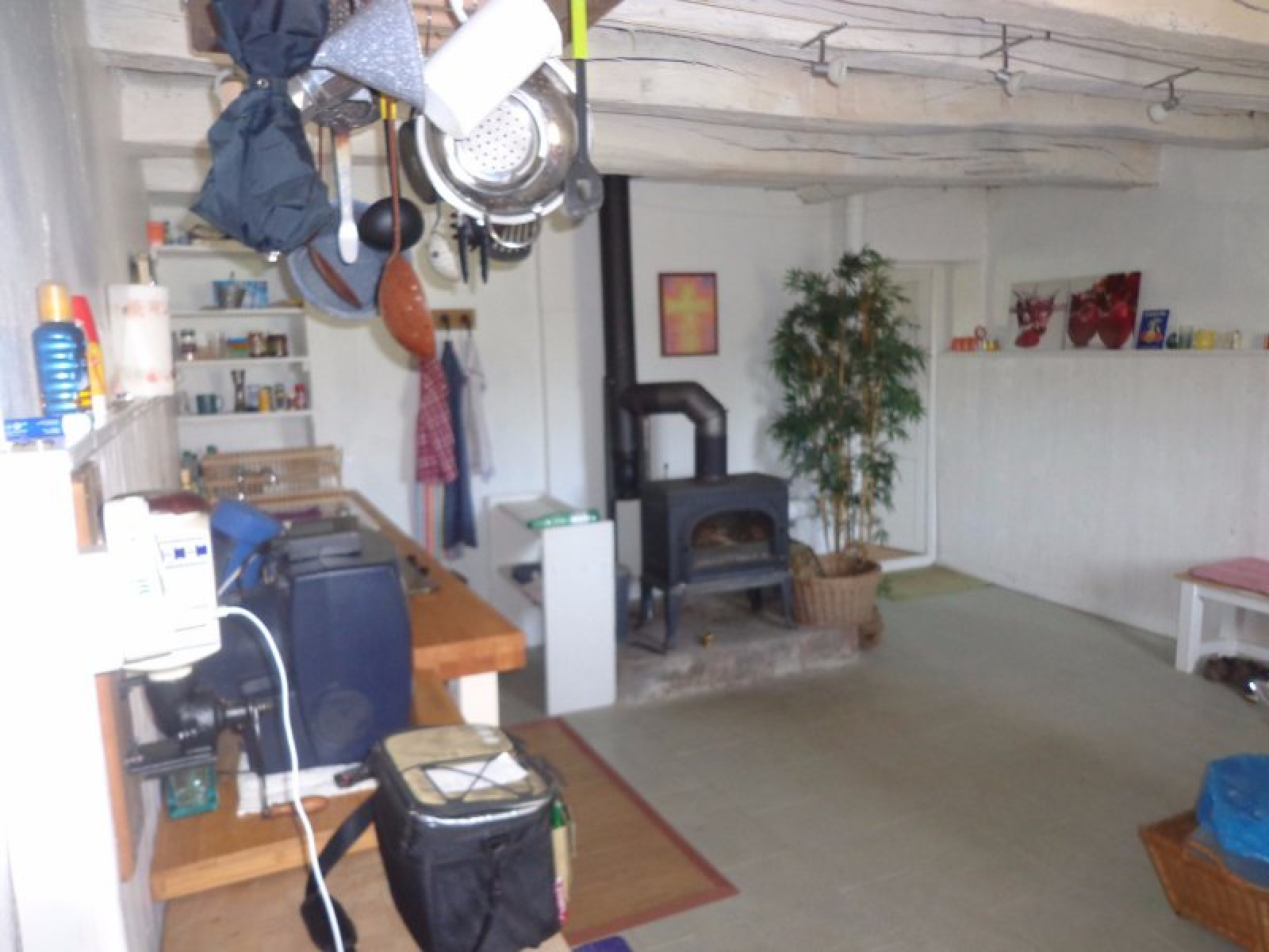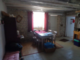 Au rez-de-chaussée : entrée sur cuisien avec poêle à bois, salle à manger avec accès extérieur, salon, coin repos (chambre), salle d'eau avec wc, coin atelier.