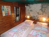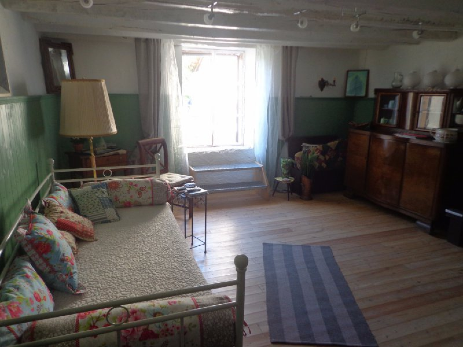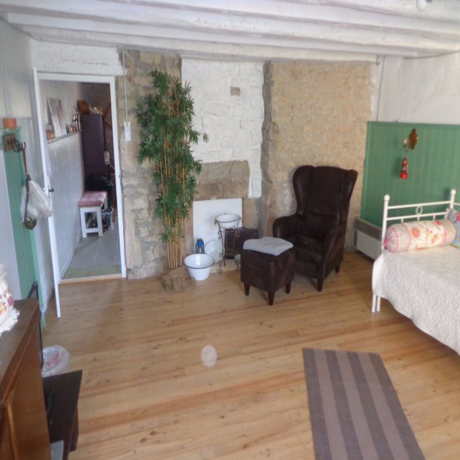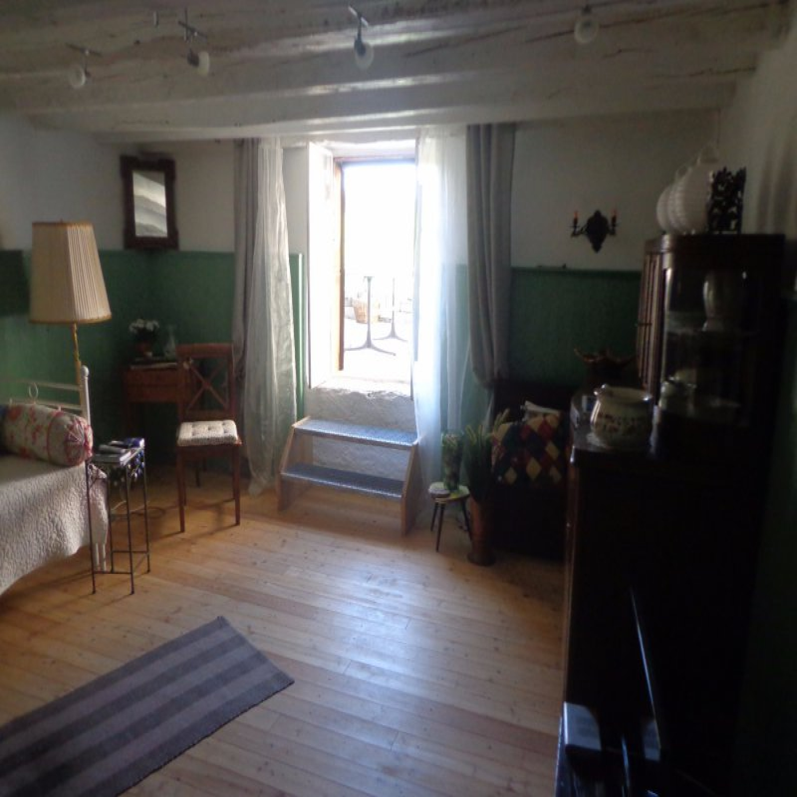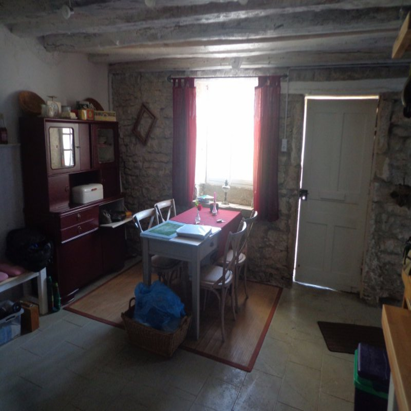 Au rez-de-chaussée : entrée sur cuisien avec poêle à bois, salle à manger avec accès extérieur, salon, coin repos (chambre), salle d'eau avec wc, coin atelier.