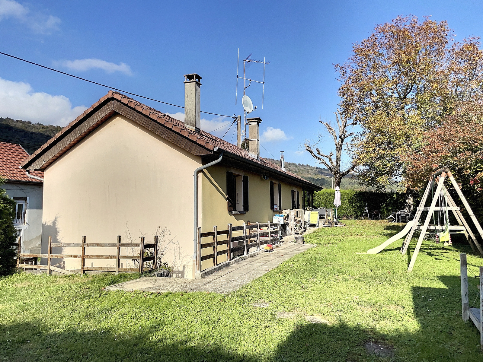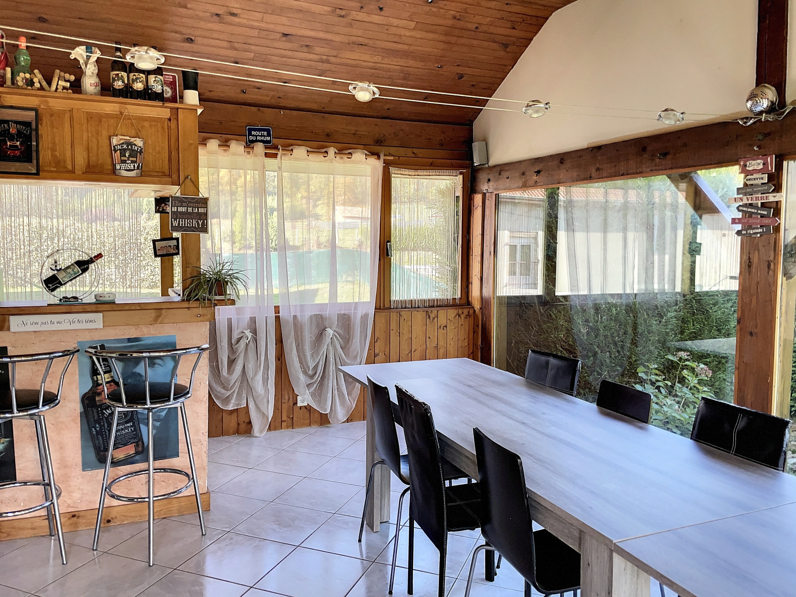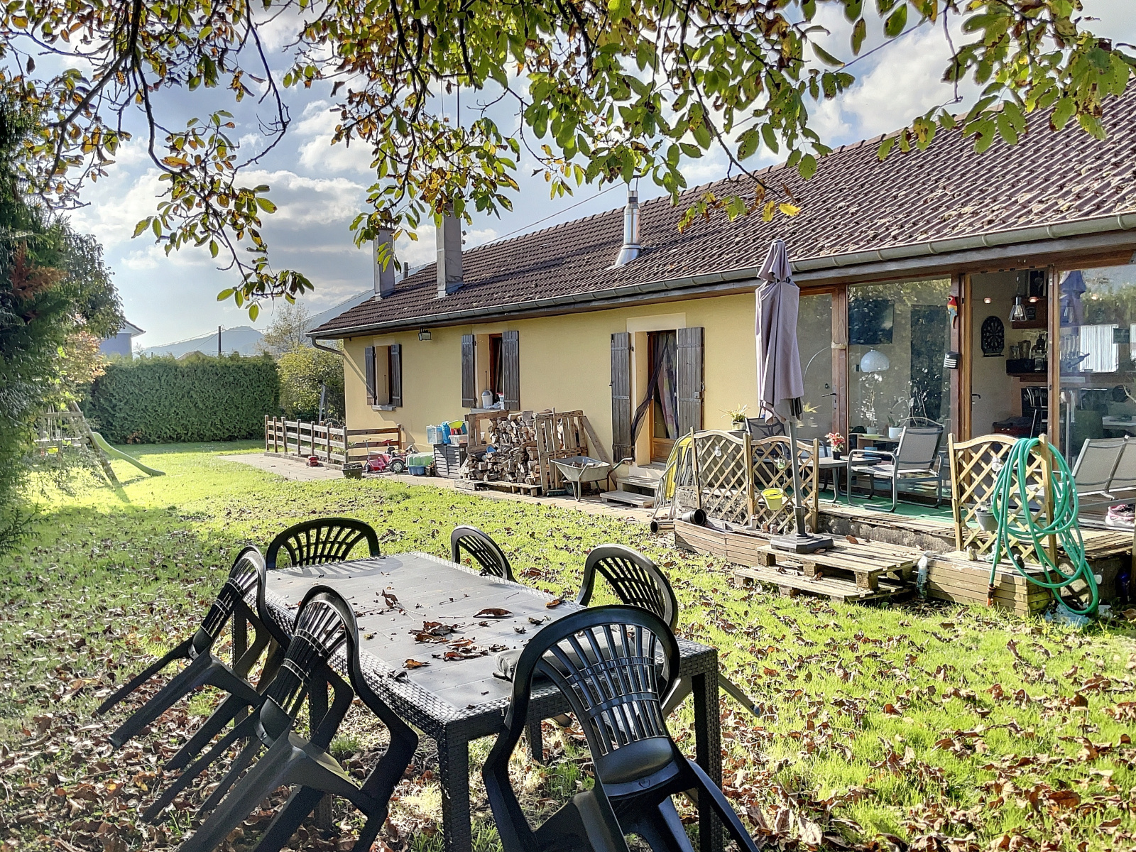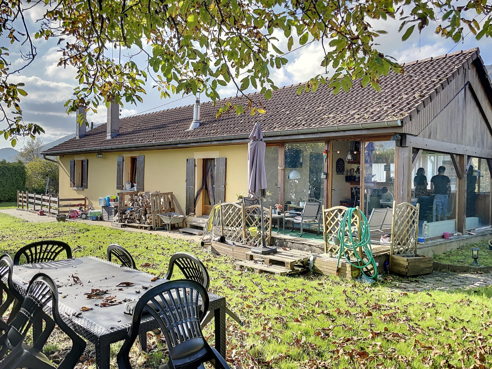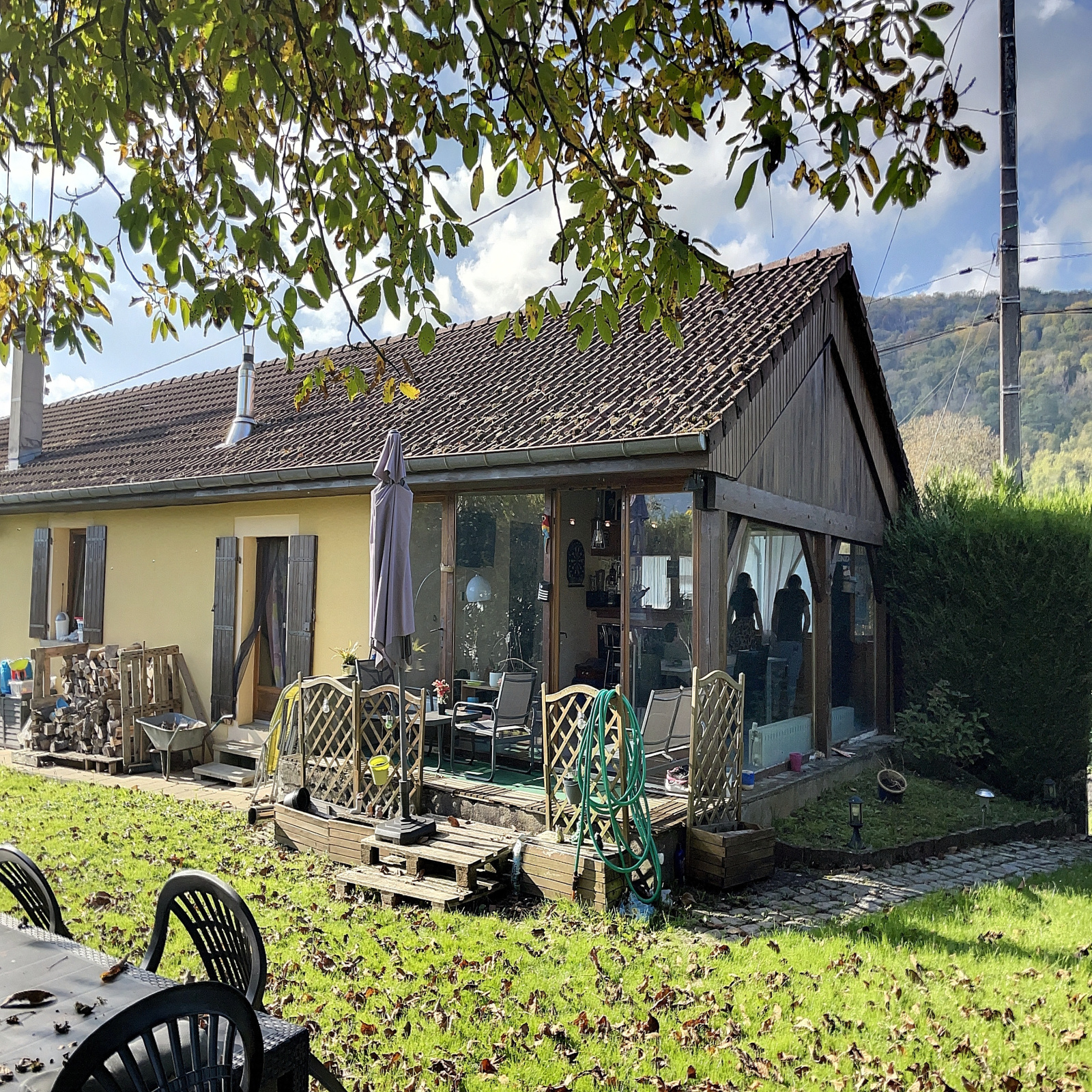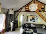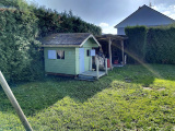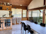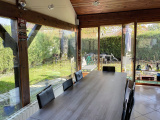 Au rez-de-jardin : entrée sur véranda, salle à manger / salon ouverte sur cuisine équipée avec poêle à bois, 2 chambres, wc.