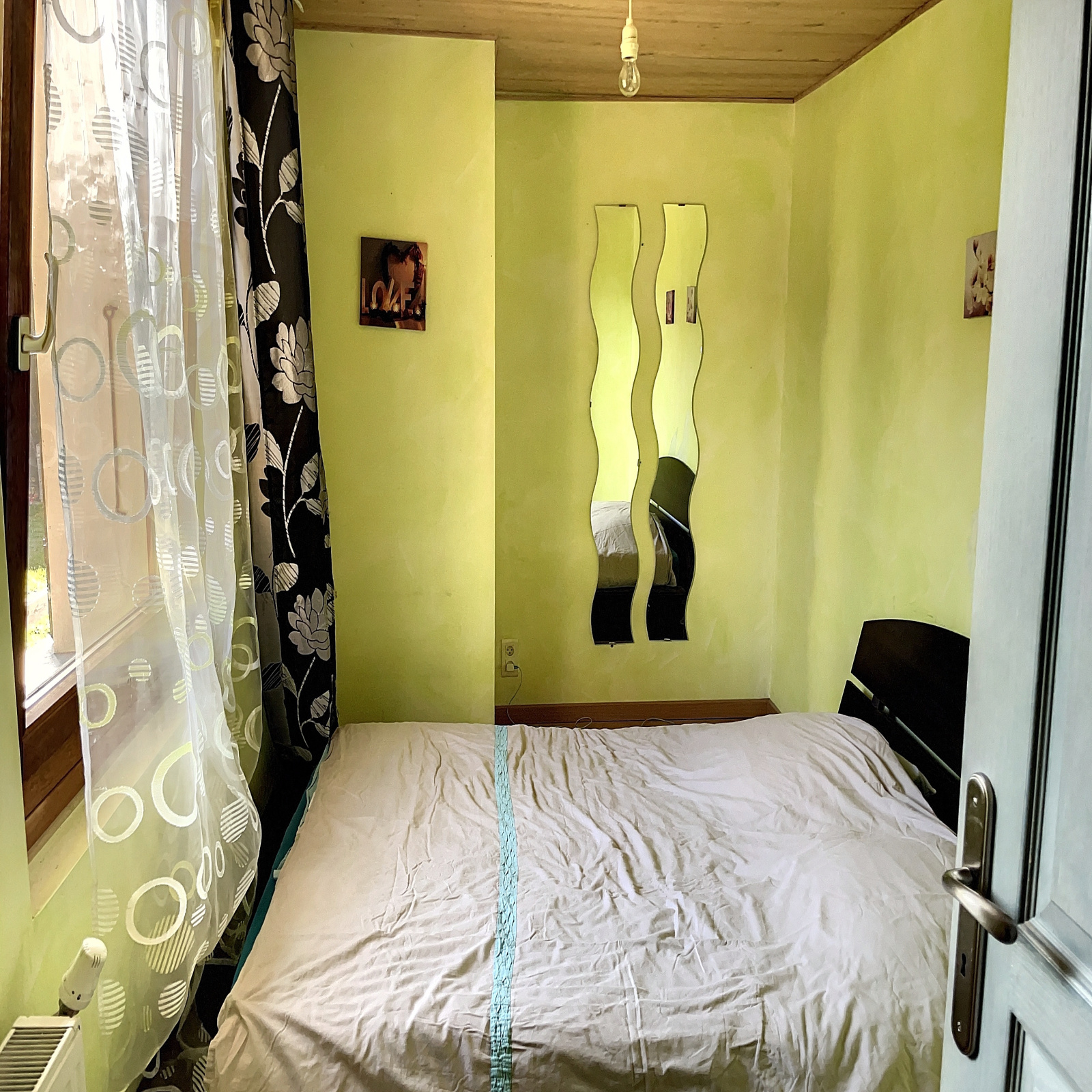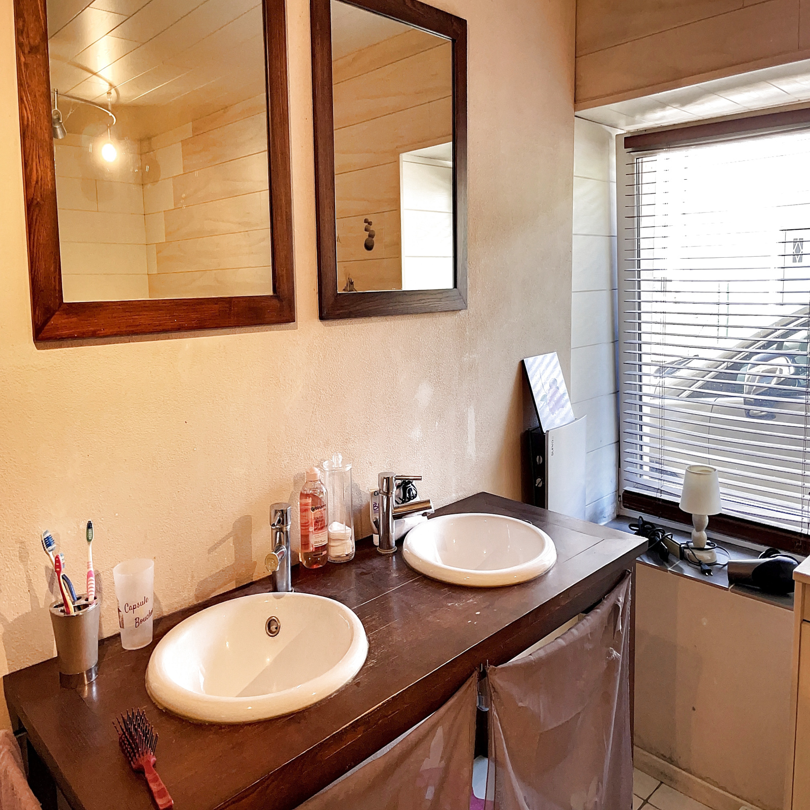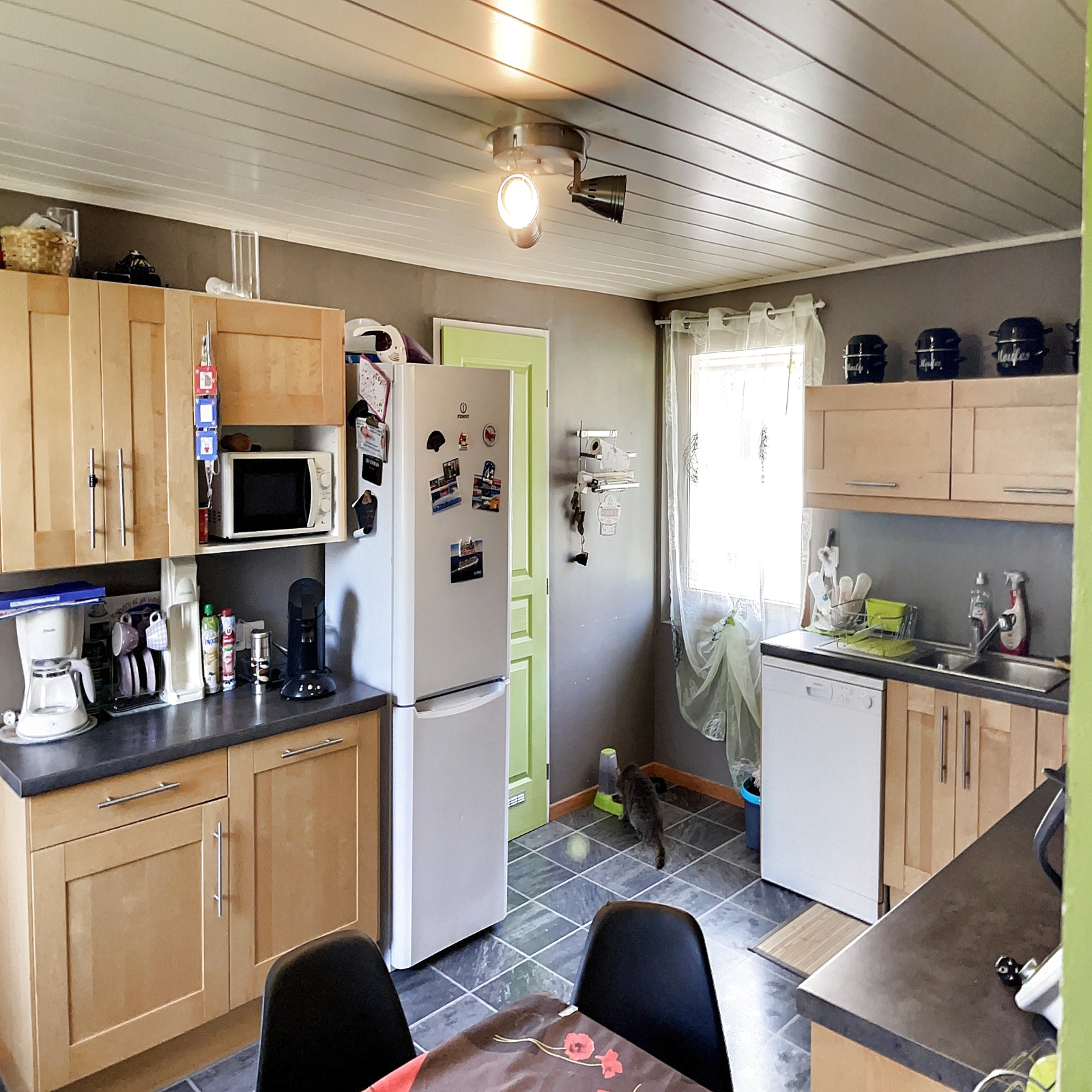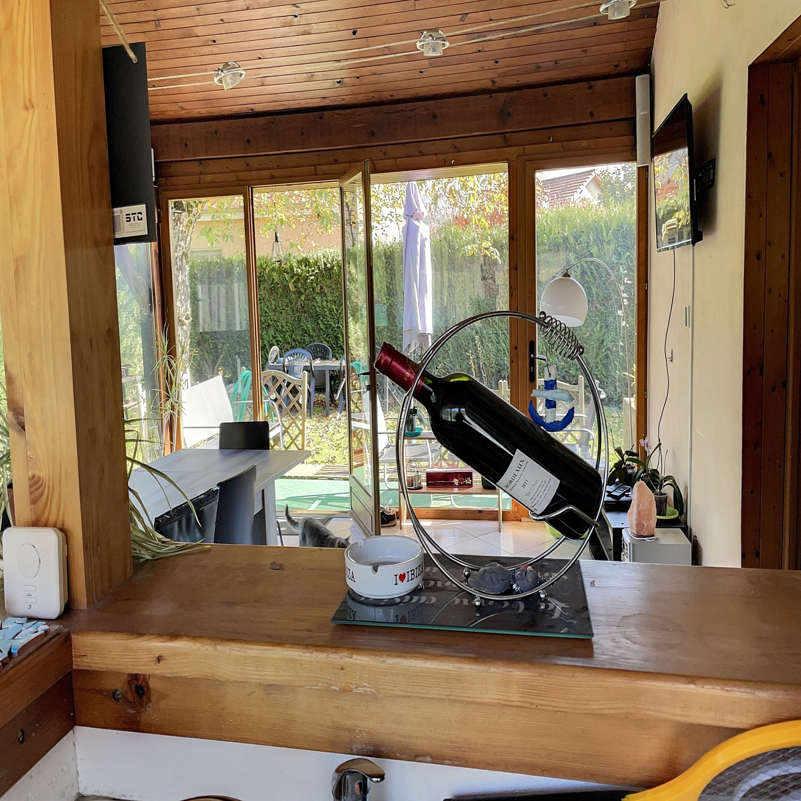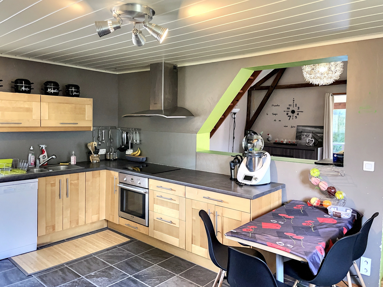 Au rez-de-jardin : entrée sur véranda, salle à manger / salon ouverte sur cuisine équipée avec poêle à bois, 2 chambres, wc.