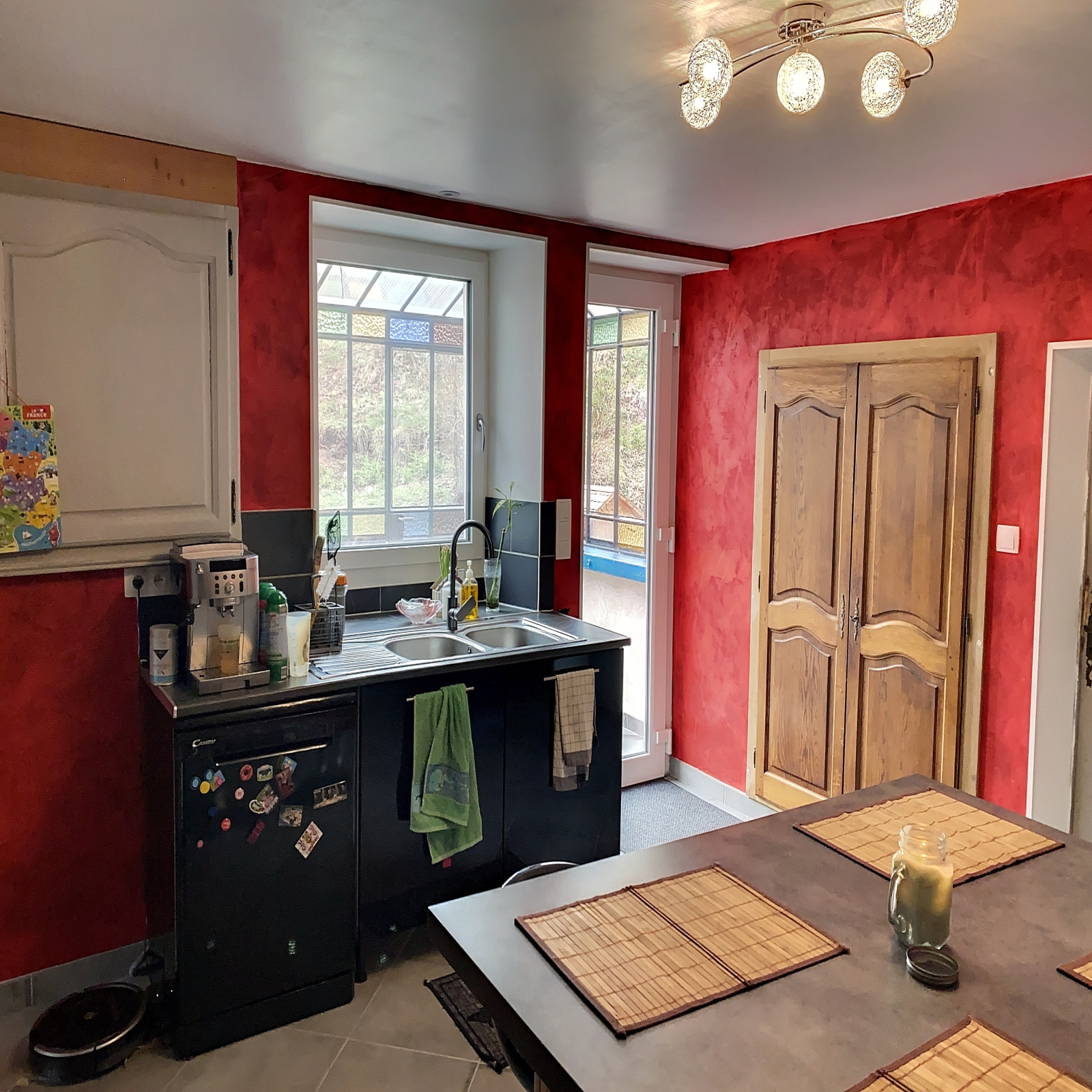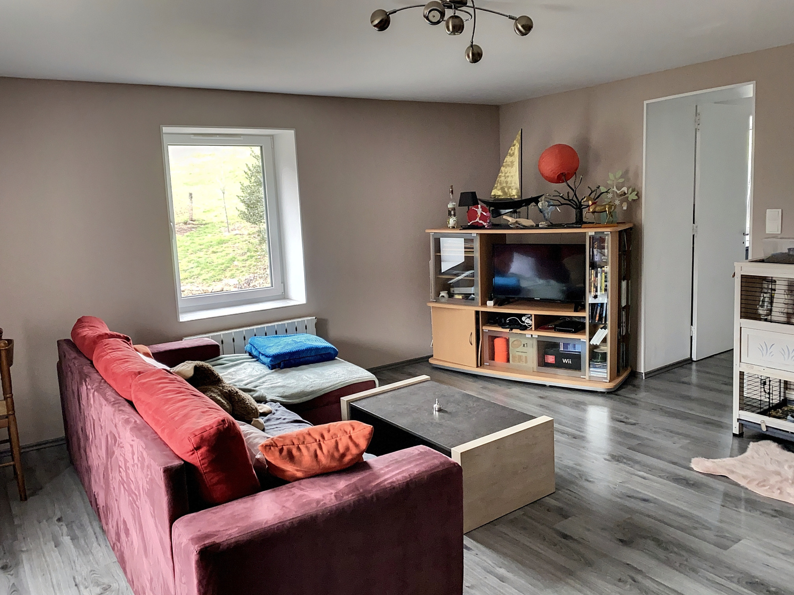 Une ferme rénovée composée d'une entrée sur petite véranda, cuisine de 20 m² env avec cheminée en pierre (tubée), salle à manger (25 m² env), salle de bains (5.5 m² env), wc, cellier (7.4 m² env) au rez-de-chaussée ; séjour (25 m² env), une chambre (20 m² env) au 1er étage ; une chambre (25 m² env) au 2ème étage. Chauffage central bois.