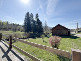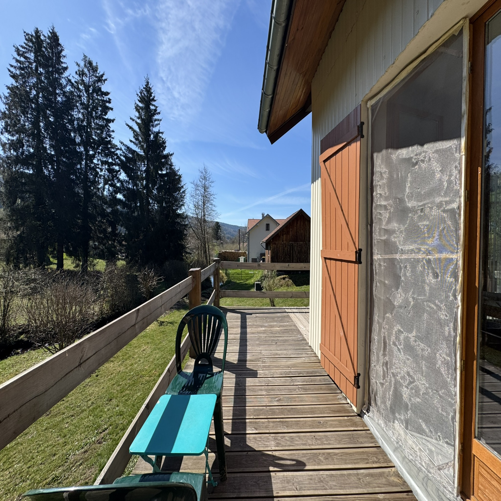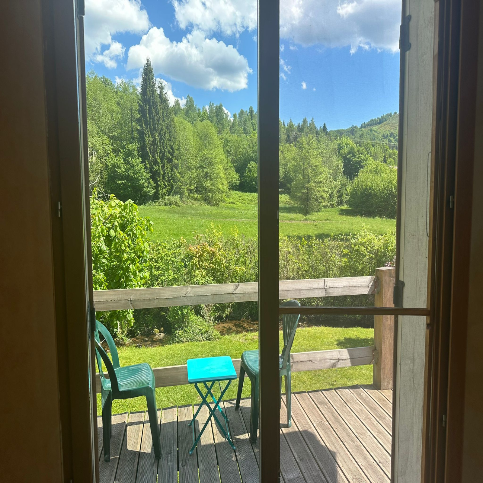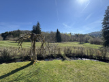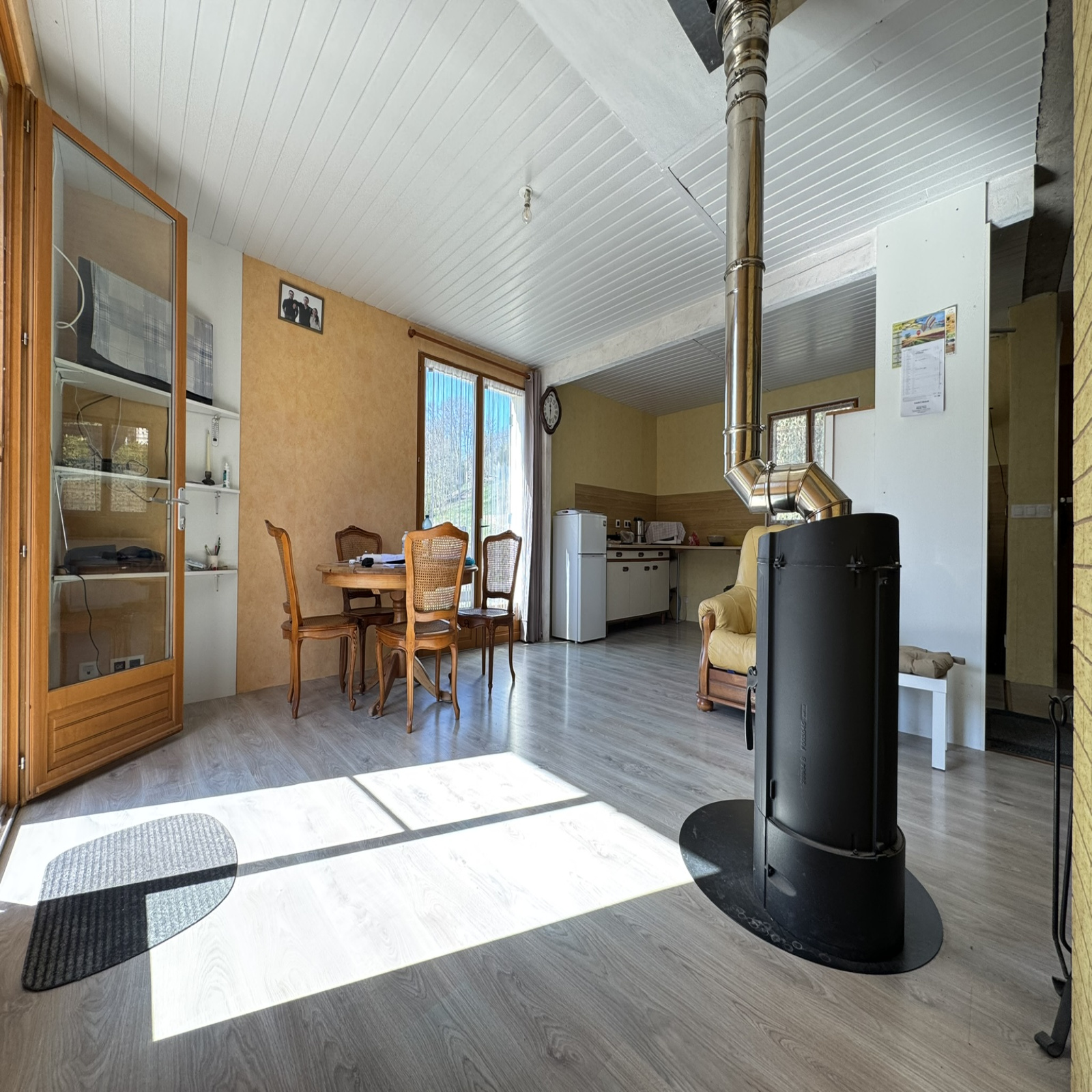 Au rez-de-chaussée : entrée ouverte sur la cuisine/salon avec poêle à bois, accès sur balcon/terrasse avec vue sur un cours d'eau et les montagnes, une chambre, salle d'eau avec wc.