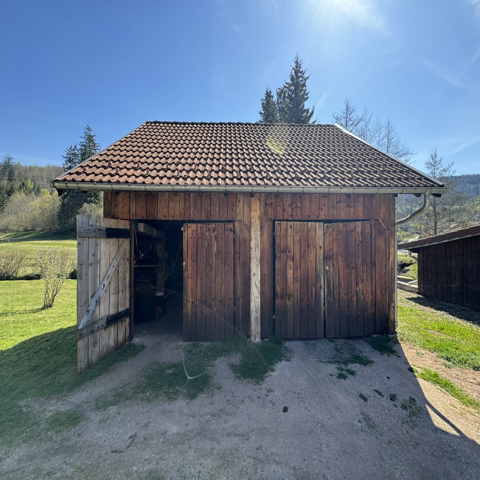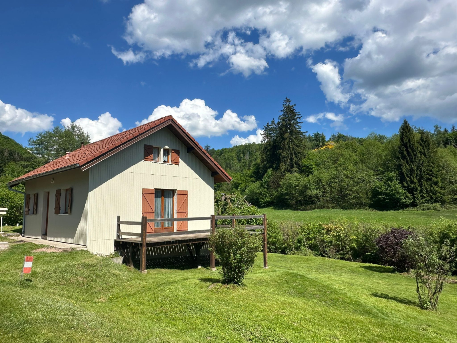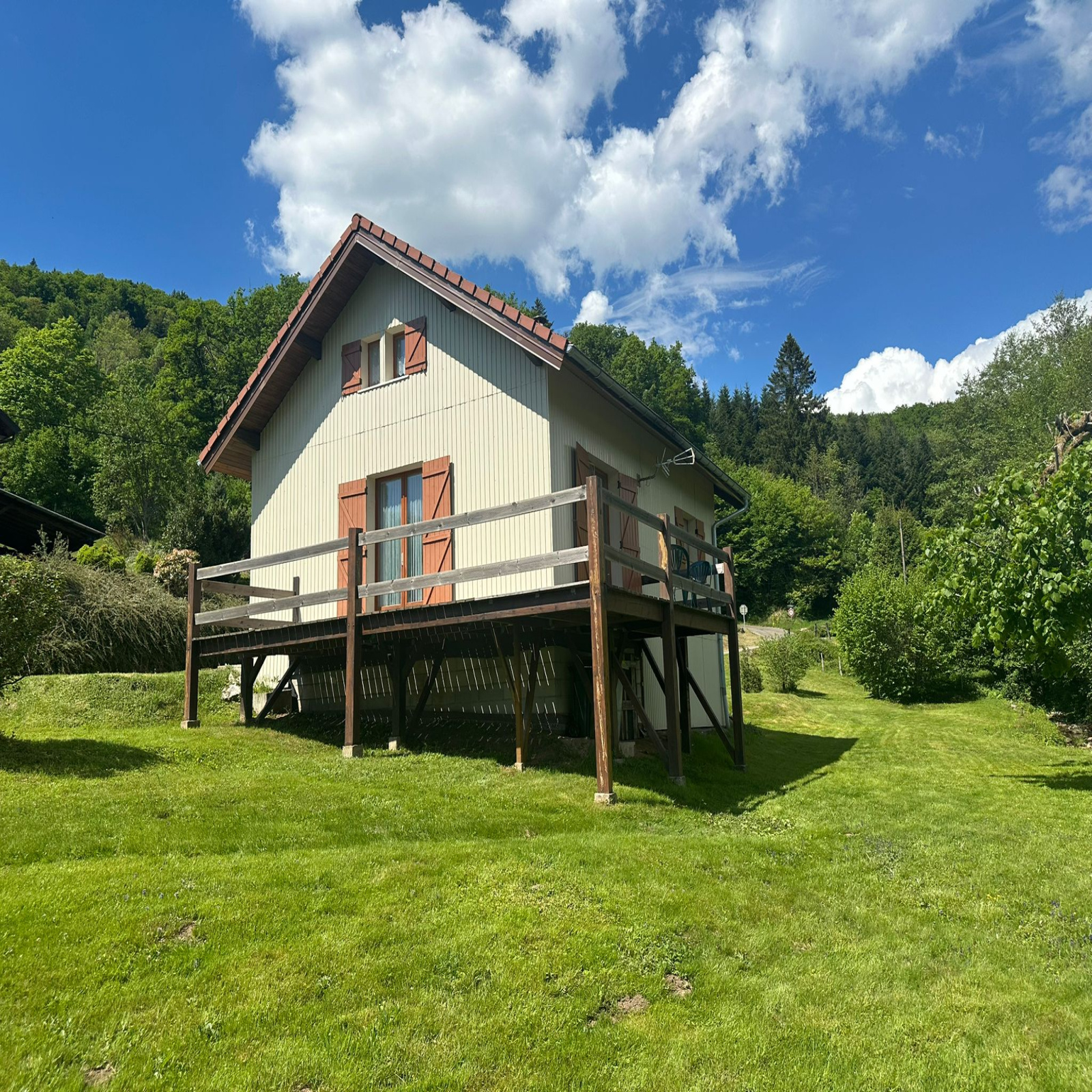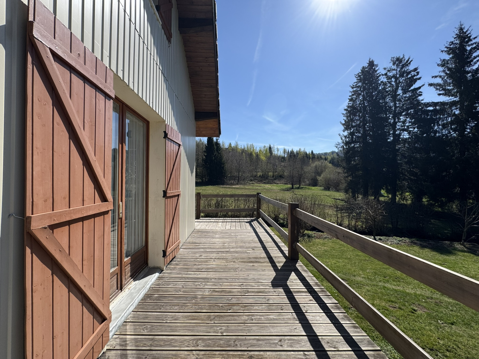 Au rez-de-chaussée : entrée ouverte sur la cuisine/salon avec poêle à bois, accès sur balcon/terrasse avec vue sur un cours d'eau et les montagnes, une chambre, salle d'eau avec wc.