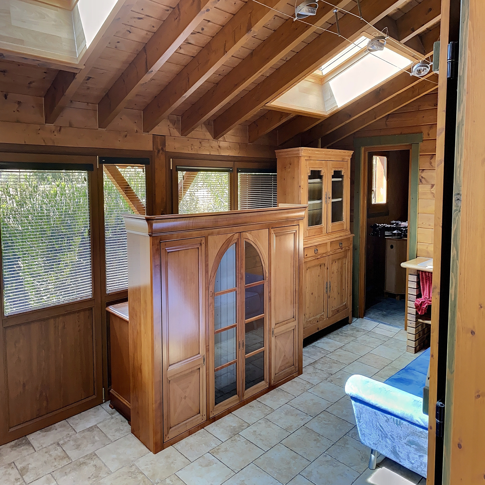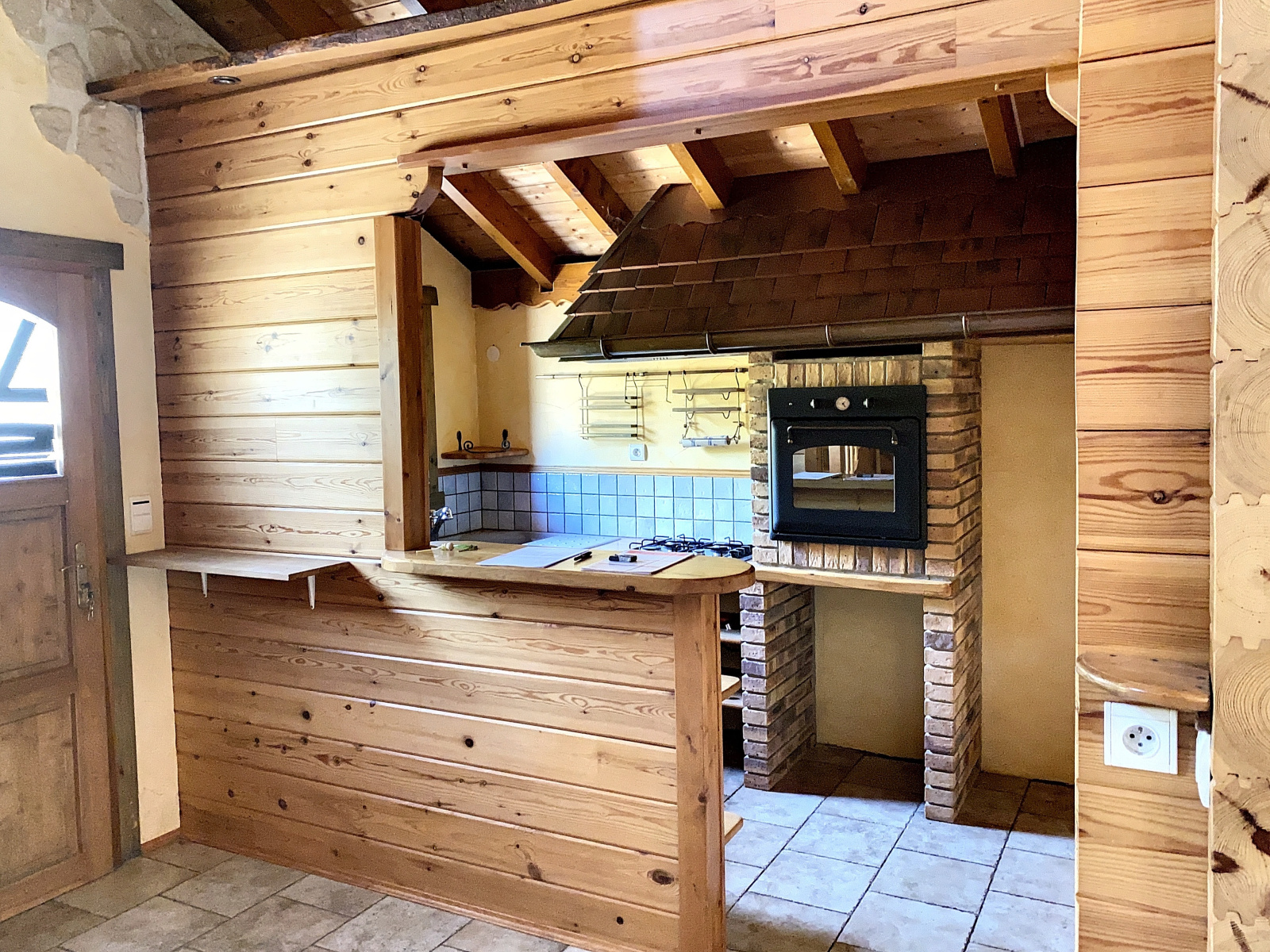 Au rez-de-chaussée : cuisine ouverte sur salon salle à manger avec poêle à bois qui donne accès à une belle véranda avec vue sur la verdure, salle d'eau, wc, 2 chambres.