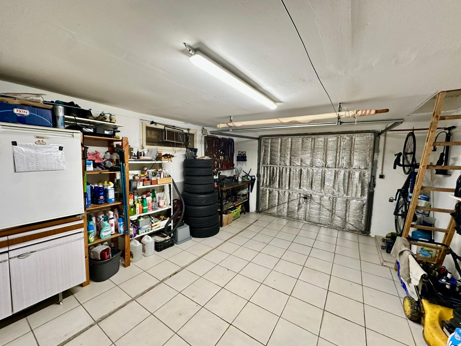Bûcher servant de garage d'appoint fermé et silo à pellets.