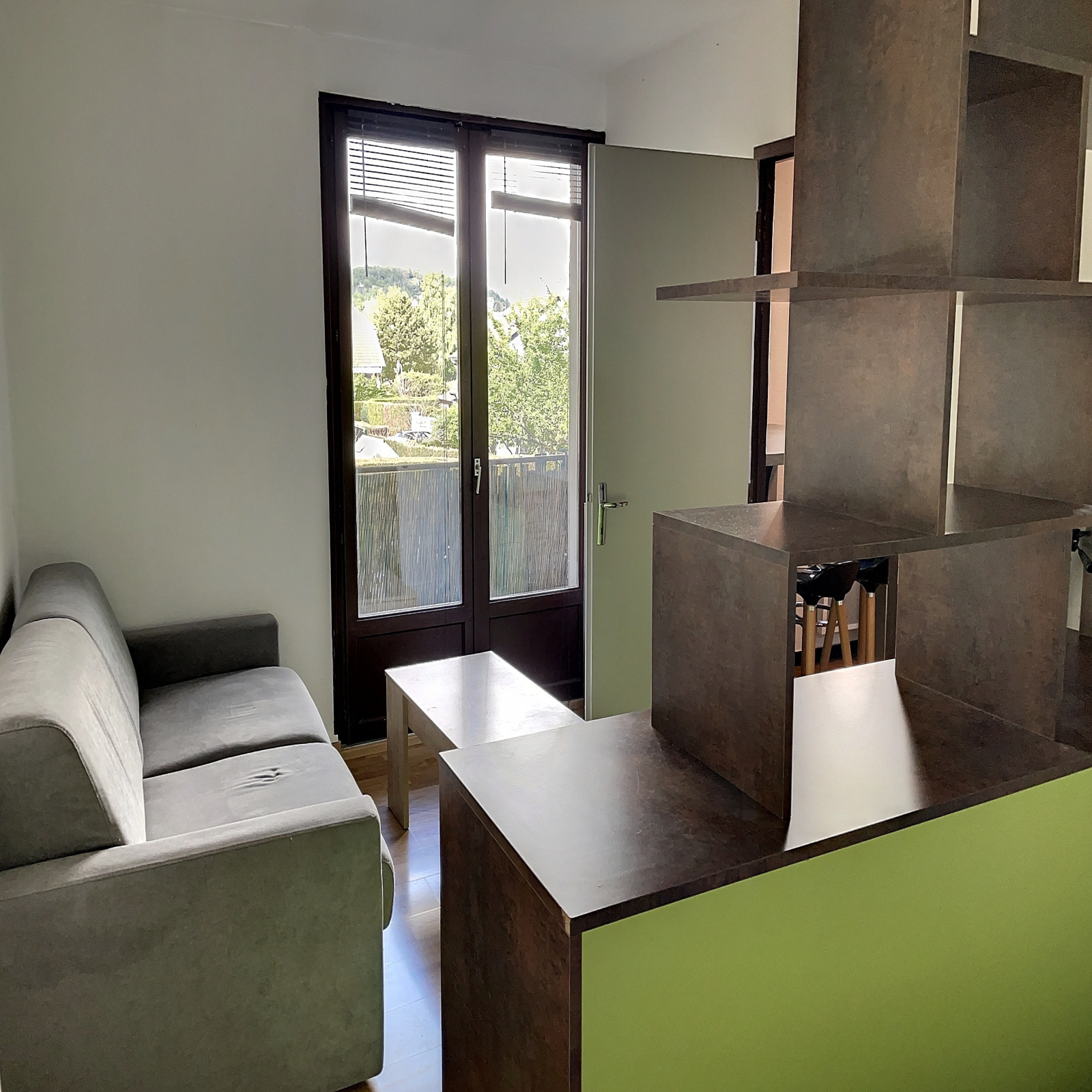 Entrée (2.5 m² env) avec rangement, cuisine équipée (11 m² env) avec table et tabourets, séjour / chambre (13 m² env) avec accès balcon (3.7 m² env), salle d'eau/wc (4.5 m² env).