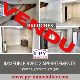 Le 1er logement (58 m² env) se compose d'une entrée, séjour (18 m² env), cuisine (8 m² env), wc avec lave-mains au rez-de-chausée; 2 chambres (12 et 16 m² env), salle de bains (6 m² env), cellier (3 m² env) à l'étage.