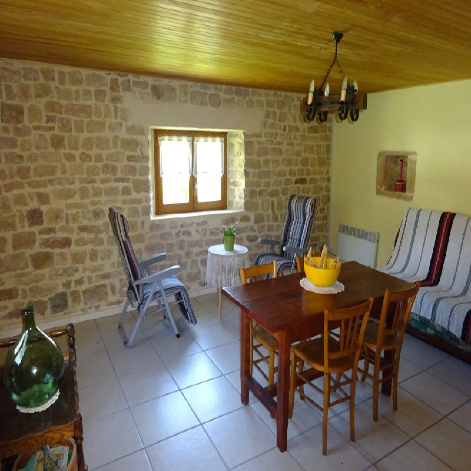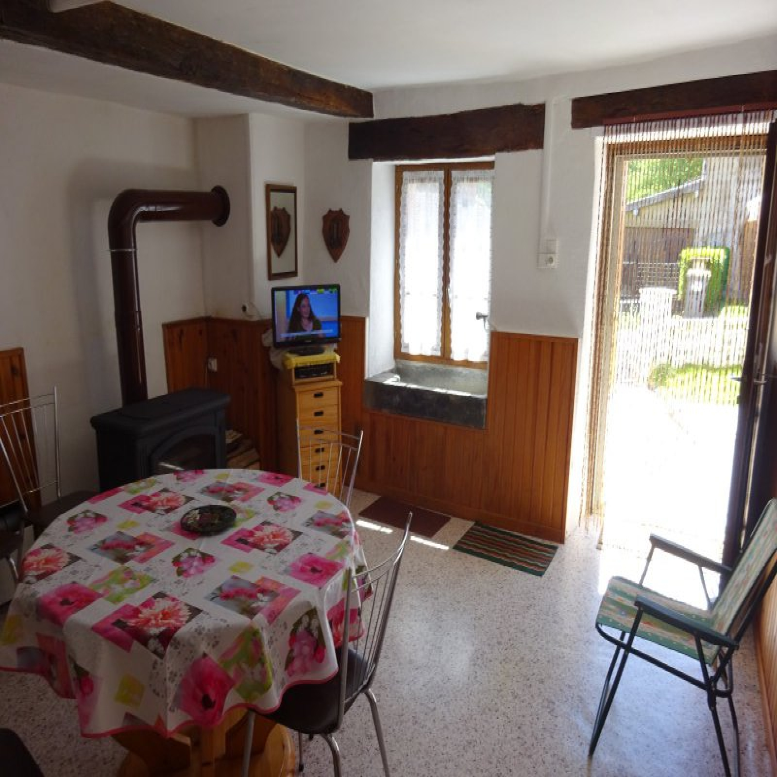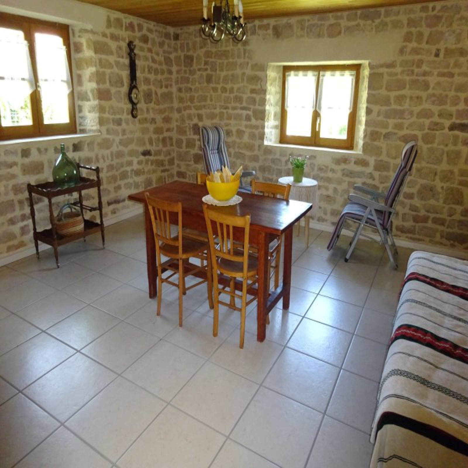 Au rez-de-chaussée : entrée avec grande baie / petit salon, petite cuisine, salle à manger avec ancien évier en pierre, salon, 2 chambres, salle d'eau / wc.