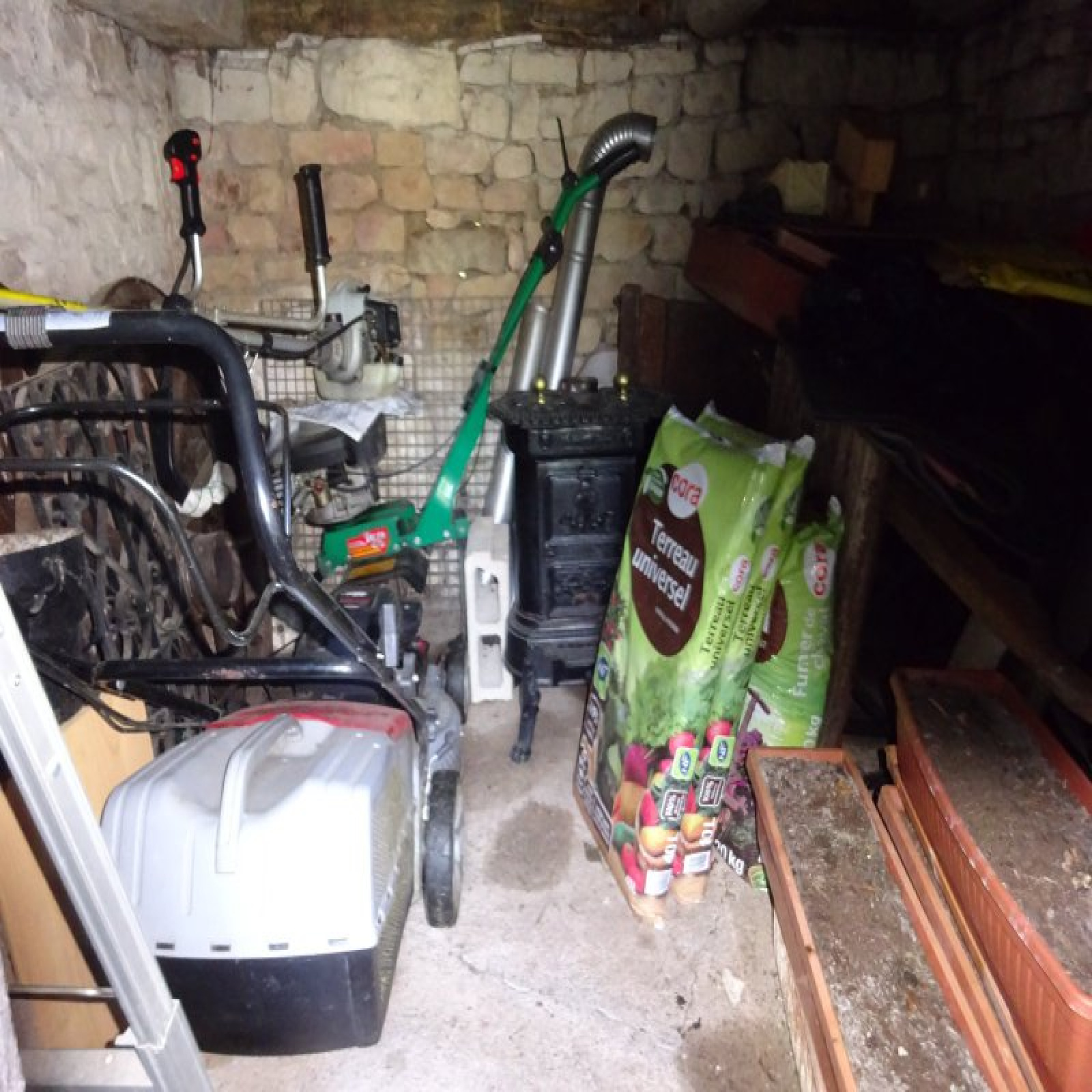 A l'étage : grenier aménageable. Bûcher / atelier, ancienne hutte à cochon, cave.