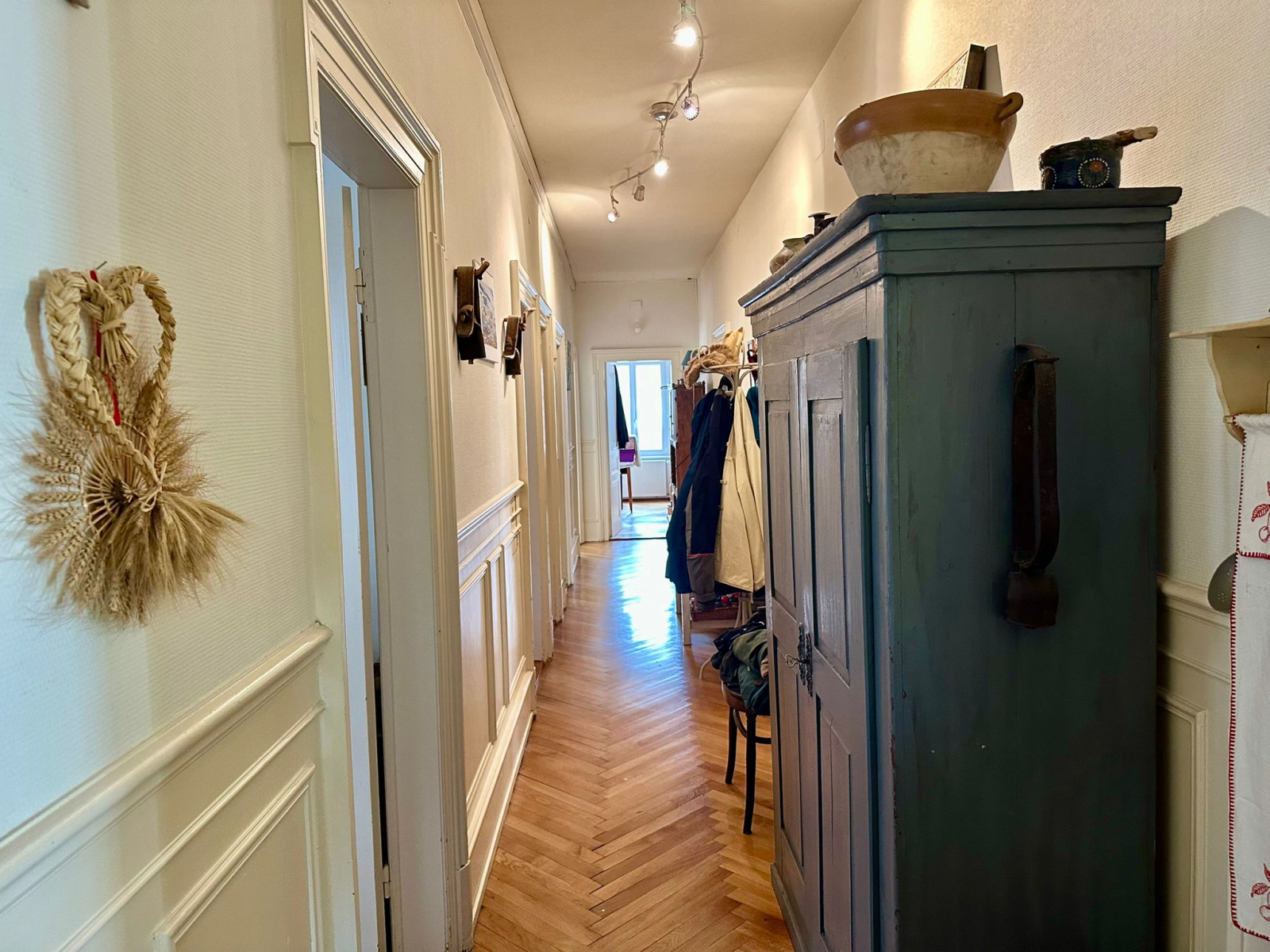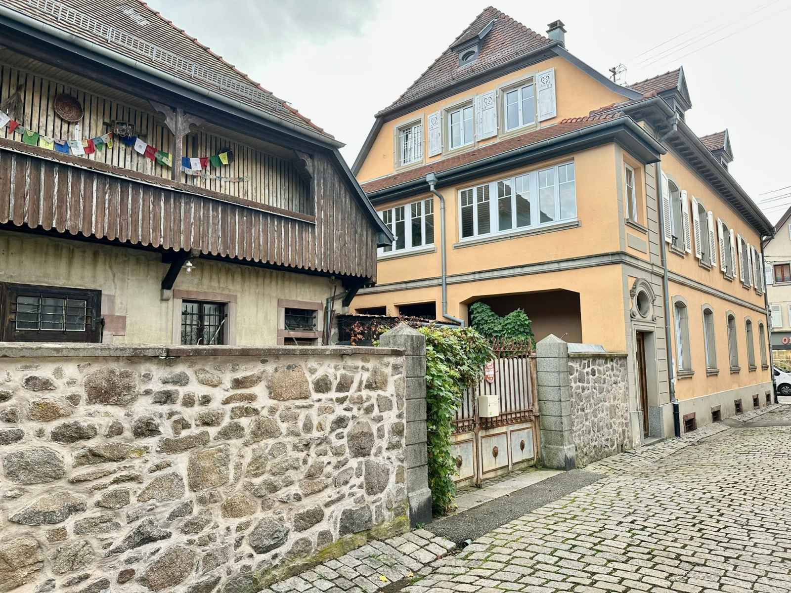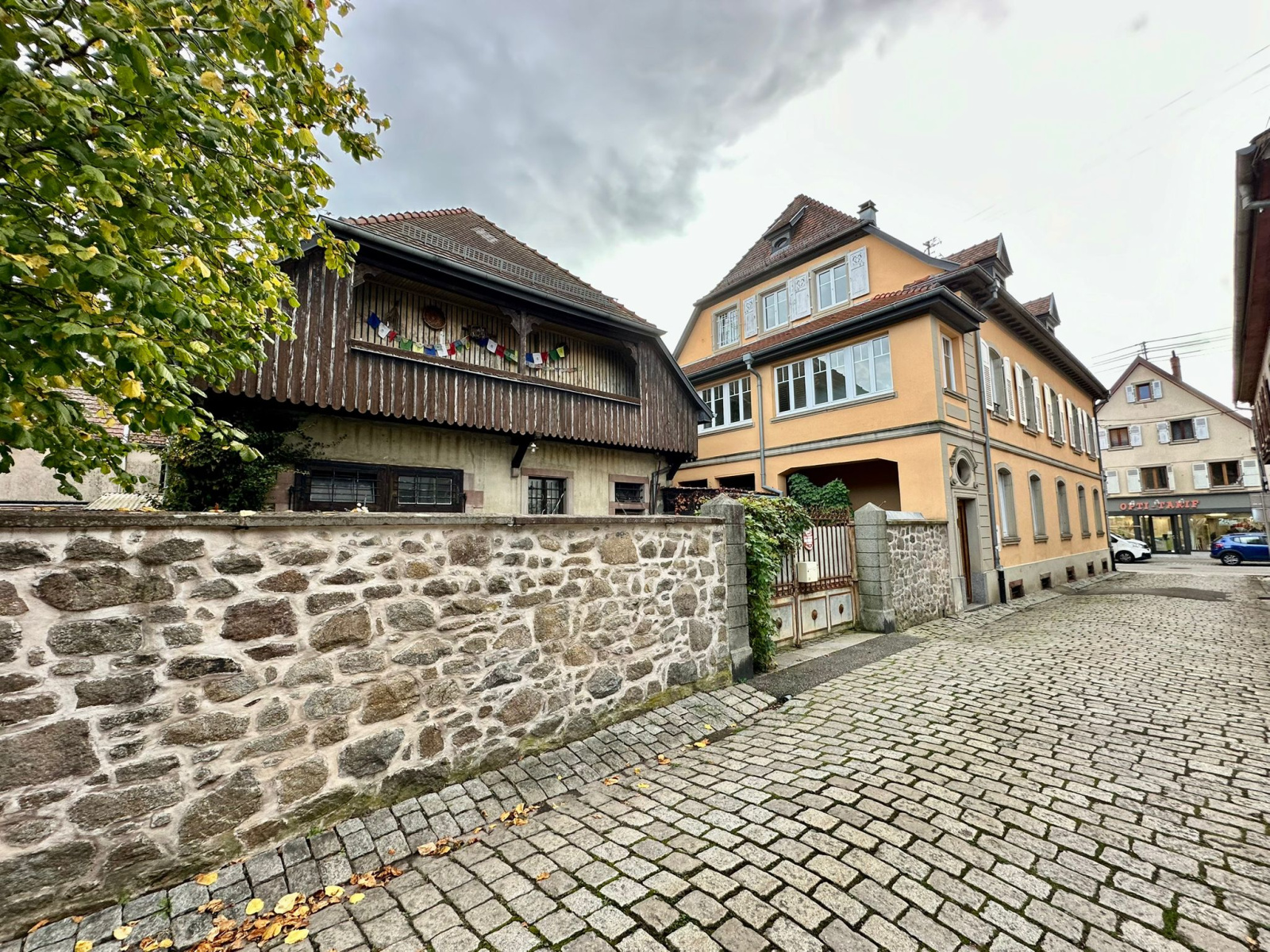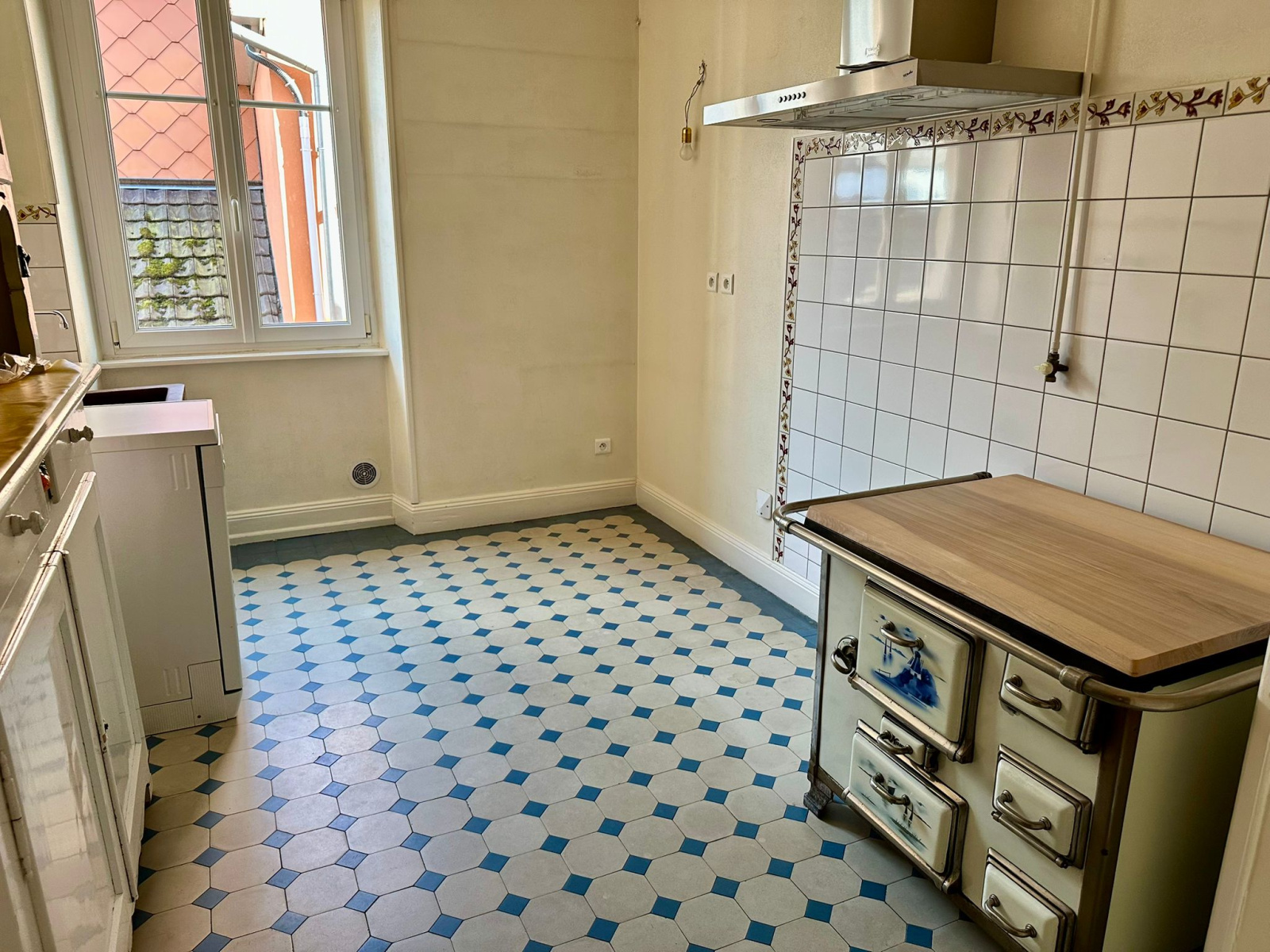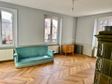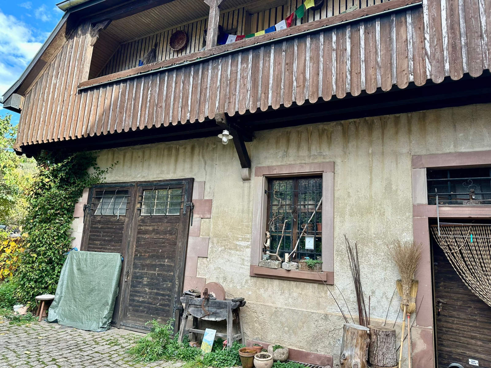 Au premier étage, le même agencement se poursuit avec quatre chambres, une salle de bain avec WC, une cuisine avec ancien évier en grès des Vosges et deux grandes pièces à vivre, une véranda.