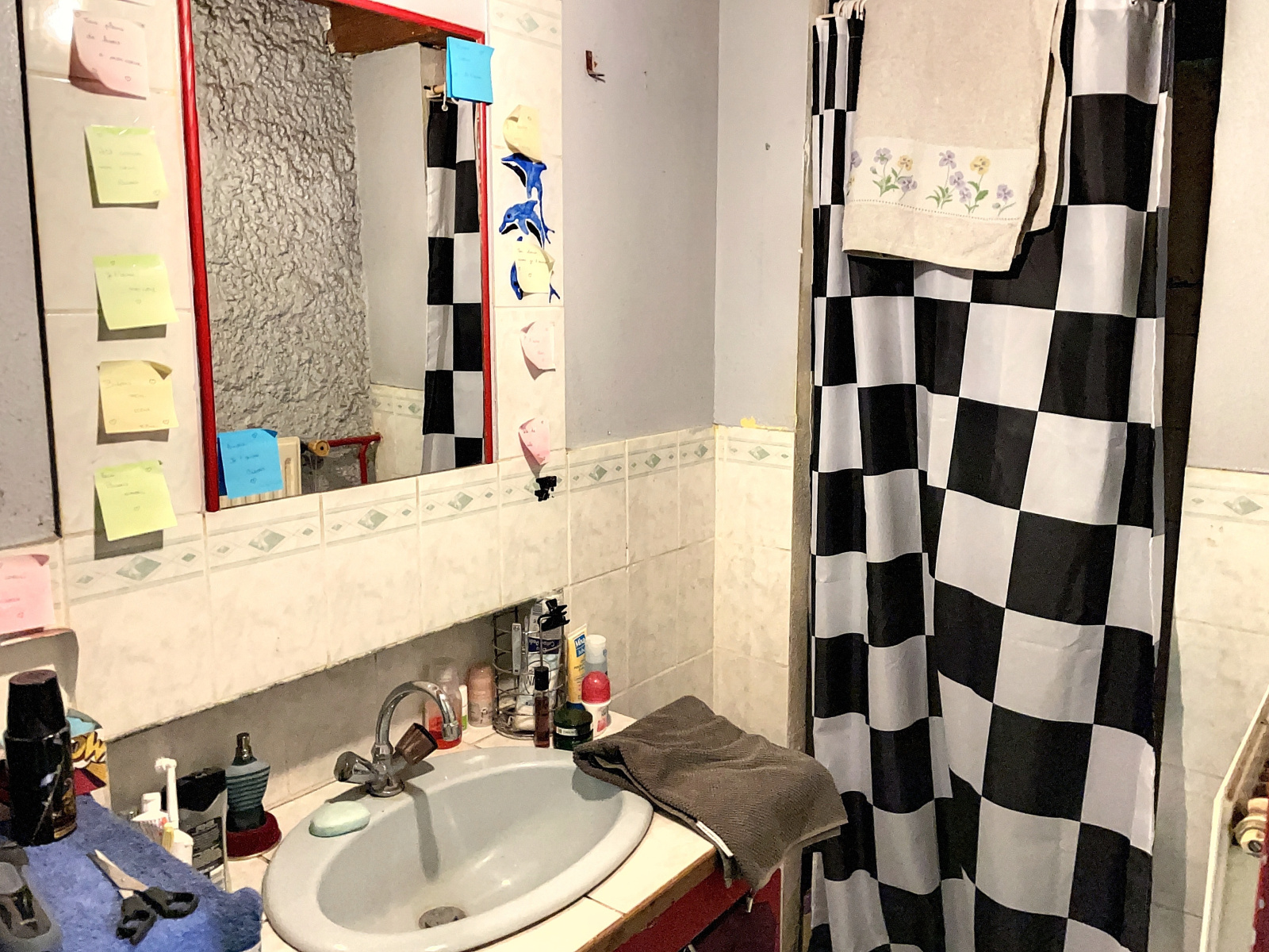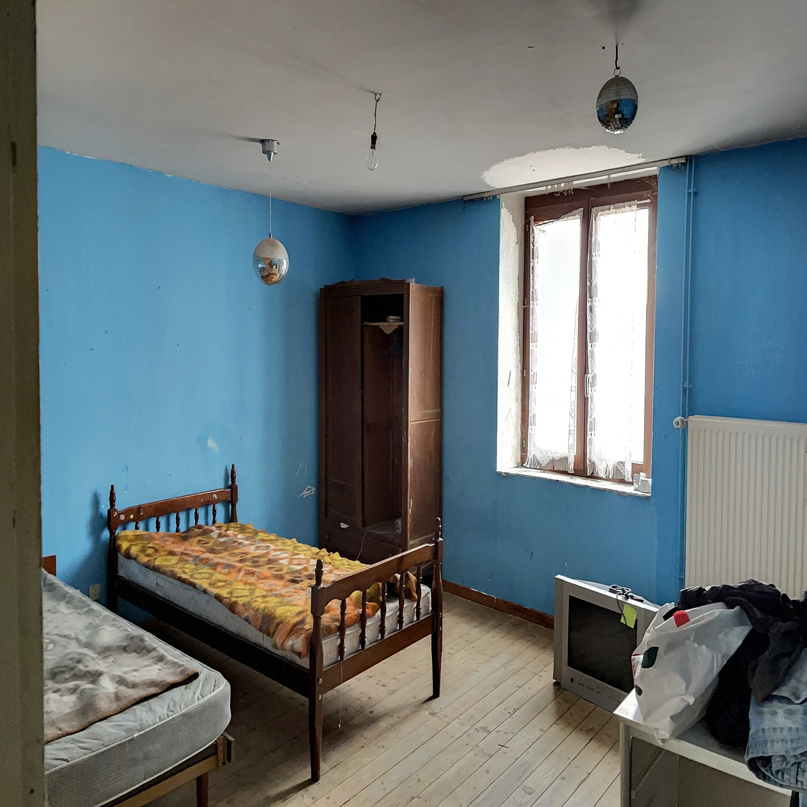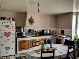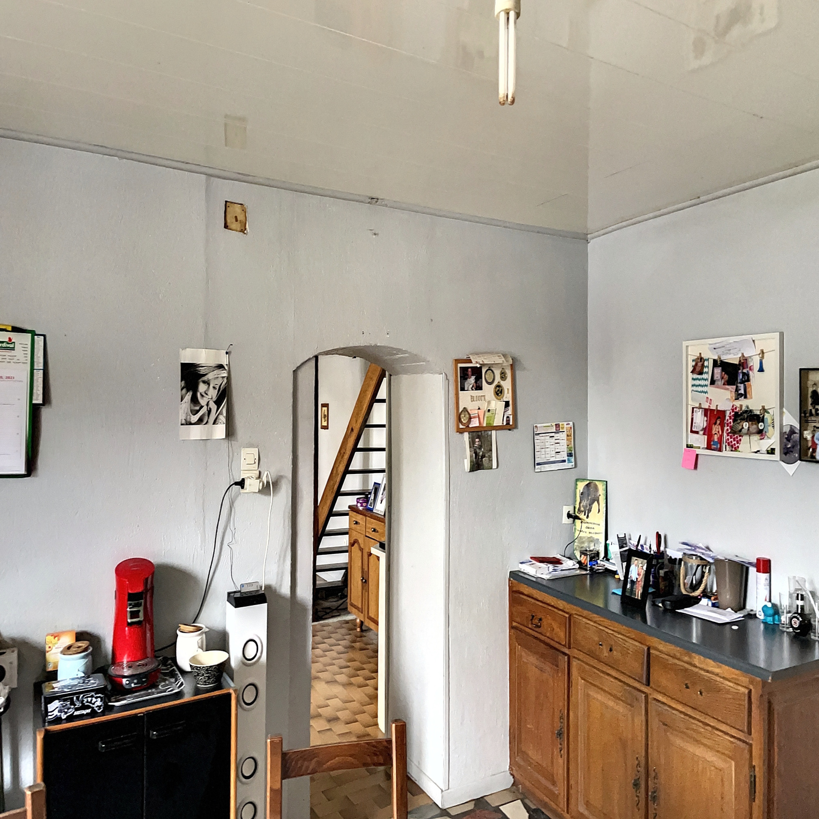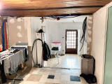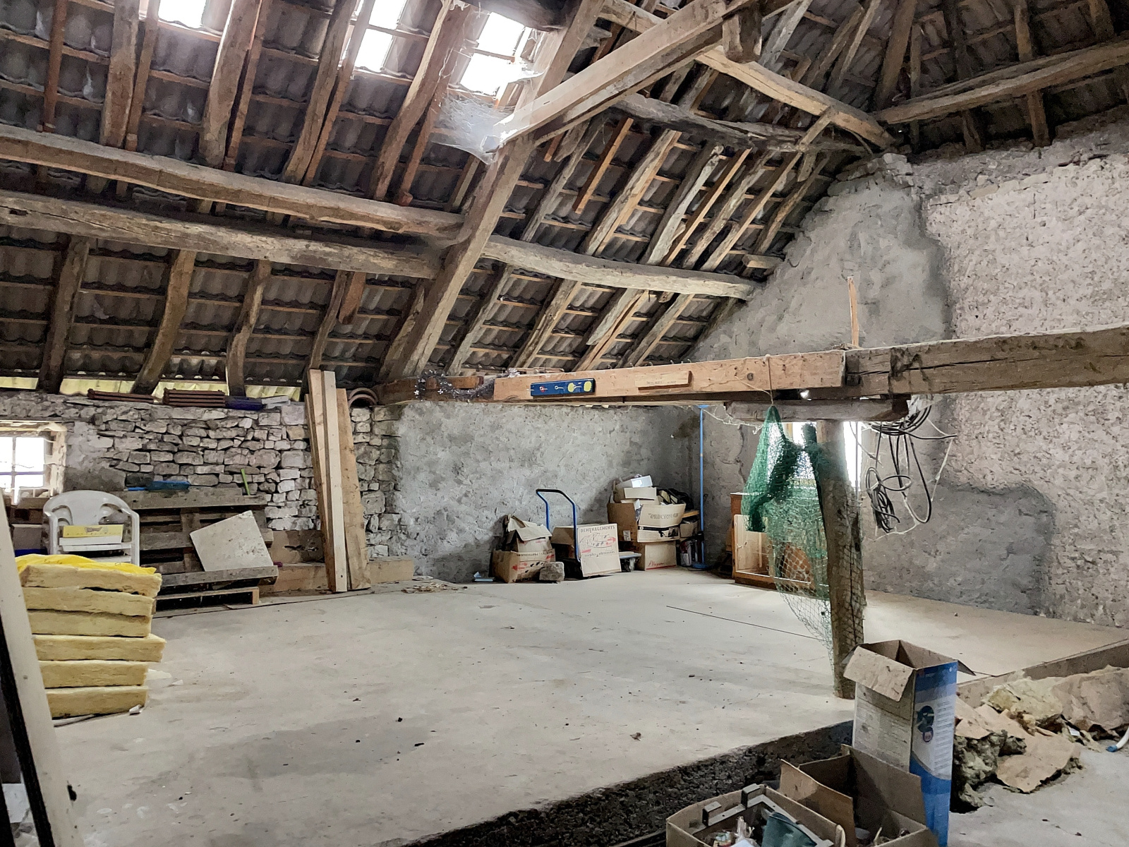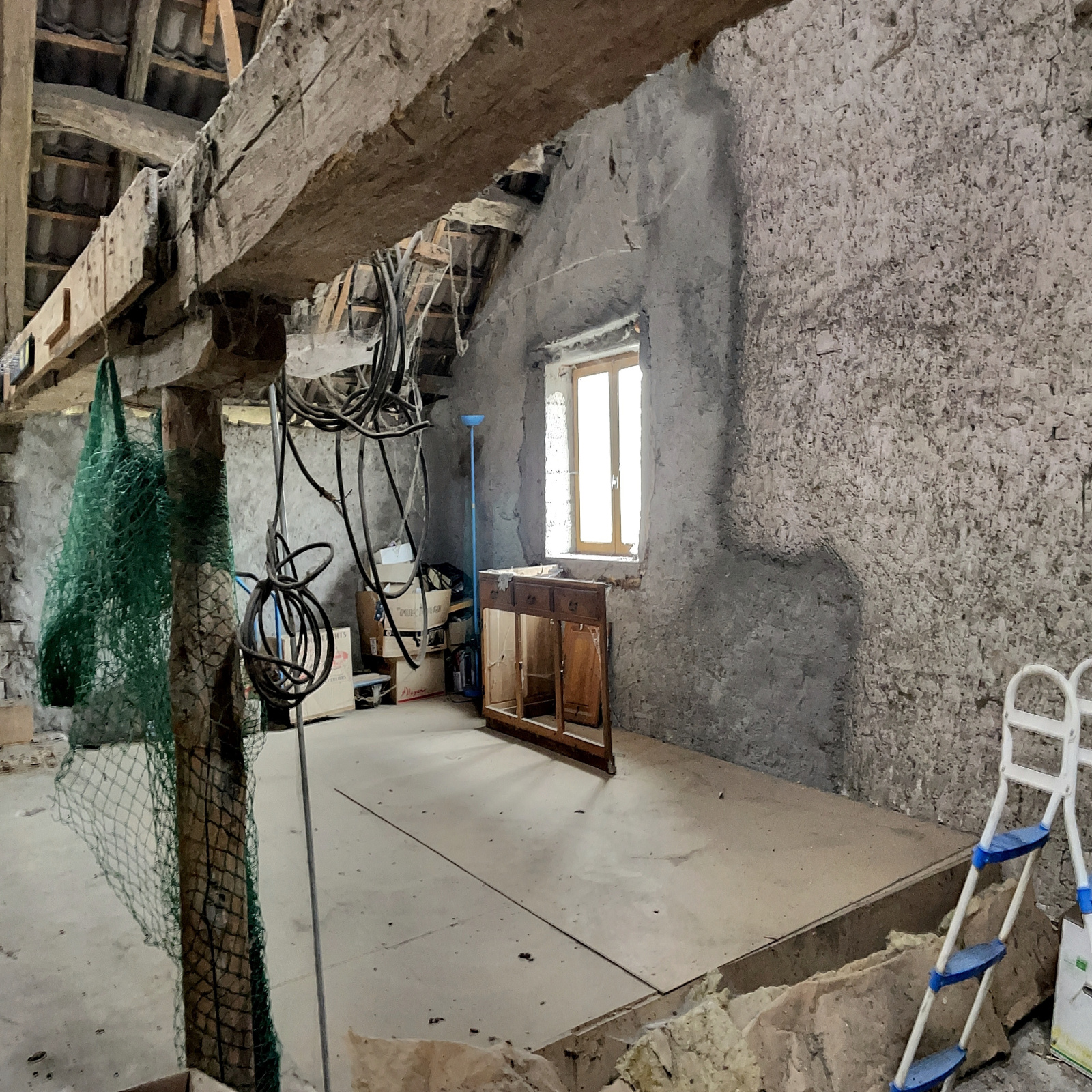 Au rez-de-chaussée : entrée (8.5 m² env) ouverte sur coin bureau (15 m² env), cuisine équipée (21 m² env), salle à manger / salon (22 m² env) avec cheminée en pierre, salle d'eau avec toilettes, salle de bains à terminer (4 m² env).