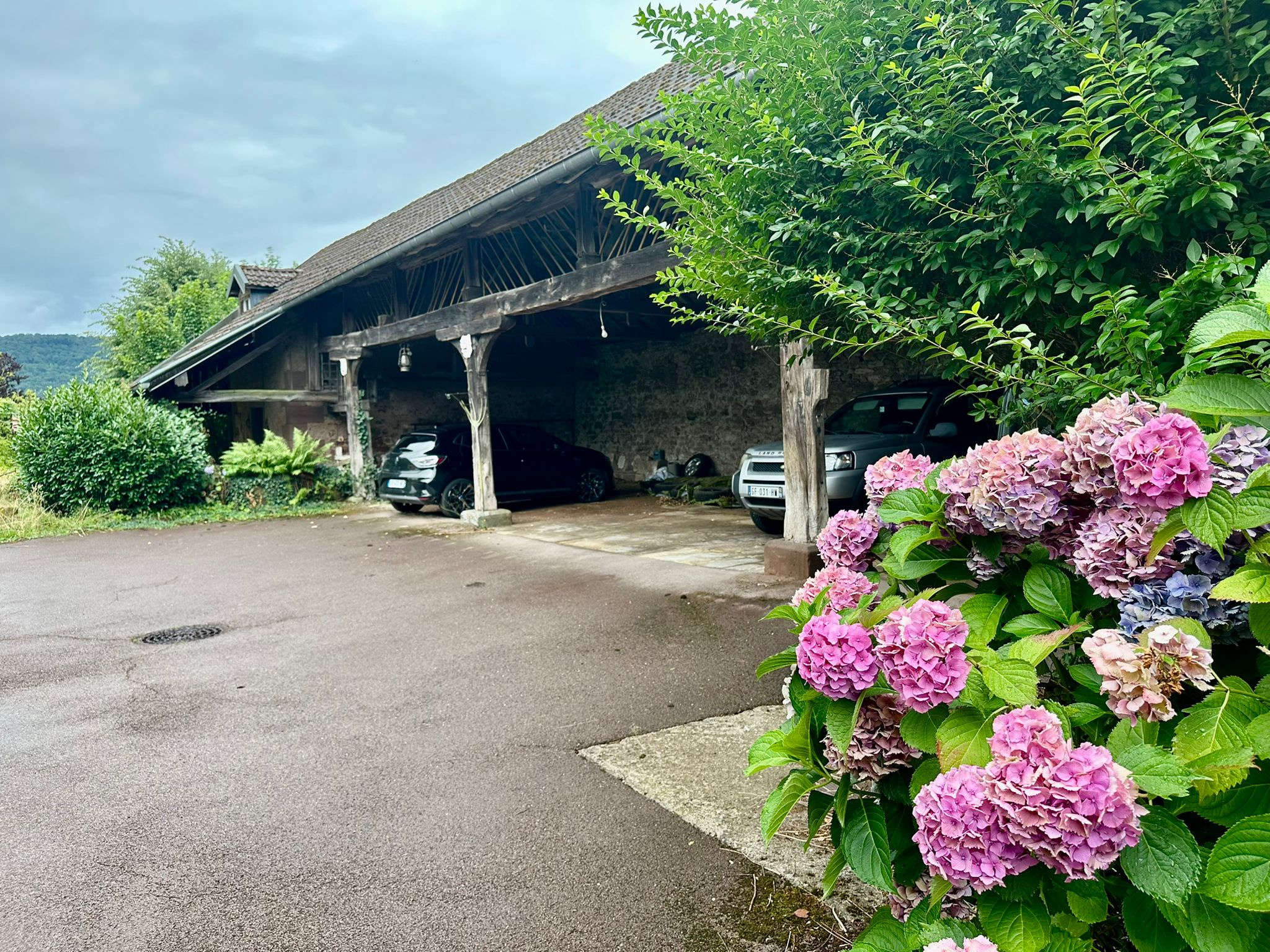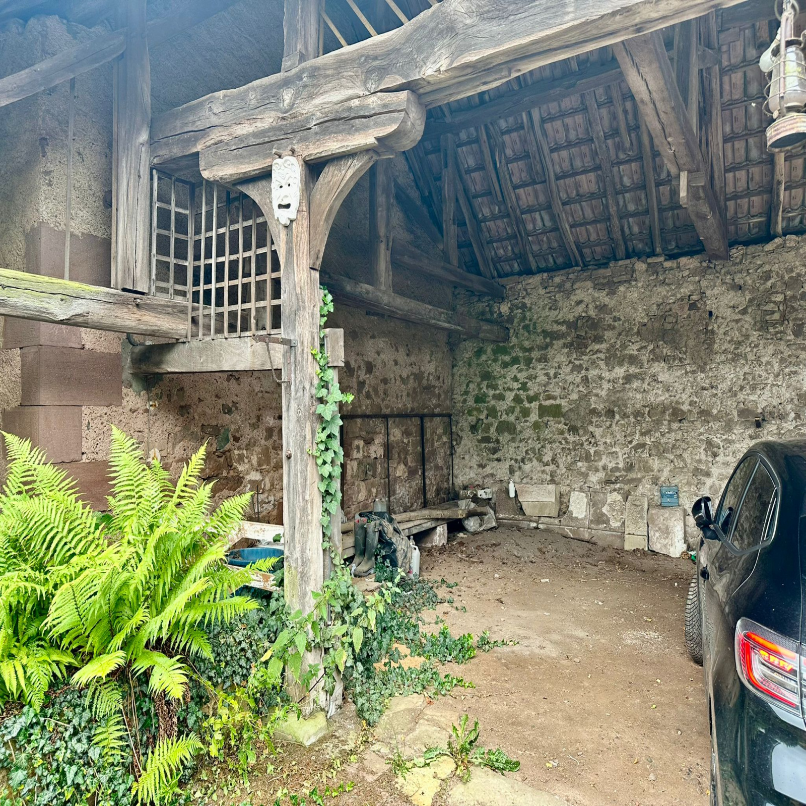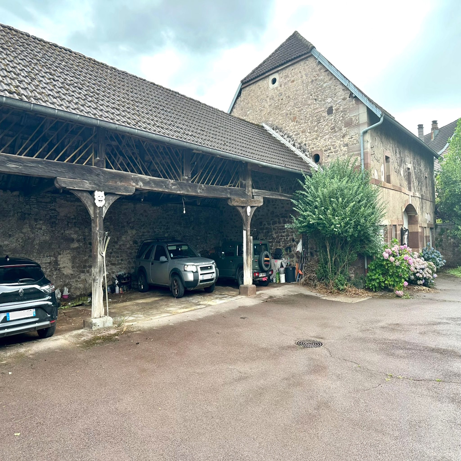 Grange avec 2 écuries. Appentis fermé pouvant accueillir 5 véhicules côte à côte.