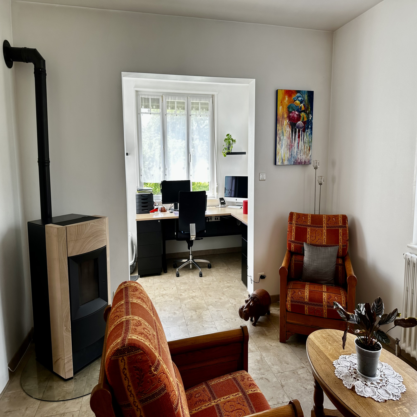 Au rez-de-chaussée : entrée dans véranda (17 m2 env), cuisine équipée (15 m2 env), une pièce (14 m2 env), salon/séjour (36 m2 env) avec poêle à pellets, salle d'eau avec w.c. (7 m2 env)